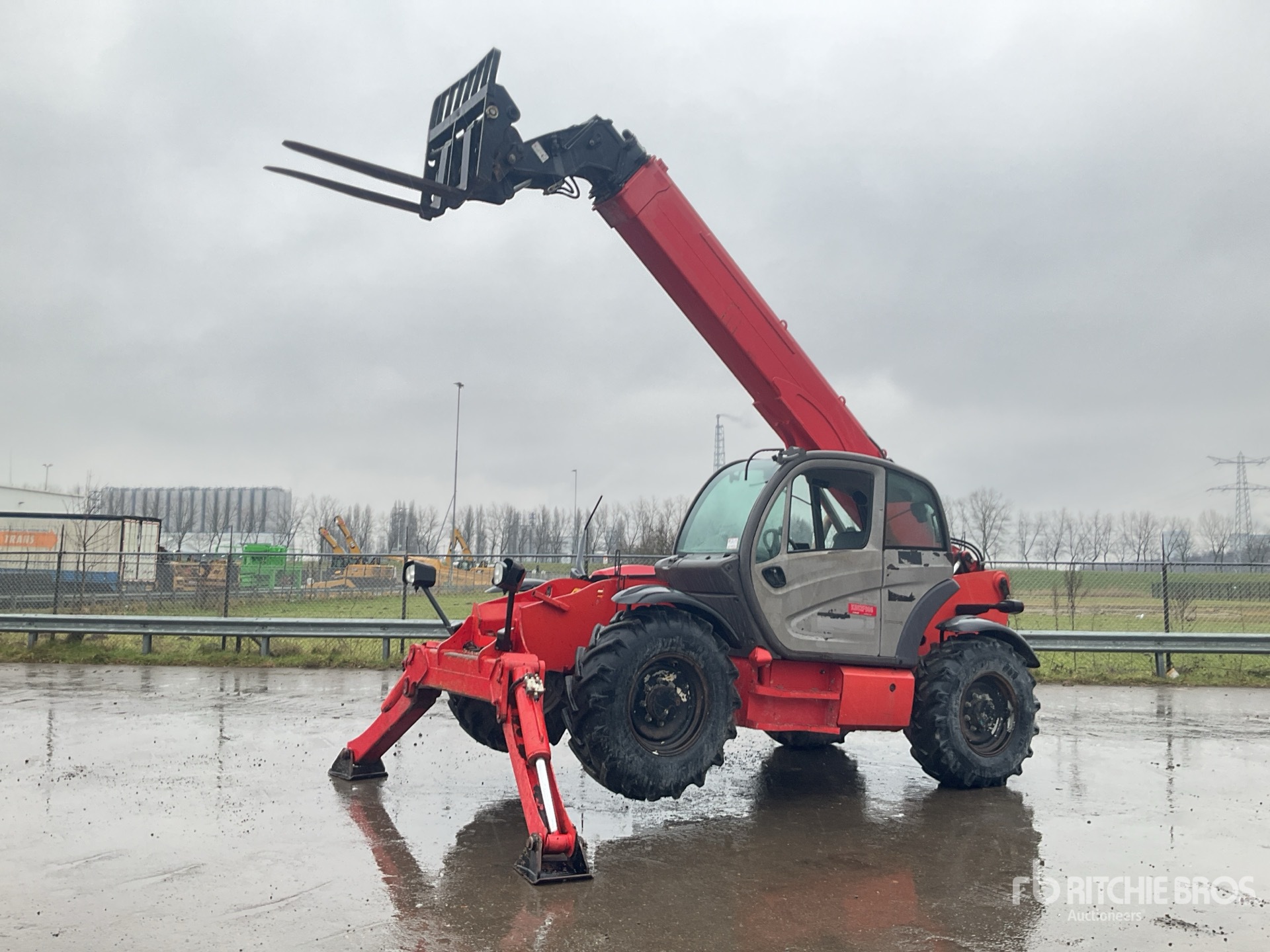 Enclosed Cab, Load Moment Indicator, Forks, Outriggers, Auxiliary Hydraulic Plumbing, 15.5/80-24 Tires
