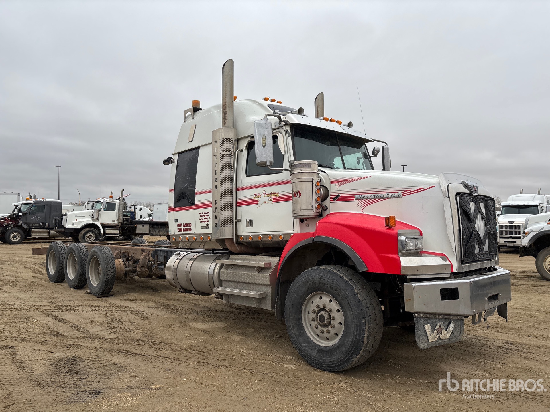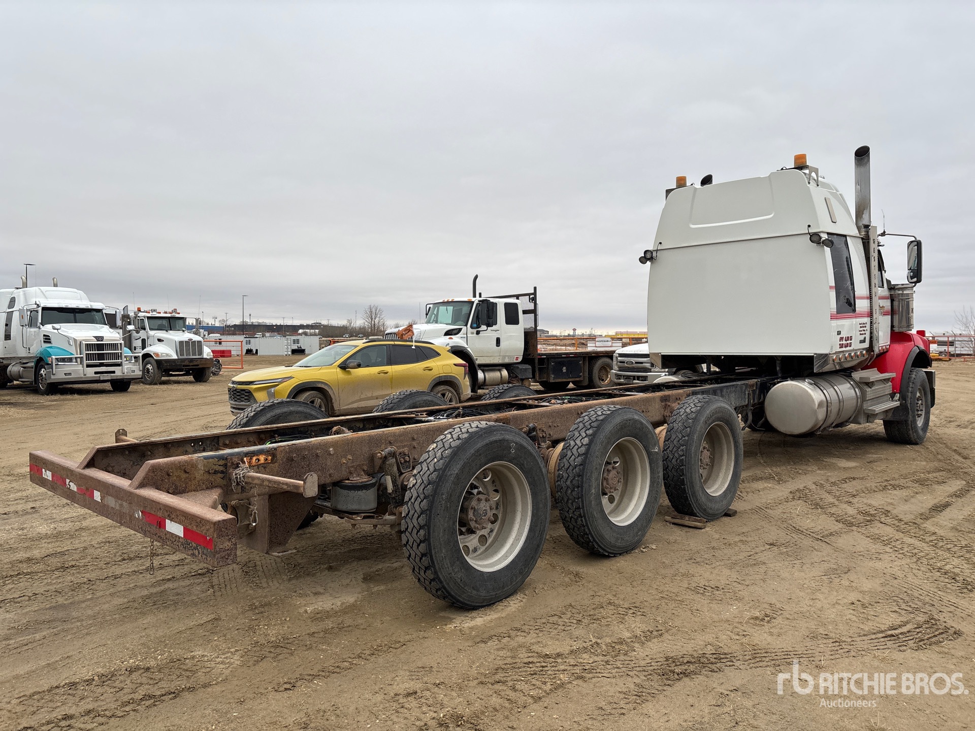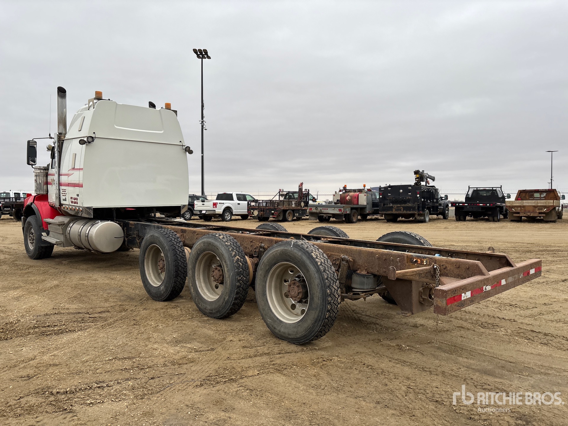 20000 lb Front Axle, 50850 lb Rears, Meritor RZ-166 Drive Axles, 4.10:1 Axle Ratio, 70850 lb GVWR, 54 in Mid Roof Sleeper Cab, Aluminum Outer Wheels, 445/65R22.5 Front Tires, 11R24.5 Rear Tires, Dual Steering Boxes, Double Frame, Airliner Air Ride Suspension, 304 in Wheelbase, 171 in Cab to Axle, 300 in Cab to End of Frame