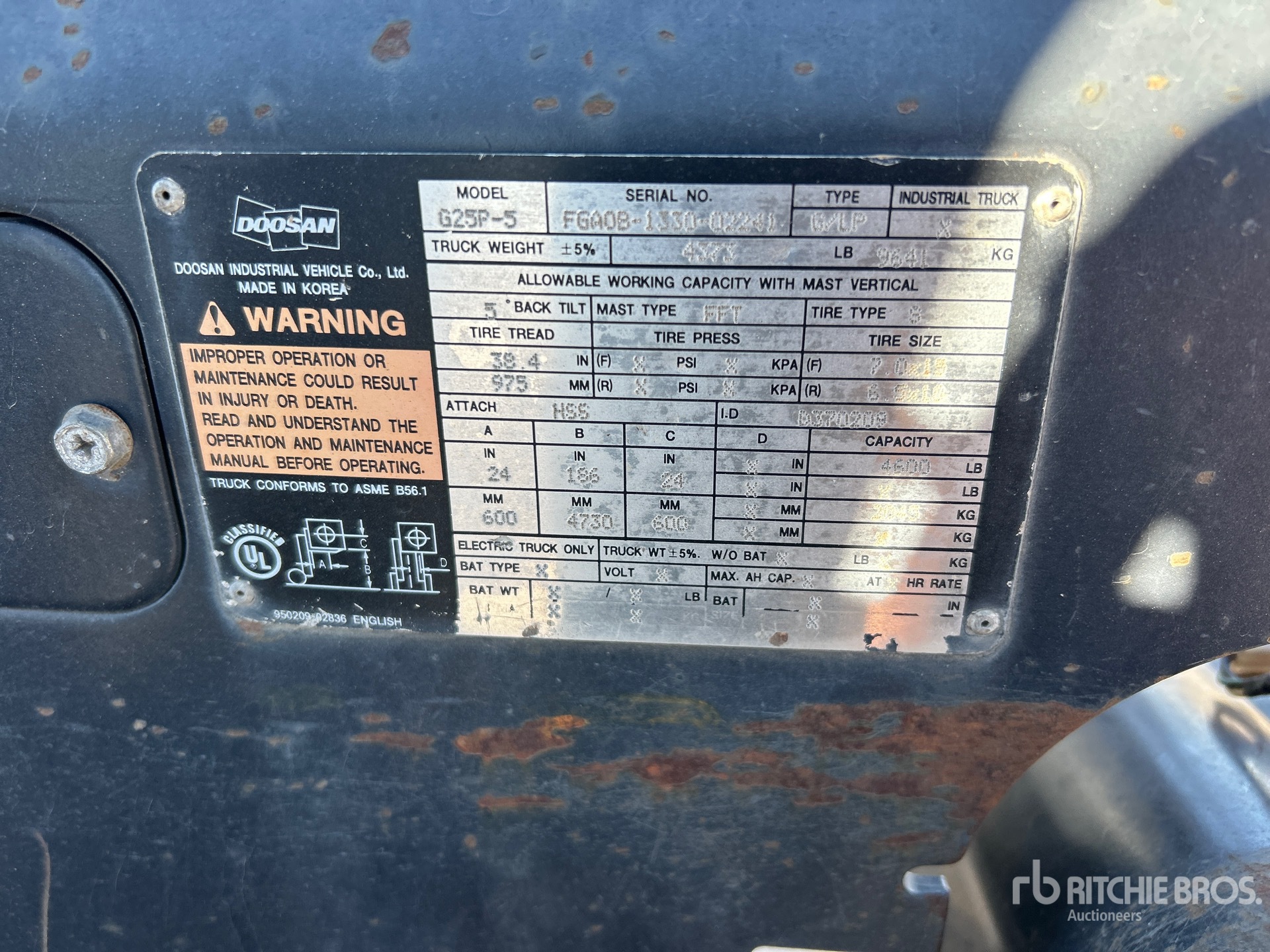The detailed equipment information is limited in scope, and Ritchie Bros. Auctioneers has not inspected any aspects or components of the equipment other than those expressly set forth herein. Unless expressly stated, we make no representations or warranties, express or implied, concerning the equipment or its components, including without limitation any representations or warranties concerning functionality, conformity or compliance with any safety standard or requirement of any applicable authority or regulatory body, fitness for any particular purpose, or merchantability. You are strongly advised to perform your own detailed inspection of the equipment prior to bidding.
