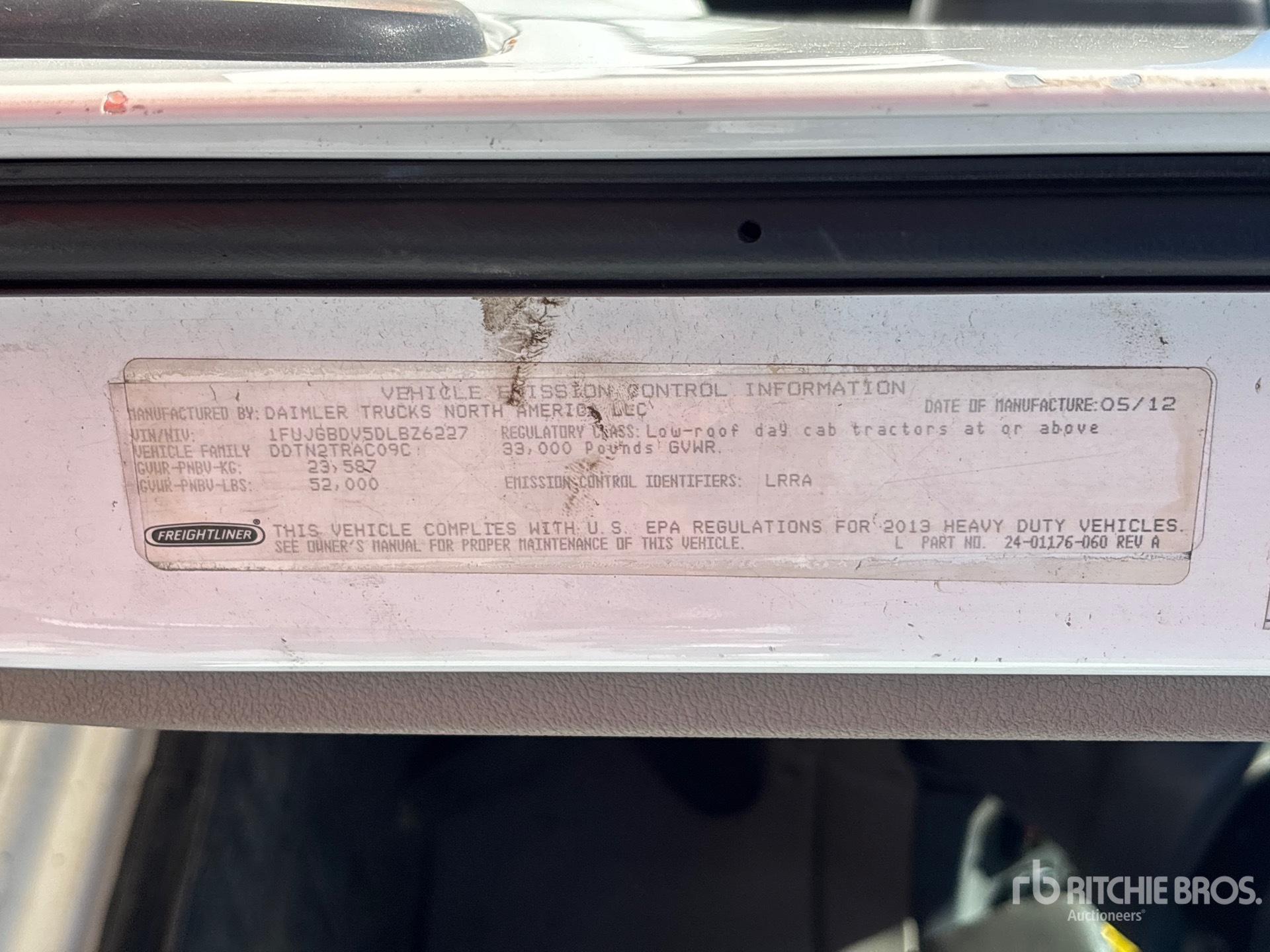 Detroit DD13 Engine, 2012 US EPA Label, 12145.8 Engine hrs, Eaton Fuller FRO-15210C 10-Speed Manual Transmission, 12000 lb Front Axle, 40000 lb Rears, 52000 lb GVWR, Engine Brake, 180 in Wheelbase, 11R22.5 Front Tires, 11R22.5 Rear Tires, Air Sliding 5th Wheel, Dual Fuel Tanks