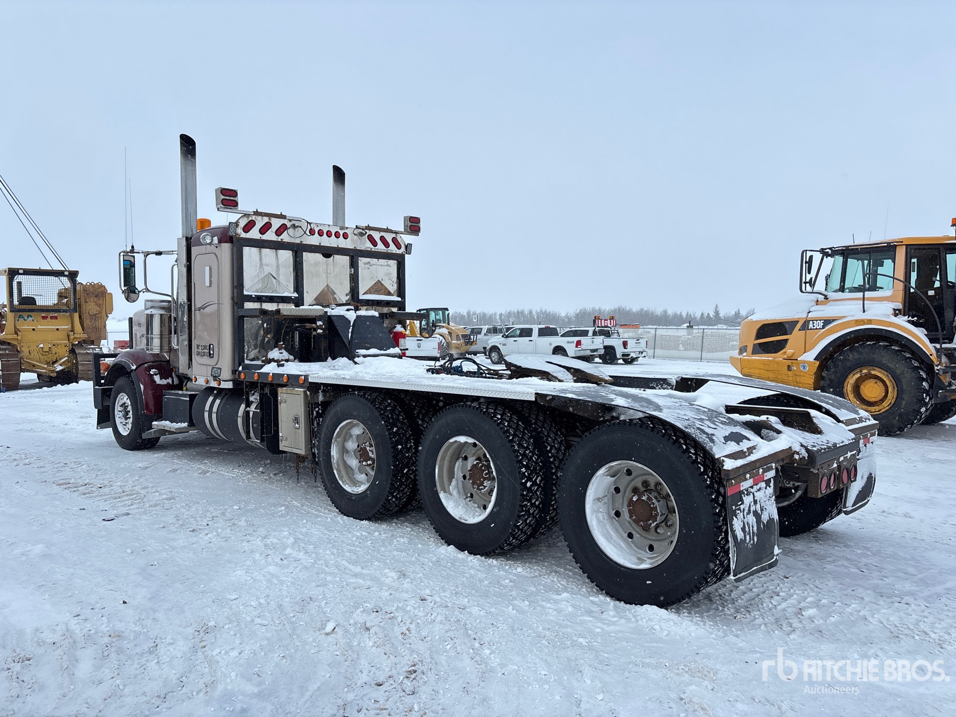 Cat C15 475 hp Engine, 18725 Engine hrs, Eaton Fuller 18-Speed Manual Transmission, 20000 lb Front Axle, 64000 lb Rears, 84000 lb GVWR, Engine Brake, 36 in Flat Top Sleeper Cab, 266 in Wheelbase, Air Suspension, Aluminum Wheels, 385/65R22.5 Front Tires, 11R24.5 Rear Tires, Dual Steering Boxes, Double Frame, Wet Kit, Air Sliding 5th Wheel, Dual Fuel Tanks, Headache Rack, Complete-Retirement-Dispersal-for-Mur-Cal-Services-Ltd