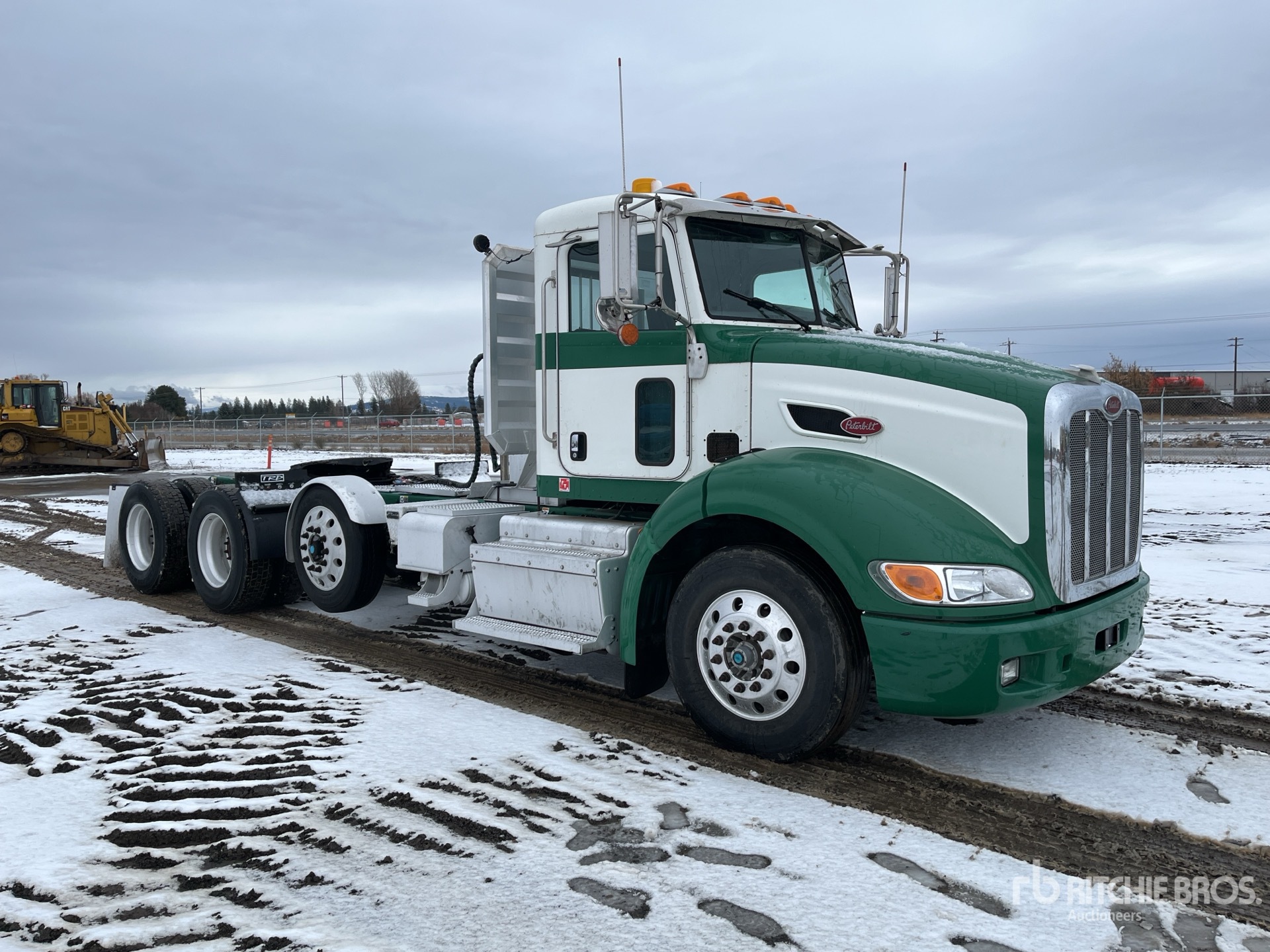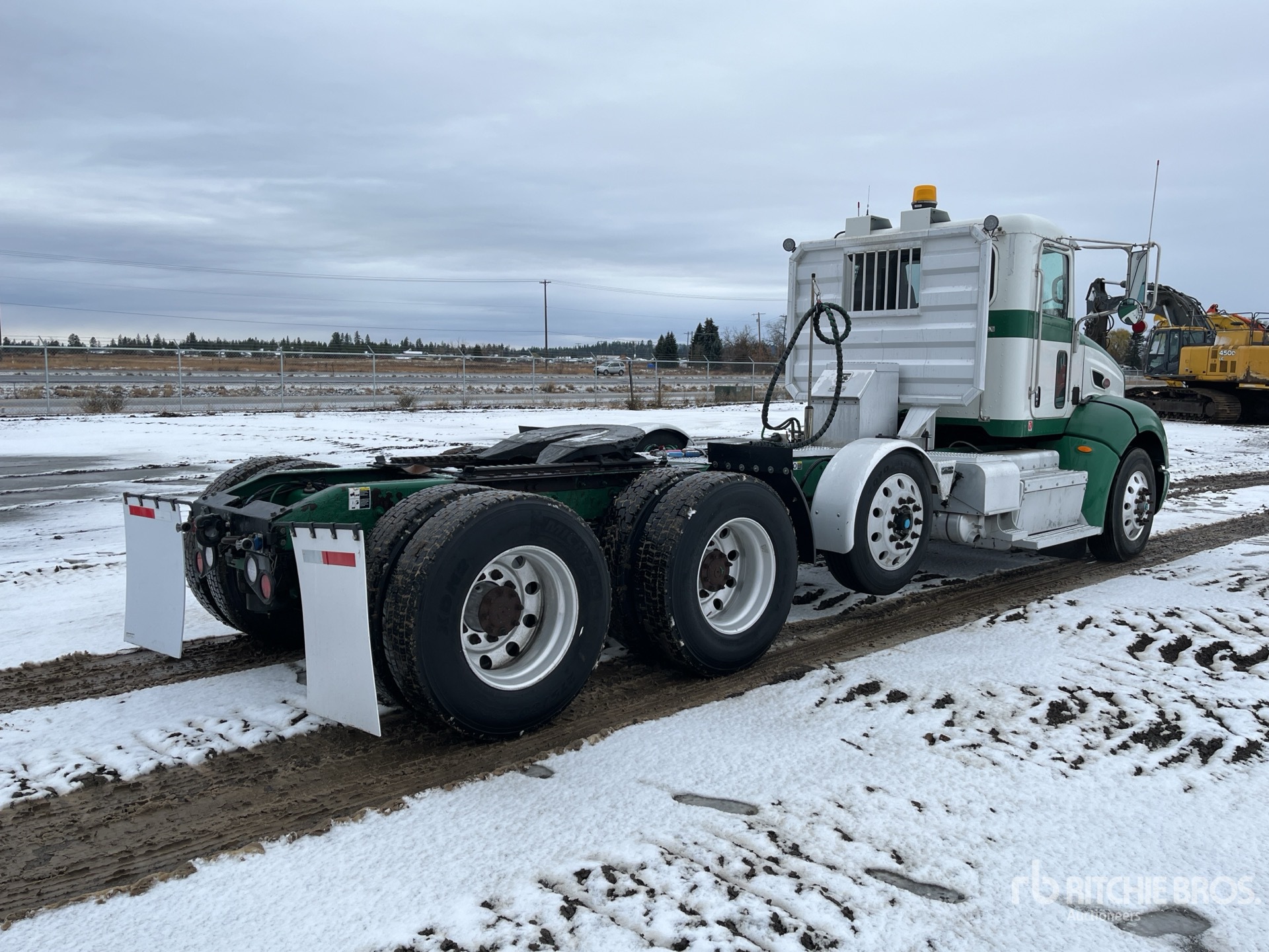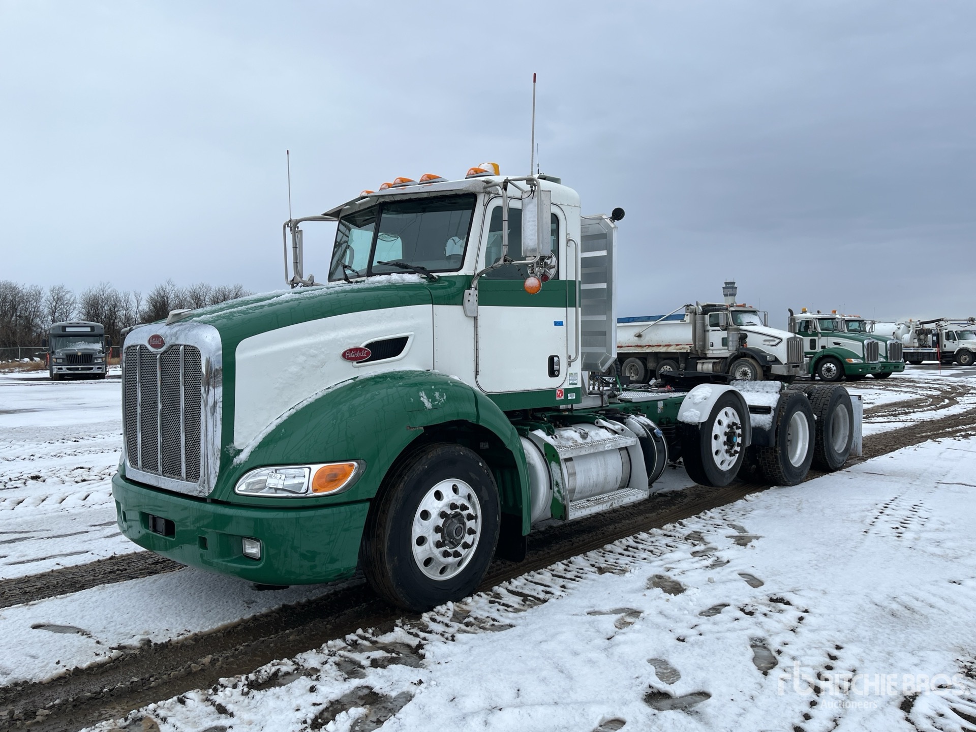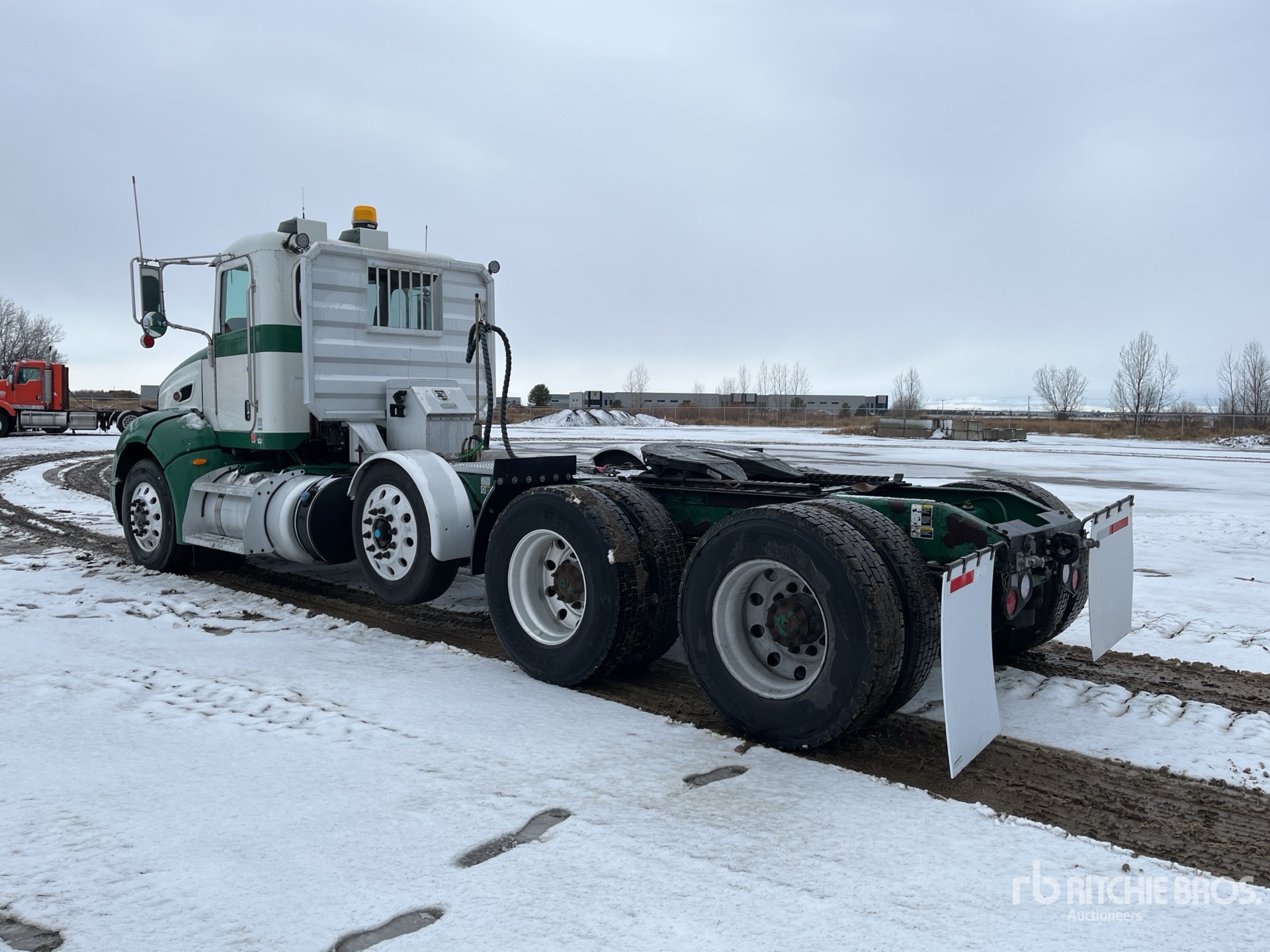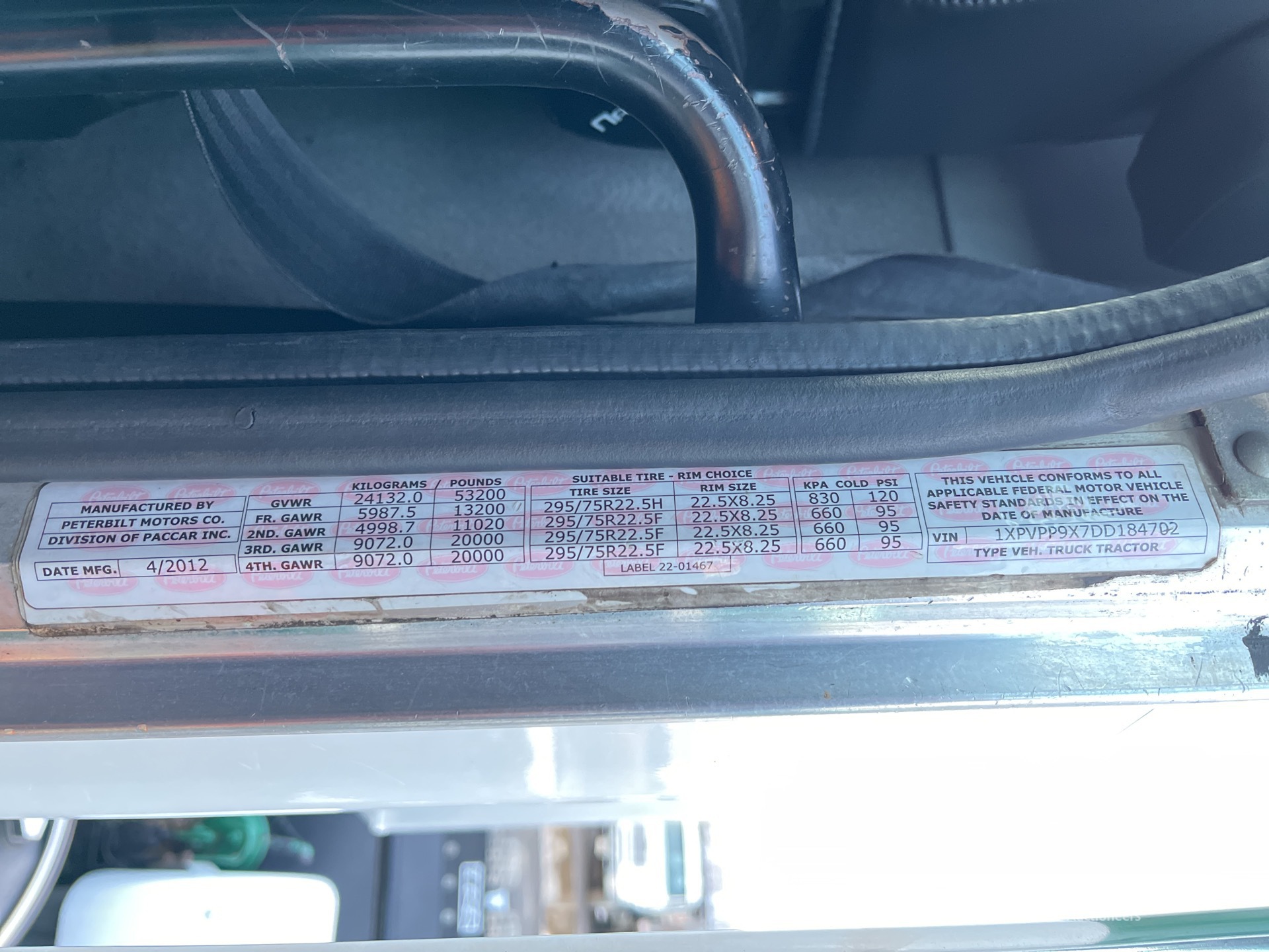 Paccar MX-13 6 Cylinder 12.9 L Diesel 455 hp Engine, 2012 US EPA Label, Requires Diesel Exhaust Fluid, 9187 Engine hrs, Engine Brake, Eaton Fuller 10-Speed Manual Transmission, Differential Lock, 13200 lb Front Axle, 53200 lb GVWR, Air Ride Cab, Aluminum Wheels, 275/80R22.5, Steerable Air Lift Pusher Axle, Low Air Leaf Air Ride Suspension, 230 in Wheelbase, Air Sliding 5th Wheel, Headache Rack, Auto Lube