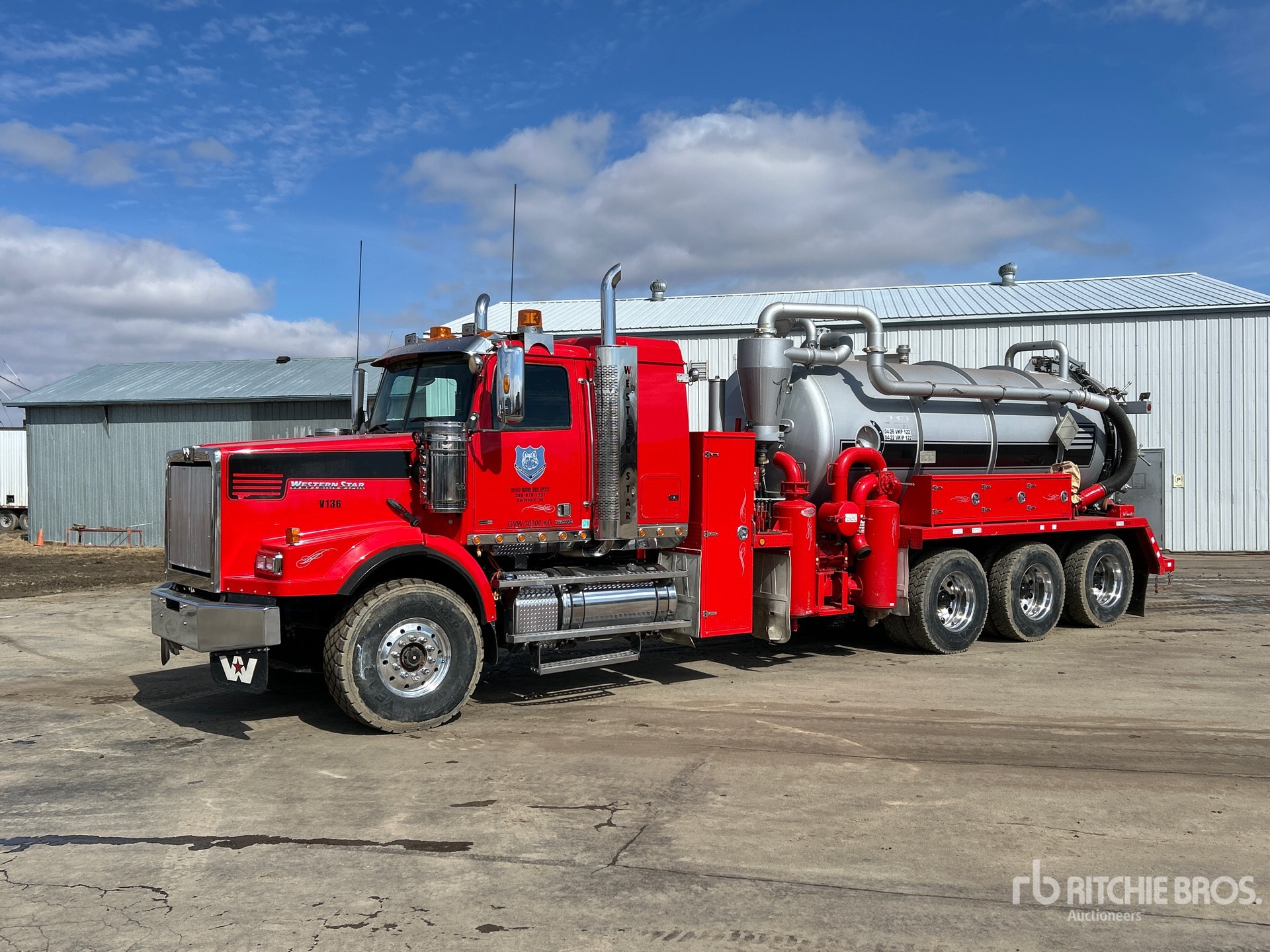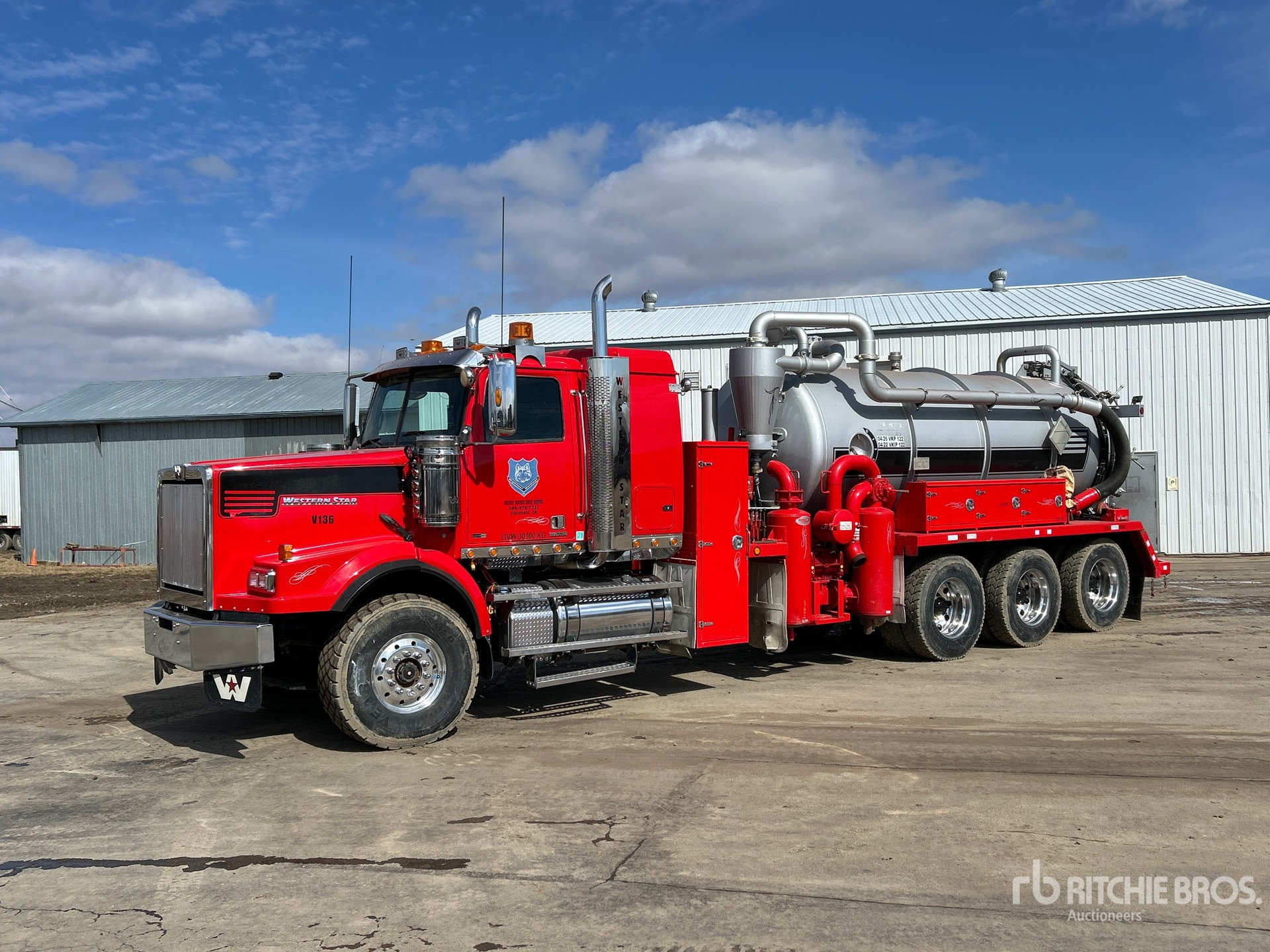 Detroit DD15 6 Cylinder 14.8 L Diesel 560 hp Engine, 2012 US EPA Label, CARB Compliant, 8623 Engine hrs, Engine Brake, Eaton Fuller 18-Speed Manual Transmission, Triple Differential Locks, 9072 kg Front Axle, 24492 kg Rears, 33566 kg GVWR, 34 in Flat Top Sleeper Cab, Aluminum Wheels, 445/65R22.5 Front Tires, 12R24.5 Rear Tires, Dual Steering Boxes, Double Frame, Airliner Air Ride Suspension, 330 in Wheelbase, PTO, Steel 14802 L Debris Tank, TC412 Code, Hoist, Vibrator, Hydraulic Lift Tailgate, Manual Tailgate Locks, 6 in Suction Hose