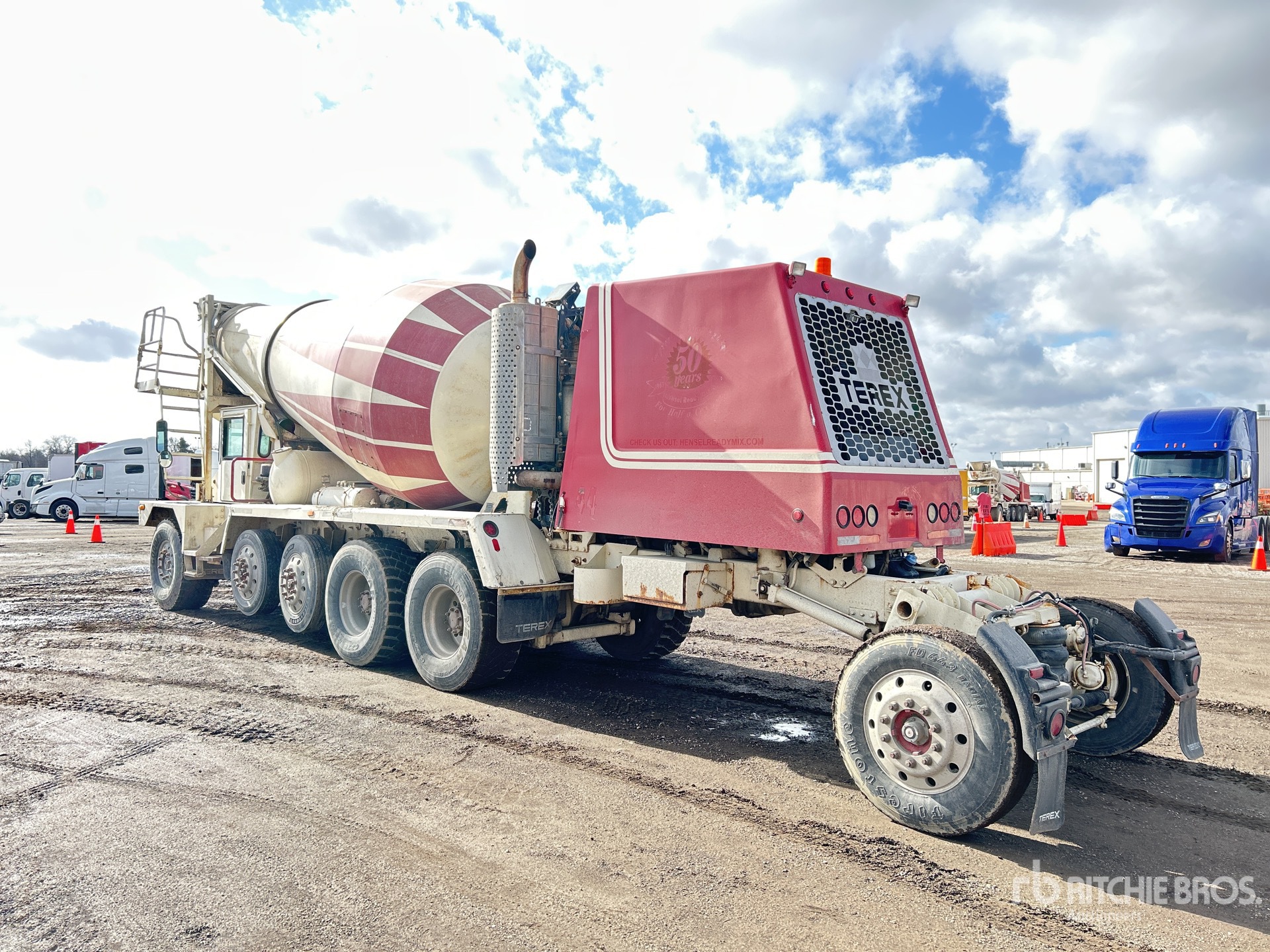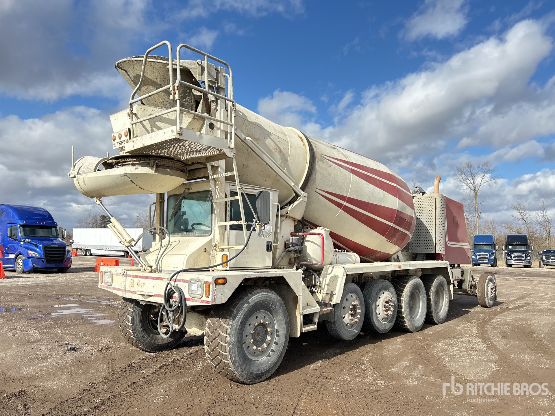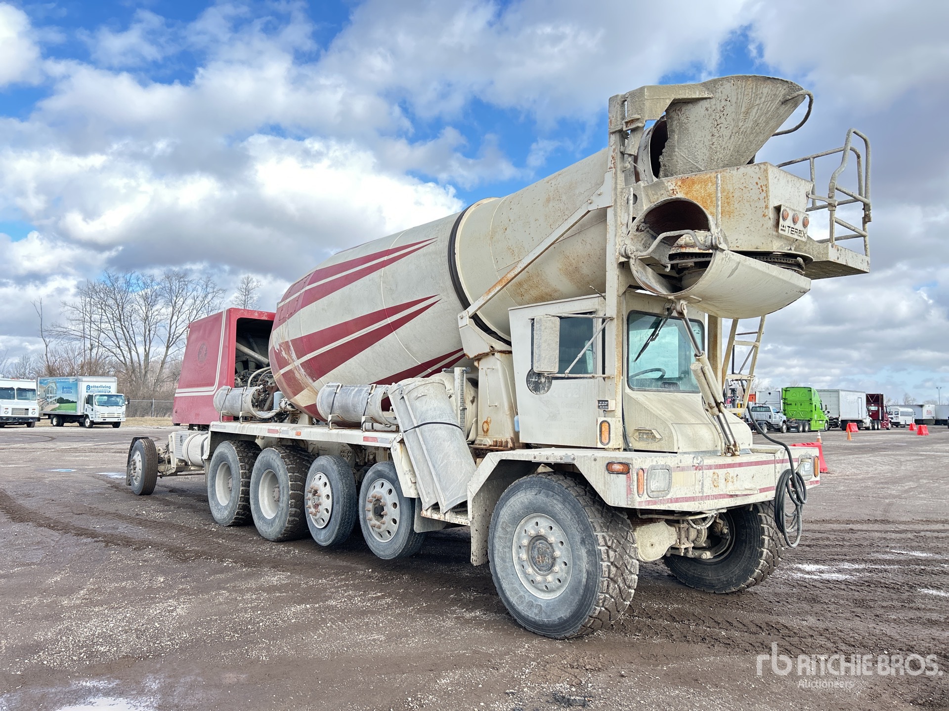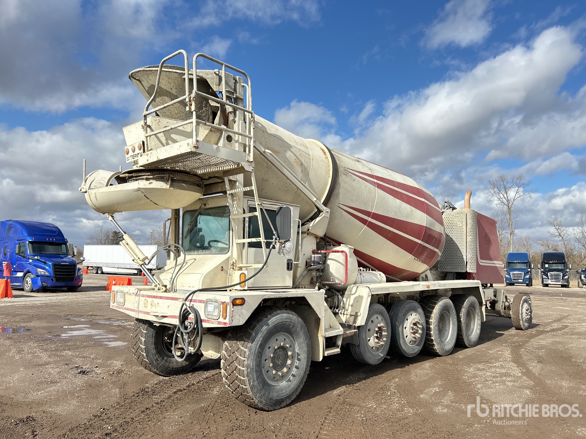 Detroit 6 Cylinder Diesel Engine, Allison Automatic Transmission, Double Differential Locks, 23000 lb Front Axle, 46000 lb Rears, 104240 lb GVWR, Aluminum Wheels, 445/65R22.5 Front Tires, 445/65R22.5 Rear Tires, 2 Steerable Air Lift Pusher Axle, Trailing Tag Axle, Air Ride Suspension, 206 in Wheelbase, Terex 11 cyd Mixer Unit, 4 Removable Chutes