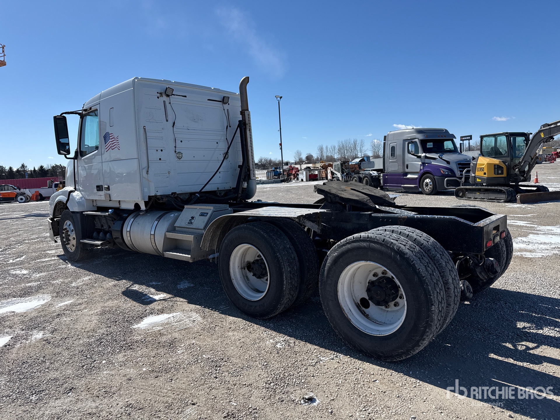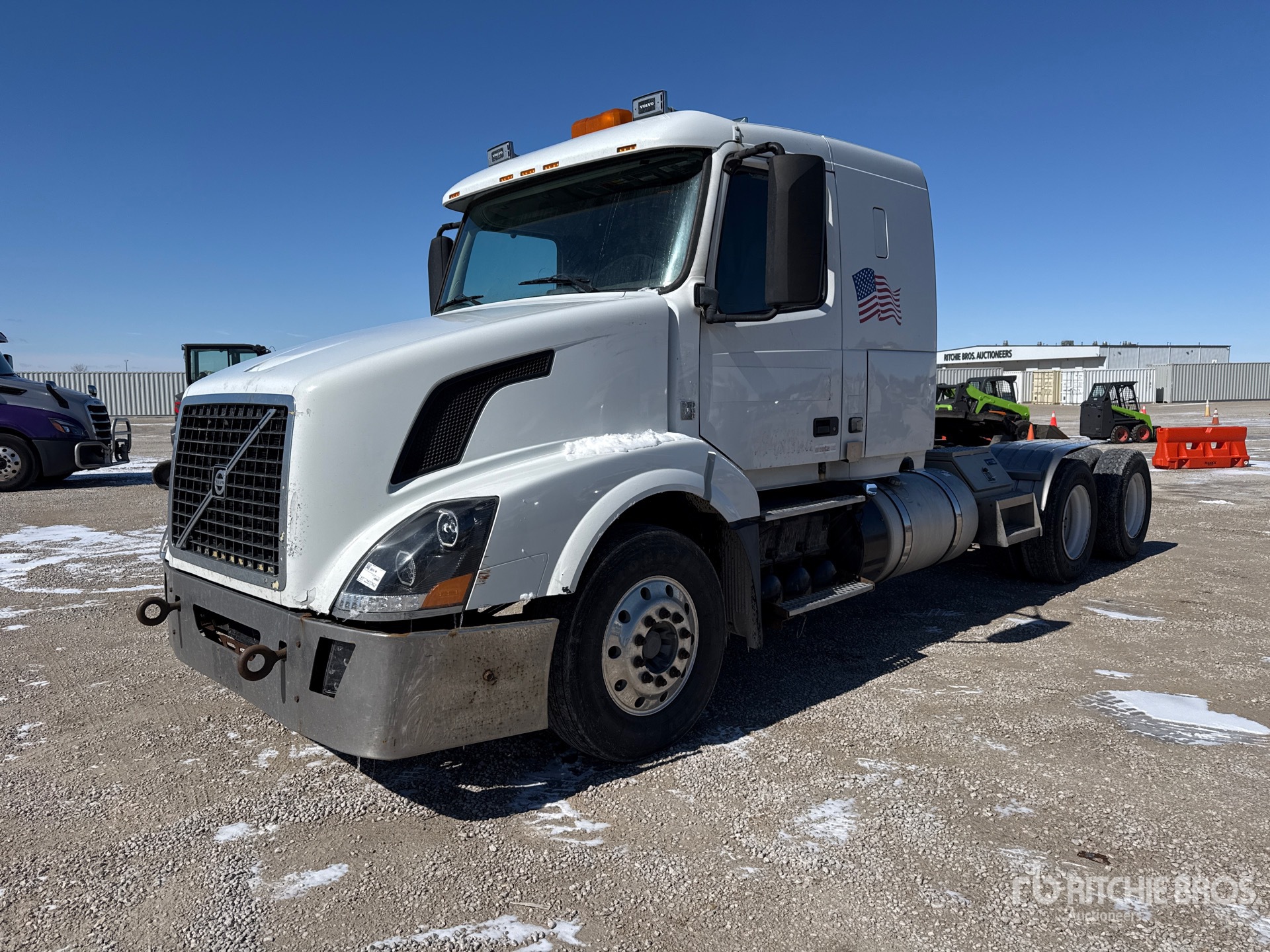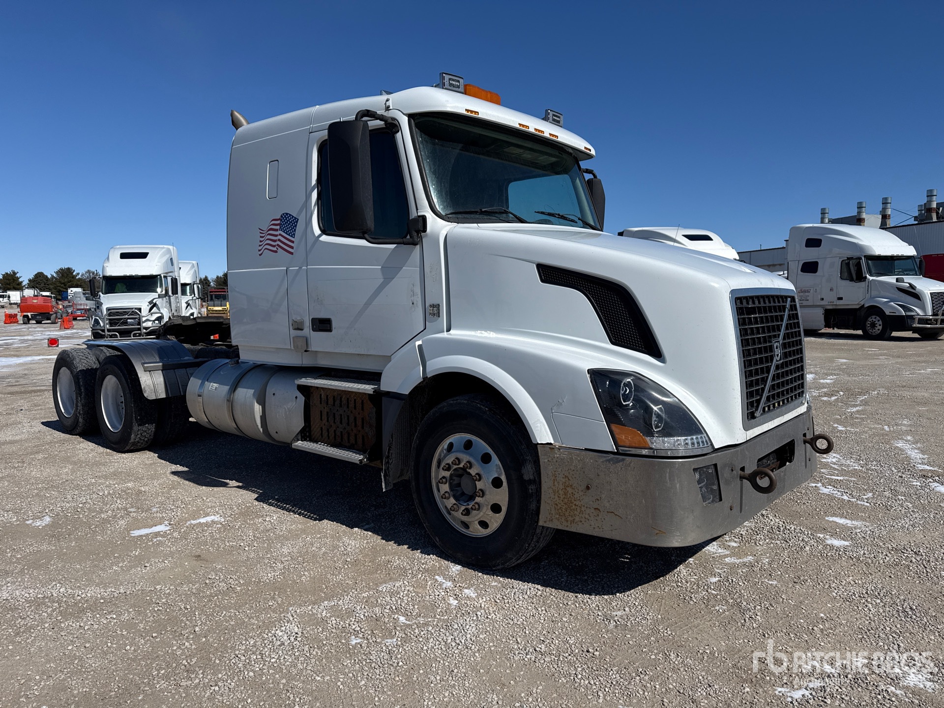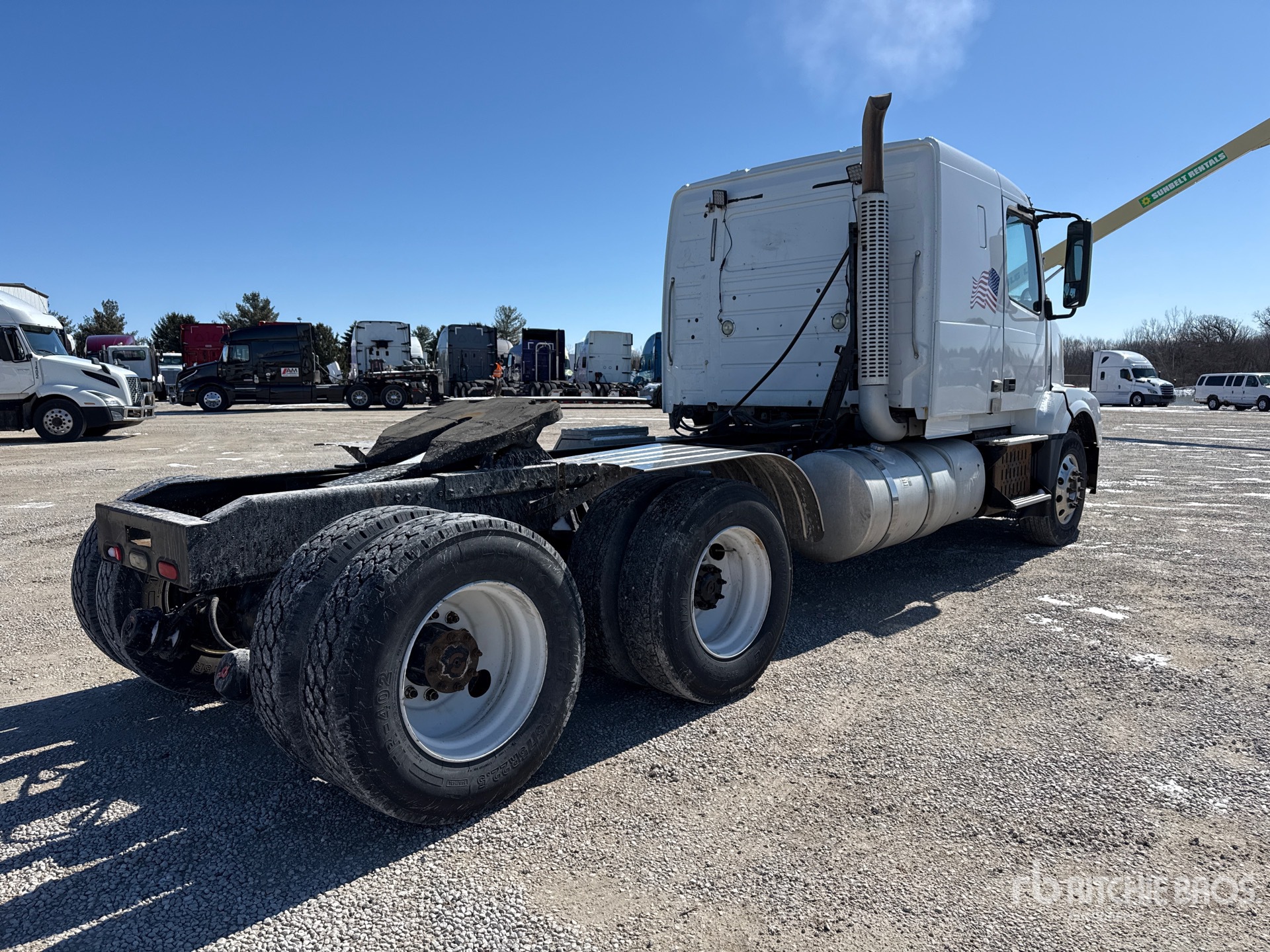 Volvo D13 435 hp Engine, 2012 US EPA Label, 29035 Engine hrs, Eaton Fuller RTLO-16913A 13-Speed Manual Transmission, 13200 lb Front Axle, 40000 lb Rears, 53200 lb GVWR, Engine Brake, 42 in Flat Top Sleeper Cab, 219 in Wheelbase, Walking Beam Suspension, Aluminum Front Wheels, 295/75R22.5, Dual Fuel Tanks