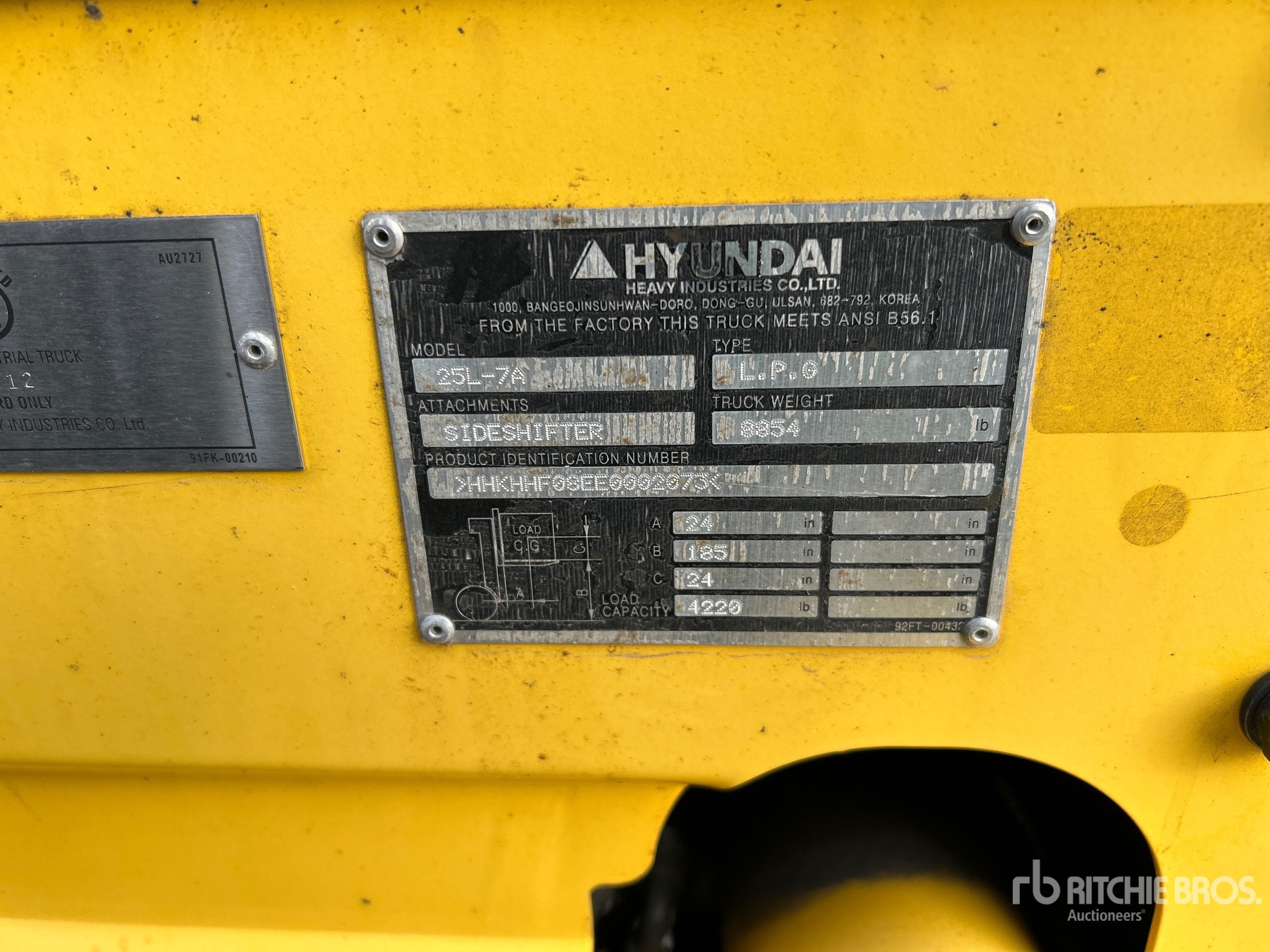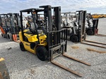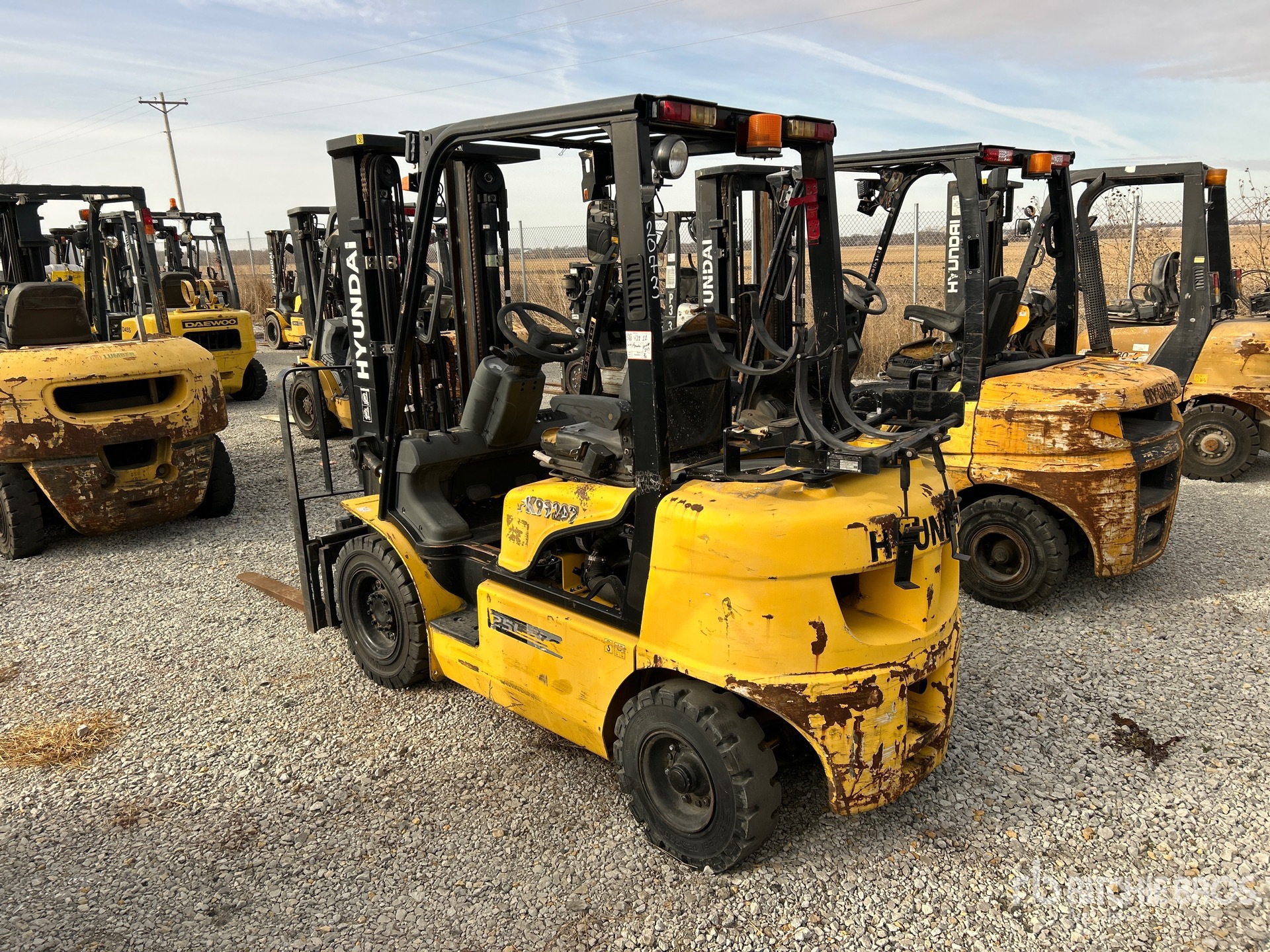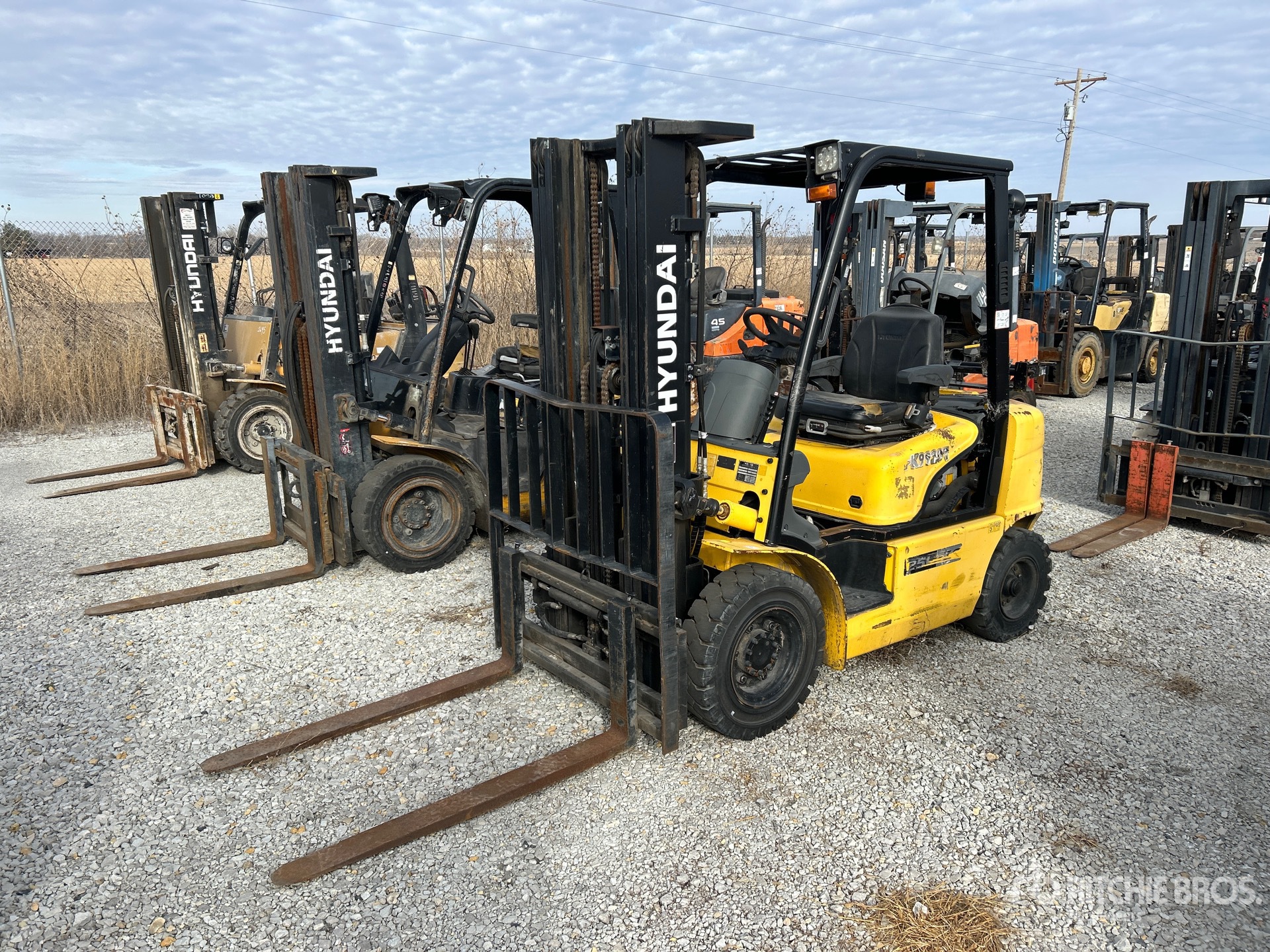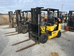 3 Stage Mast, 182 in Max Lift Height, 84 in Lowered Mast Height, 47 in Forks, Side Shift, Solid Pneumatic Tires, Hyundai 4 Cylinder LPG Engine