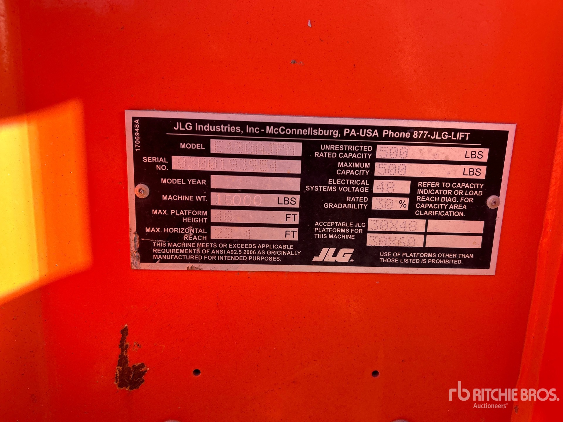 40 ft Max Platform Height, 500 lb Max Weight Capacity, Jib, Power to Platform, Non-Marking Tires