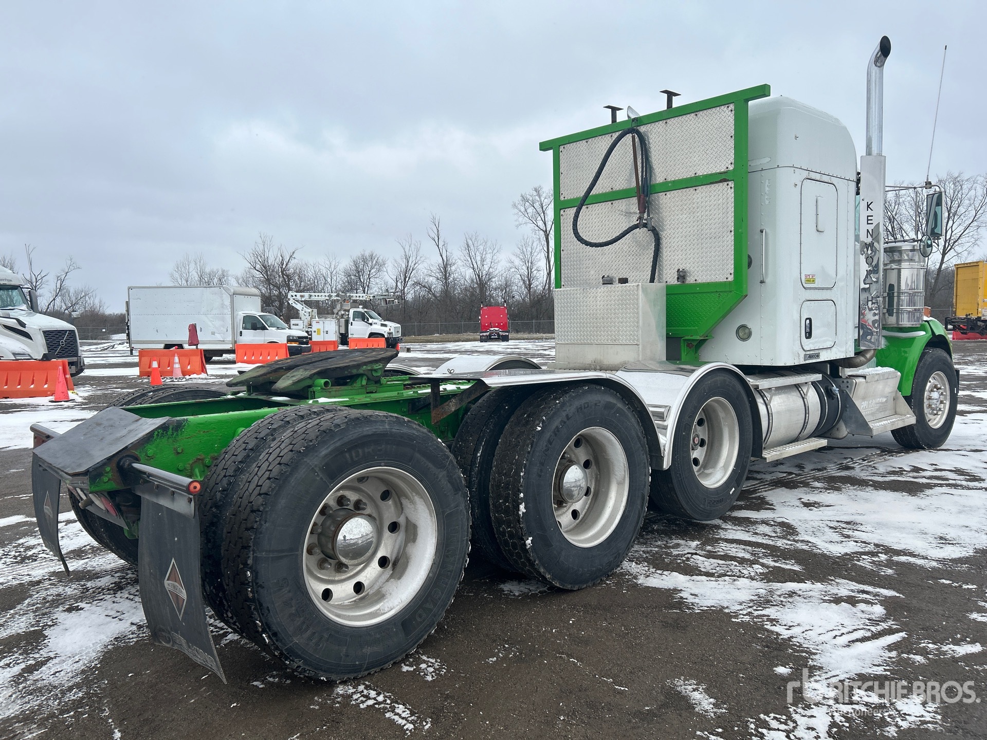 Paccar 485 hp Engine, 2012 US EPA Label, 28150 Engine hrs, Eaton Fuller RTLO-18918B 18-Speed Manual, 13200 lb Front Axle, 46000 lb Rears, 59200 lb GVWR, Exhaust Brake, 52 in Flat Top Sleeper Cab, Air Suspension, Air Lift Pusher Axle, Aluminum Wheels, 315/80R22.5 Front Tires, 11R24.5 Rear Tires, Wet Kit, Air Sliding 5th Wheel, Dual Fuel Tanks, Headache Rack