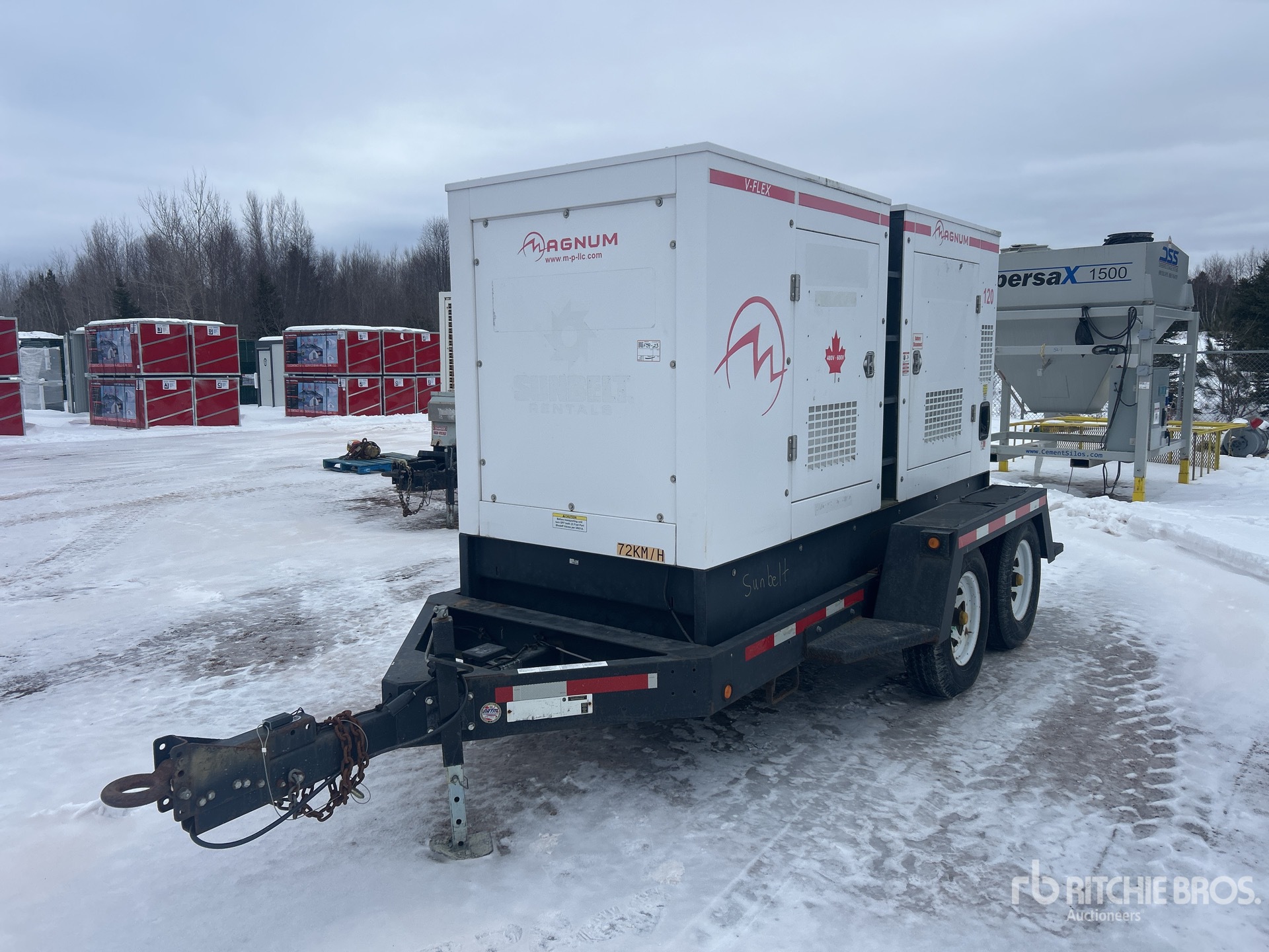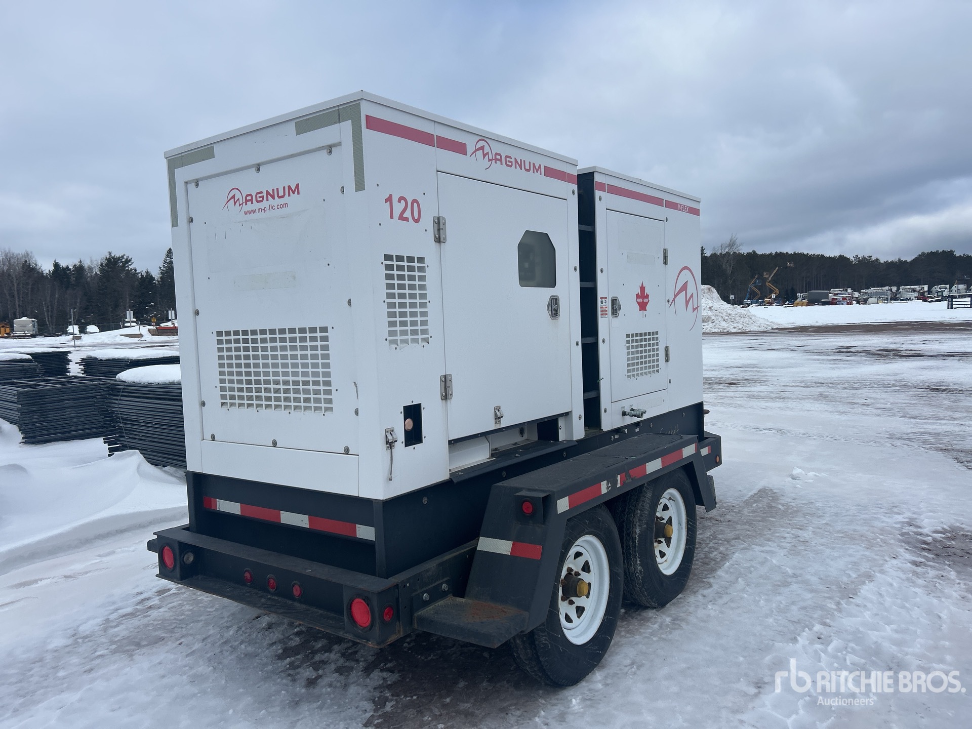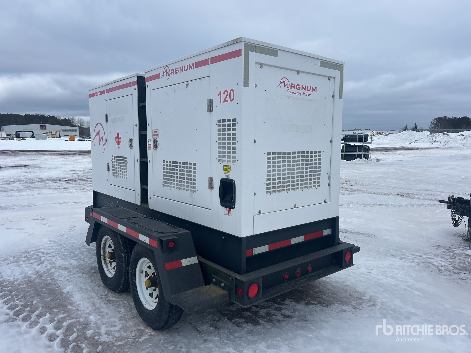 John Deere 4 Cylinder Diesel Engine, 117 kVA/94 kW Rated 3 Phase Output, 208 V / 480 V / 600 V Rated Voltage, 40 kVA,/40 kW, Rated Single Phase Output, 240 V Rated Voltage, 240 V & 120 V Receptacles, Bottom Mounted Fuel Tank, Lunette Ring Carrier Trailer, Electric Brakes