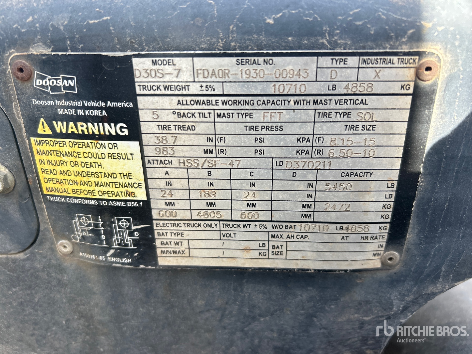 The detailed equipment information is limited in scope, and Ritchie Bros. Auctioneers has not inspected any aspects or components of the equipment other than those expressly set forth herein. Unless expressly stated, we make no representations or warranties, express or implied, concerning the equipment or its components, including without limitation any representations or warranties concerning functionality, conformity or compliance with any safety standard or requirement of any applicable authority or regulatory body, fitness for any particular purpose, or merchantability. You are strongly advised to perform your own detailed inspection of the equipment prior to bidding.