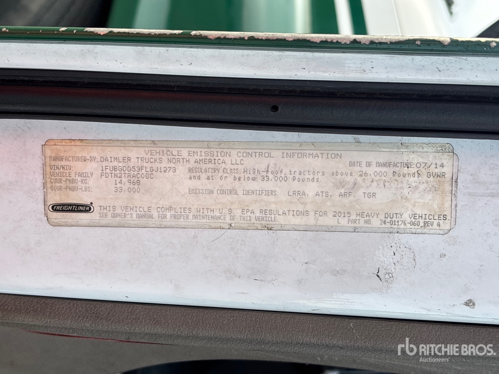 Detroit DD15 Engine, 2014 US EPA Label, 19927.5 Engine hrs, Eaton Fuller FRO-15210C 10-Speed Manual Transmission, 12000 lb Front Axle, 21000 lb Rears, 33000 lb GVWR, Engine Brake, 158 in Wheelbase, Air Suspension, 11R22.5, Dual Fuel Tanks