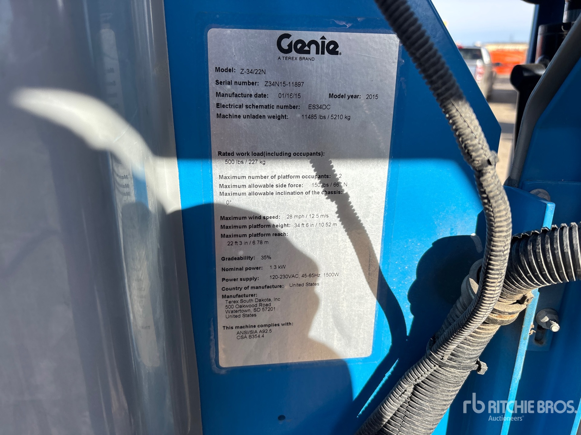 34 ft 6 in Max Platform Height, 500 lb Max Weight Capacity, Jib, Power to Platform, 22x7x17 3/4 Tires