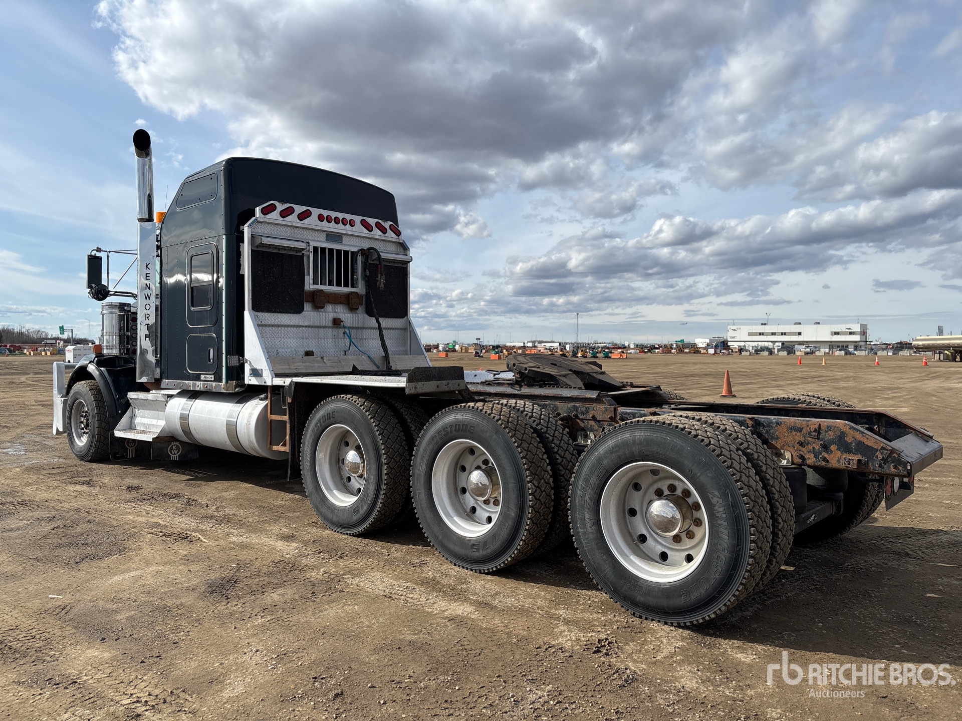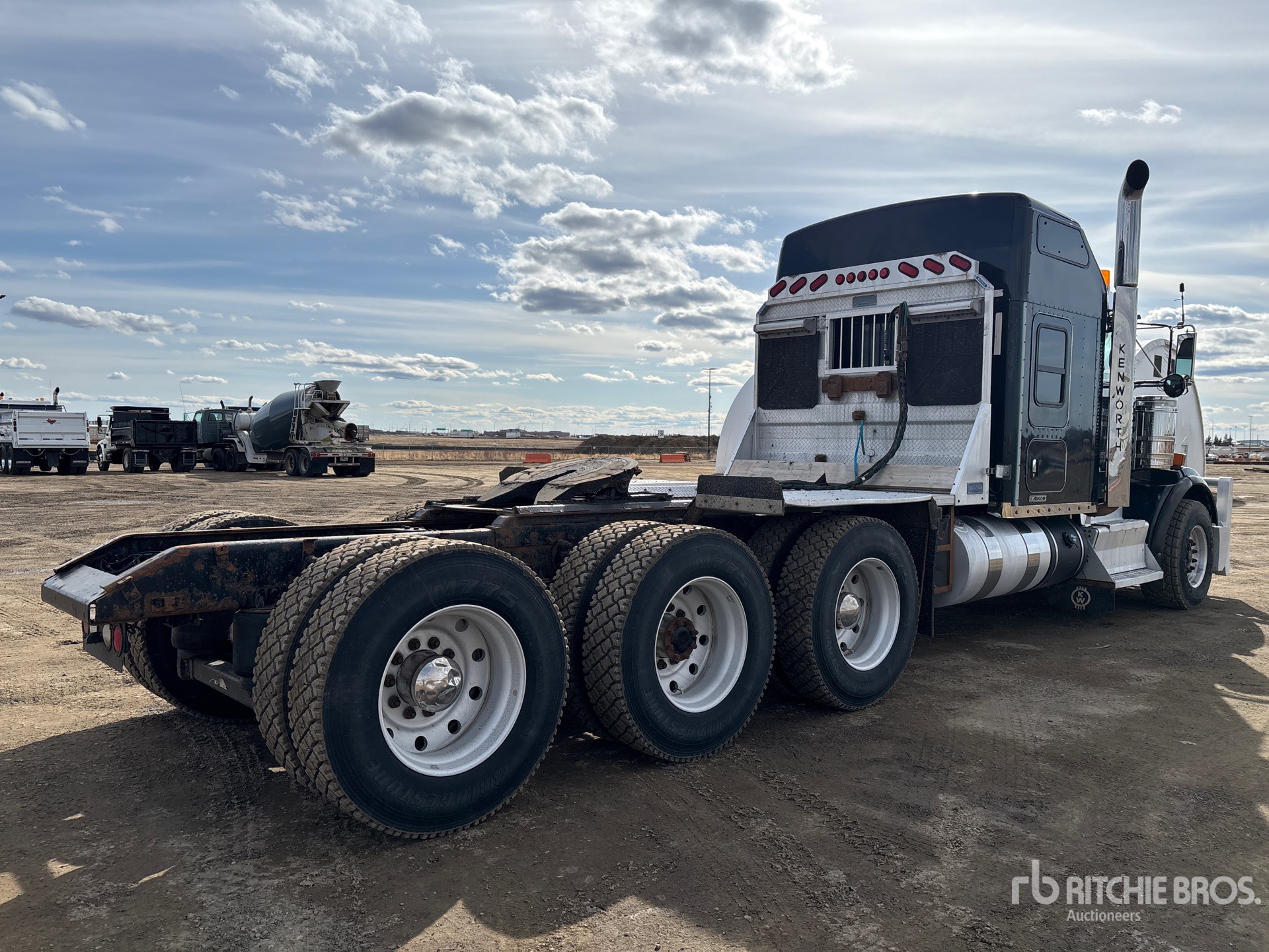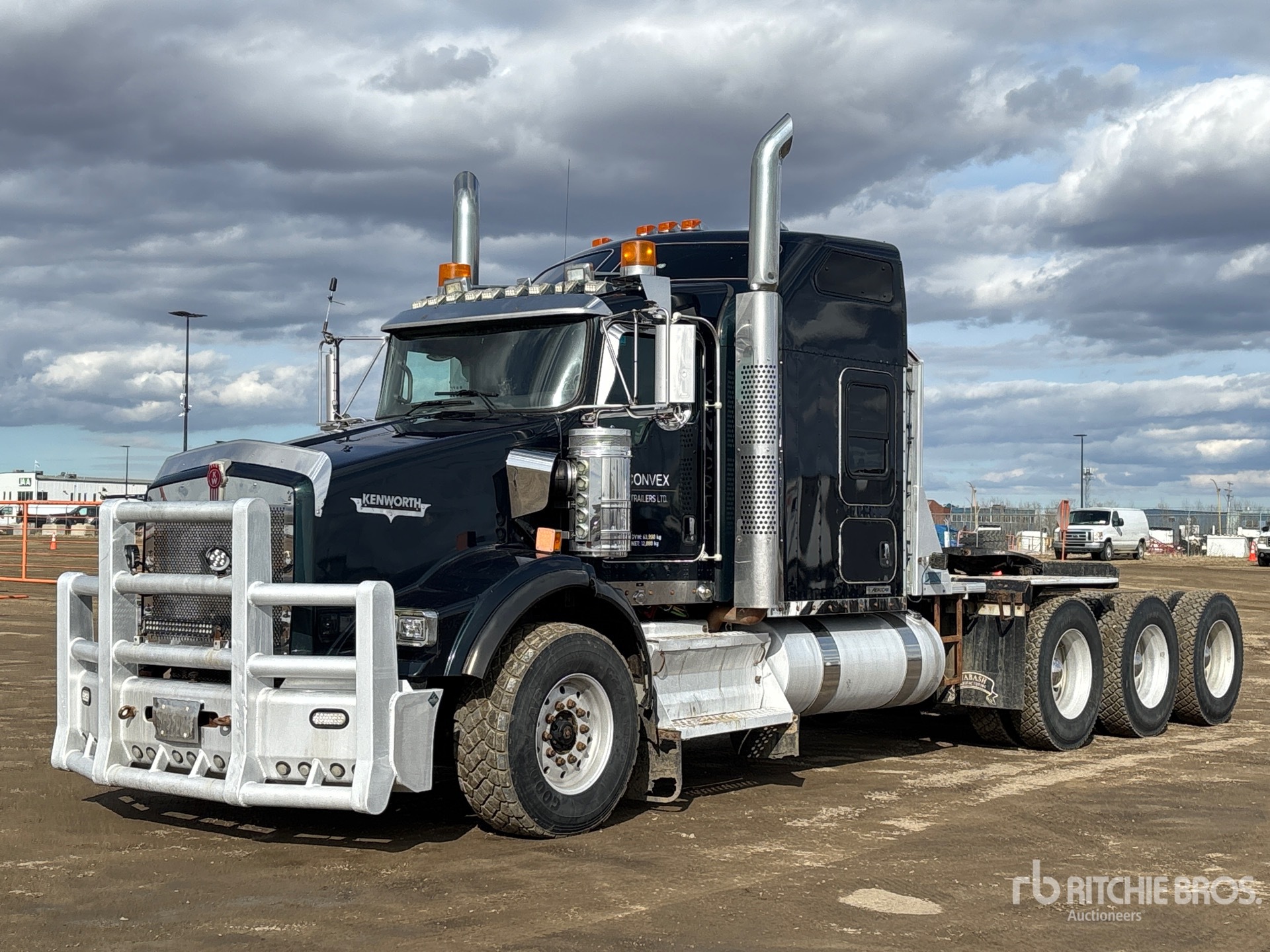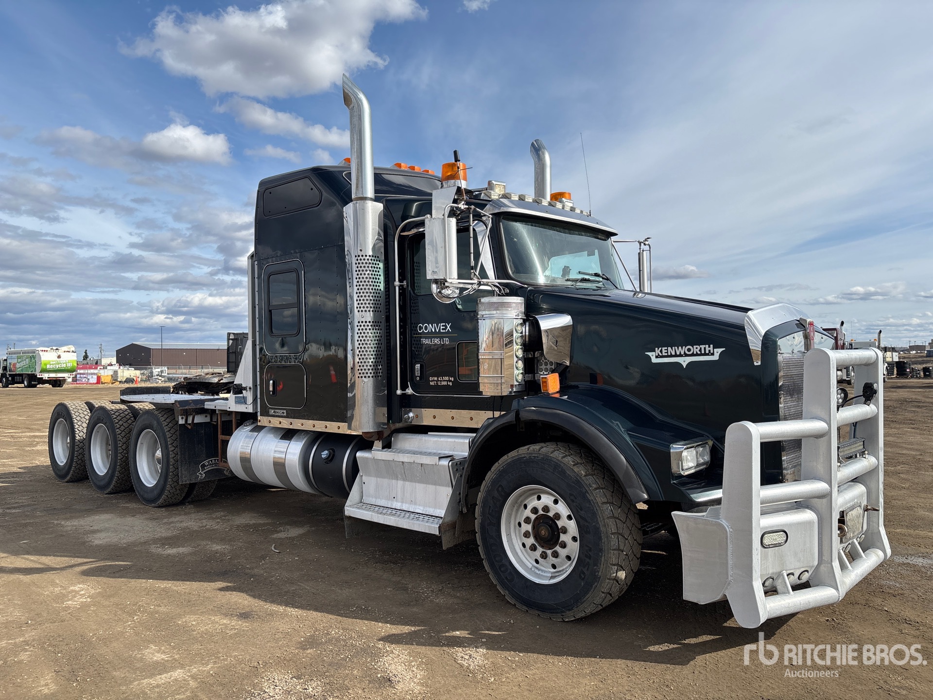 Cummins ISX 550 hp Engine, Engine Coolant Heater, 2014 US EPA Label, Eaton Fuller RTLO-20918B 18-Speed Manual, 20000 lb Front Axle, Dana T69-170HP Drive Axles, 4.30:1 Axle Ratio, 64000 lb Rears, 84000 lb GVWR, Engine Brake, 62 in Mid Roof Sleeper Cab, 266 in Wheelbase, Air Suspension, Aluminum Wheels, 385/65R22.5 Front Tires, 11R24.5 Rear Tires, Dual Steering Boxes, Double Frame, Air Sliding 5th Wheel, Dual Fuel Tanks, Headache Rack, Triple Diff Locks