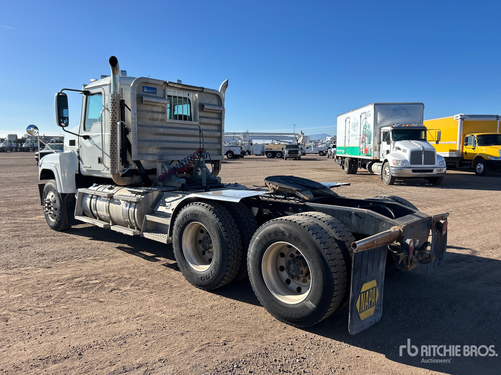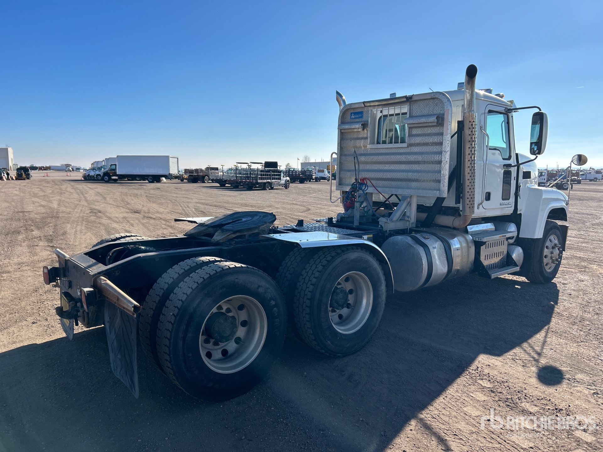 Located in Lane 8 Spot 25, Mack MP8 445 hp Engine, 2014 US EPA Label, 15120 Engine hrs, Eaton Fuller 10-Speed Manual Transmission, 12000 lb Front Axle, 38000 lb Rears, 50000 lb GVWR, Engine Brake, 207 in Wheelbase, Camelback, Aluminum Wheels, 11R22.5, Air Sliding 5th Wheel, Dual Fuel Tanks, Headache Rack