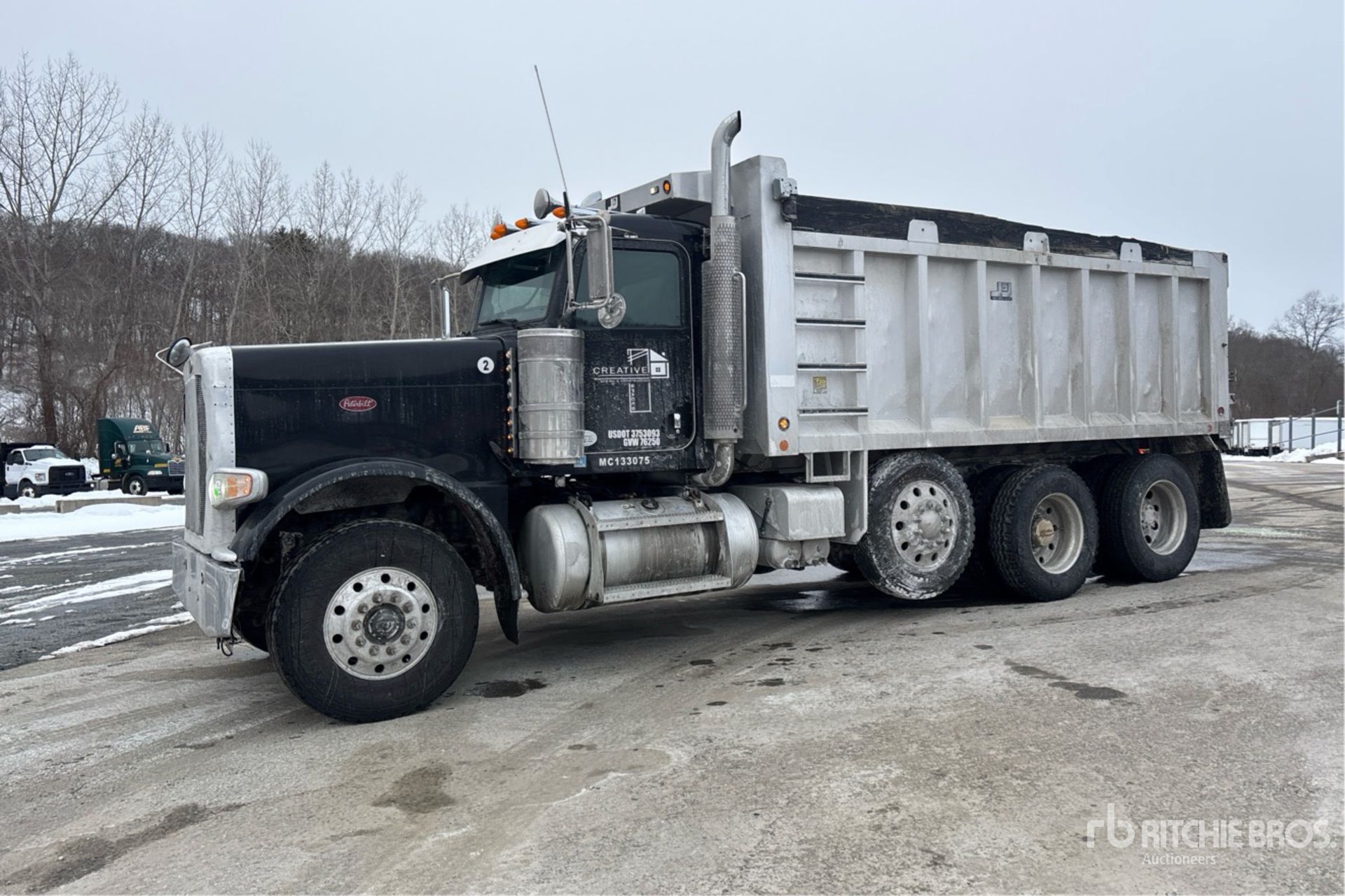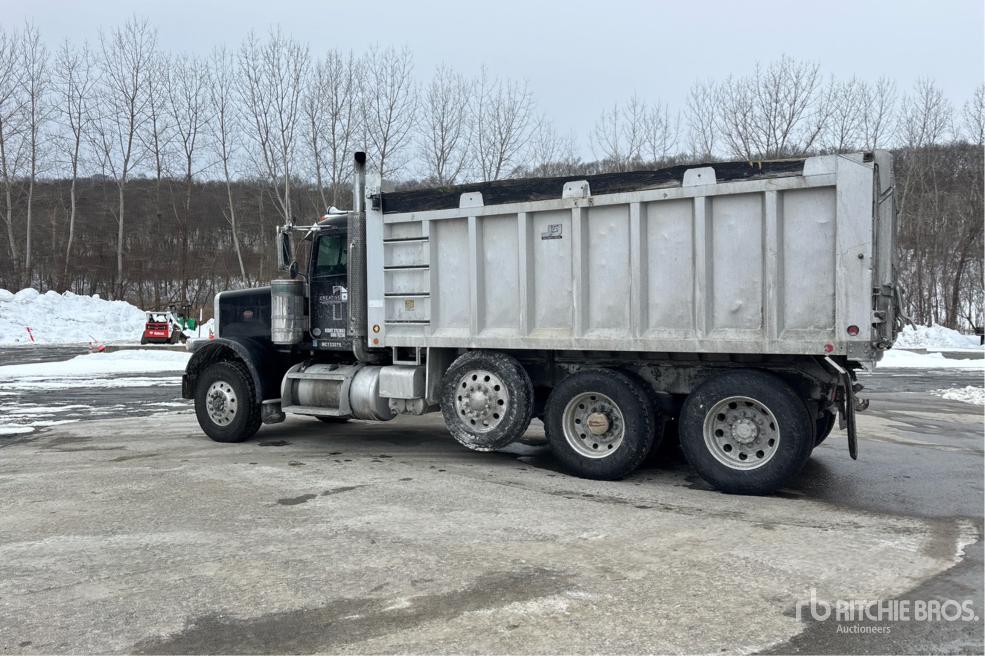 Paccar MX-13 6 Cylinder 12.9 L Diesel 500 hp Engine, 2014 US EPA Label, CARB Compliant, Requires Diesel Exhaust Fluid, 16726 Engine hrs, Engine Brake, Eaton Fuller Manual Transmission, Double Differential Locks, 18179 lb Front Axle, 46000 lb Rears, 77680 lb GVWR, Air Ride Cab, Aluminum Wheels, 315/80R22.5 Front Tires, 11R24.5 Rear Tires, Steerable Air Lift Pusher Axle, Dual Steering Boxes, Double Frame, Air Trac Air Ride Suspension, 232 in Wheelbase, PTO, J&J 17 ft Long x 5 ft 4 in High Aluminium Body, Triple Tailgate Chutes, Pintle Hitch