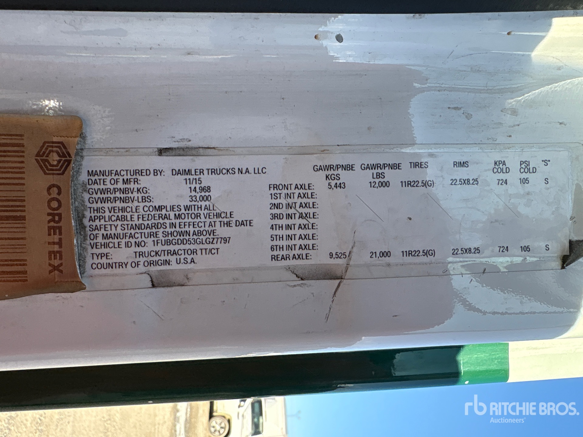 Detroit DD15 455 hp Engine, 2015 US EPA Label, 778167.7 Engine hrs, Eaton Fuller FRO-15210C 10-Speed Manual Transmission, 12000 lb Front Axle, 23000 lb Rears, 33000 lb GVWR, Engine Brake, 158 in Wheelbase, Air Suspension, 11R22.5, Dual Fuel Tanks
