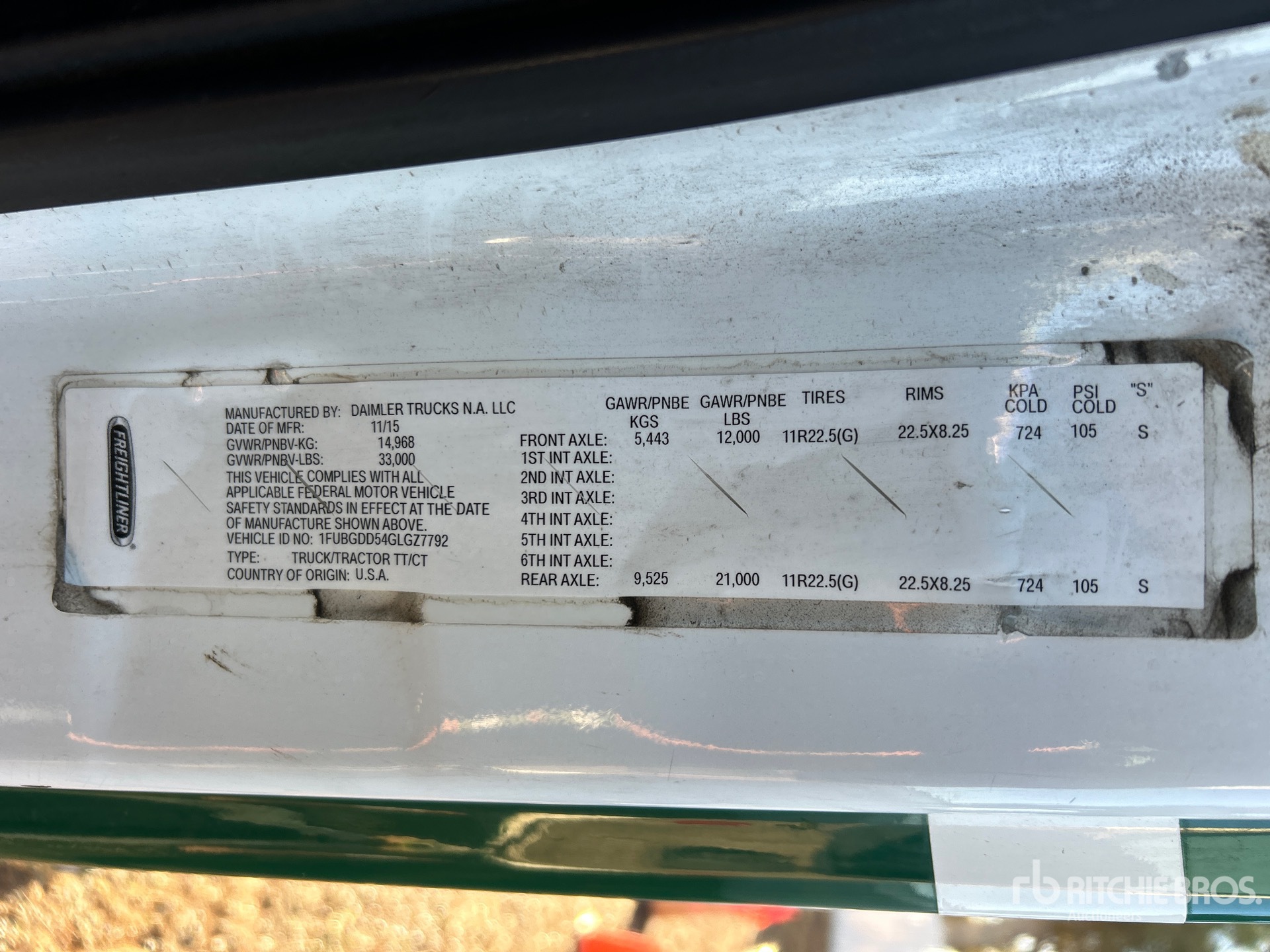 Located in Lane 15, Detroit DD15 455 hp Engine, 2015 US EPA Label, 19257 Engine hrs, Eaton Fuller FRO-15210C 10-Speed Manual Transmission, 12000 lb Front Axle, 21000 lb Rears, 33000 lb GVWR, Engine Brake, 158 in Wheelbase, Air Suspension, 11R22.5, Dual Fuel Tanks
