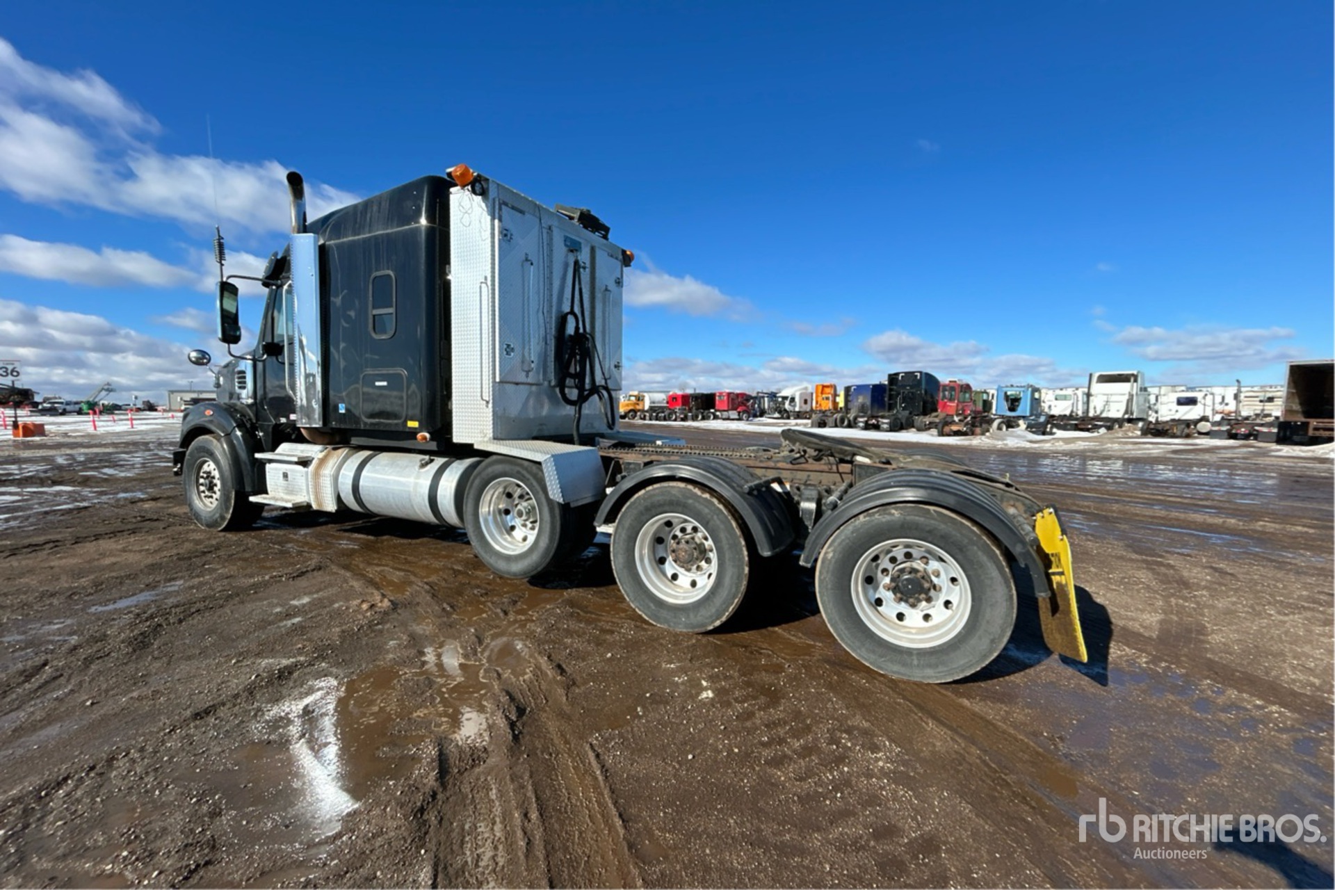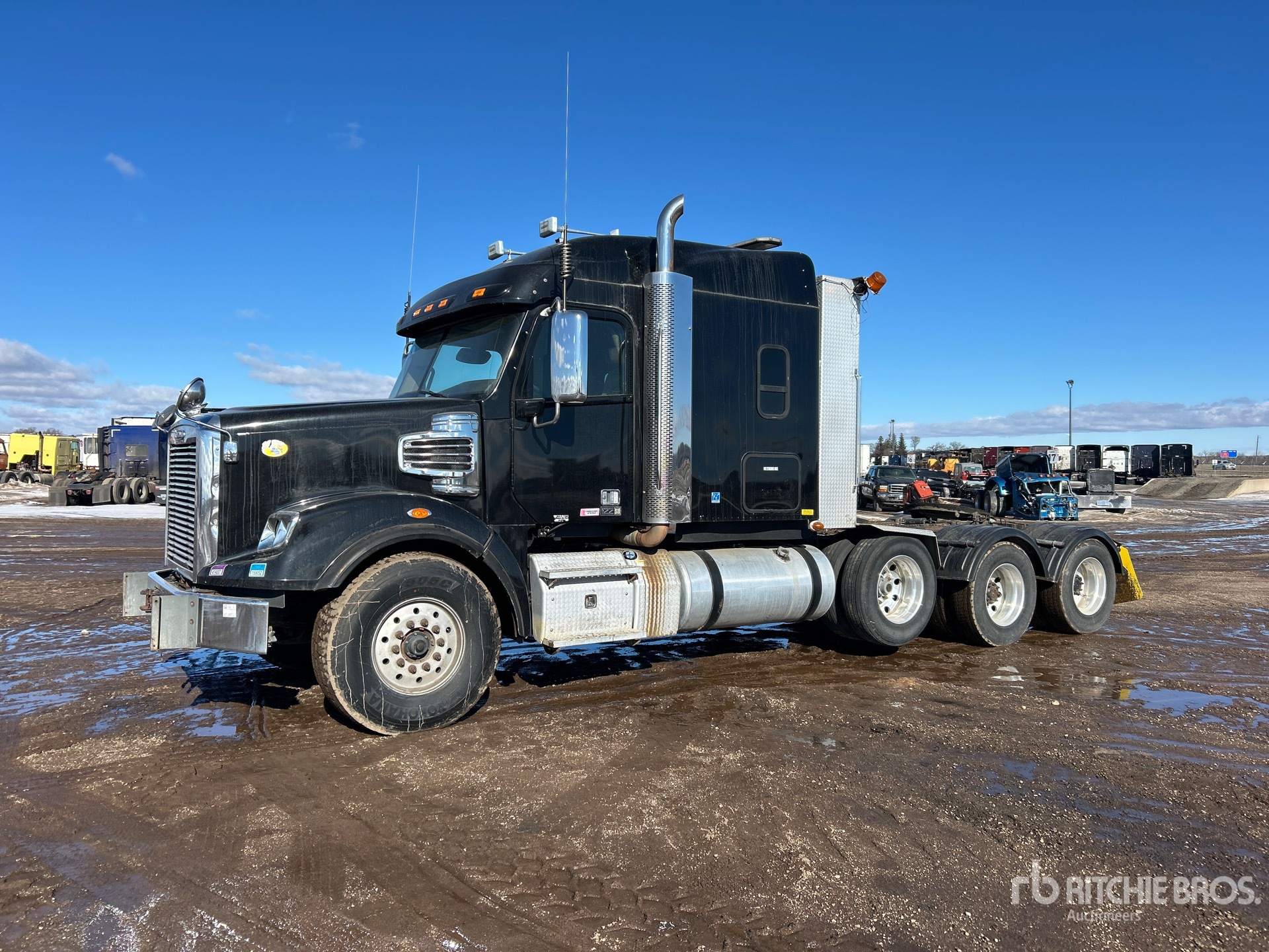 Located in Lane 8 Spot 1, Detroit Engine, Eaton Fuller 18-Speed Manual Transmission, 18740 lb Front Axle, 65700 lb Rears, 84140 lb GVWR, 60 in Mid Roof Sleeper Cab, Auxiliary Power Unit, Thermo King Sleeper Air Conditioner, 257 in Wheelbase, Air Suspension, Air Lift Pusher Axle, Aluminum Wheels, 295/75R22.5, Air Sliding 5th Wheel, Headache Rack, Lowboy Ramps
