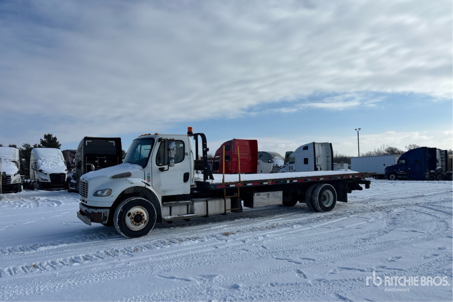 Cummins ISL 6 Cylinder Diesel 330 hp Engine, Requires Diesel Exhaust Fluid, 13754.9 Engine hrs, Allison 3500 Automatic Transmission, 12000 lb Front Axle, 21000 lb Rears, Meritor RS21-160 Drive Axles, 5.38:1 Axle Ratio, 33000 lb GVWR, 295/75R22.5, Spring Suspension, 265 in Wheelbase, PTO, 2015 Landoll Rollback Body, 22 ft x 102 in Bed, Braden Winch
