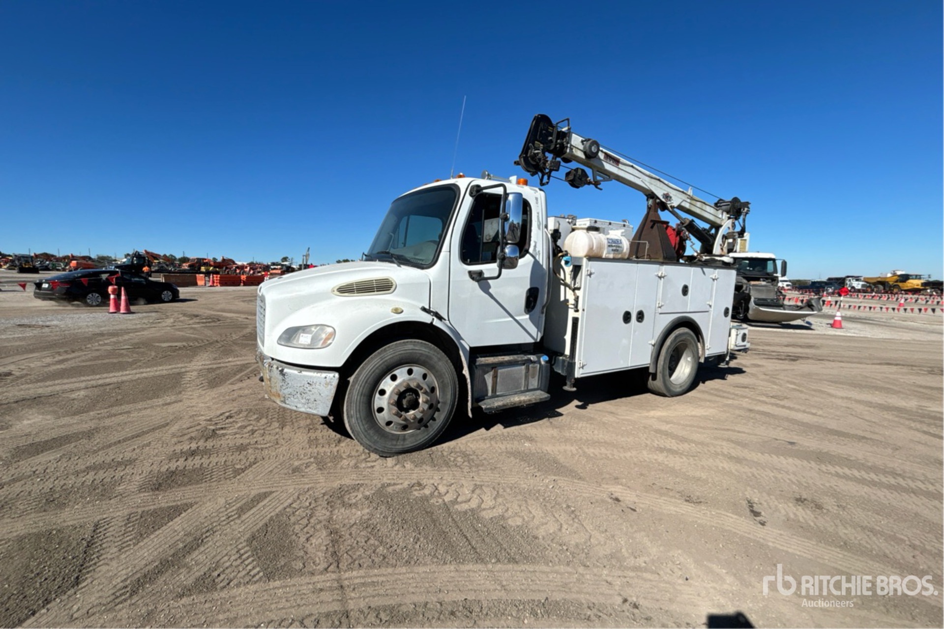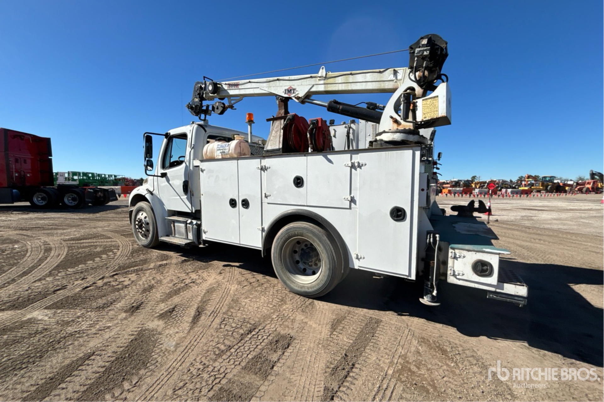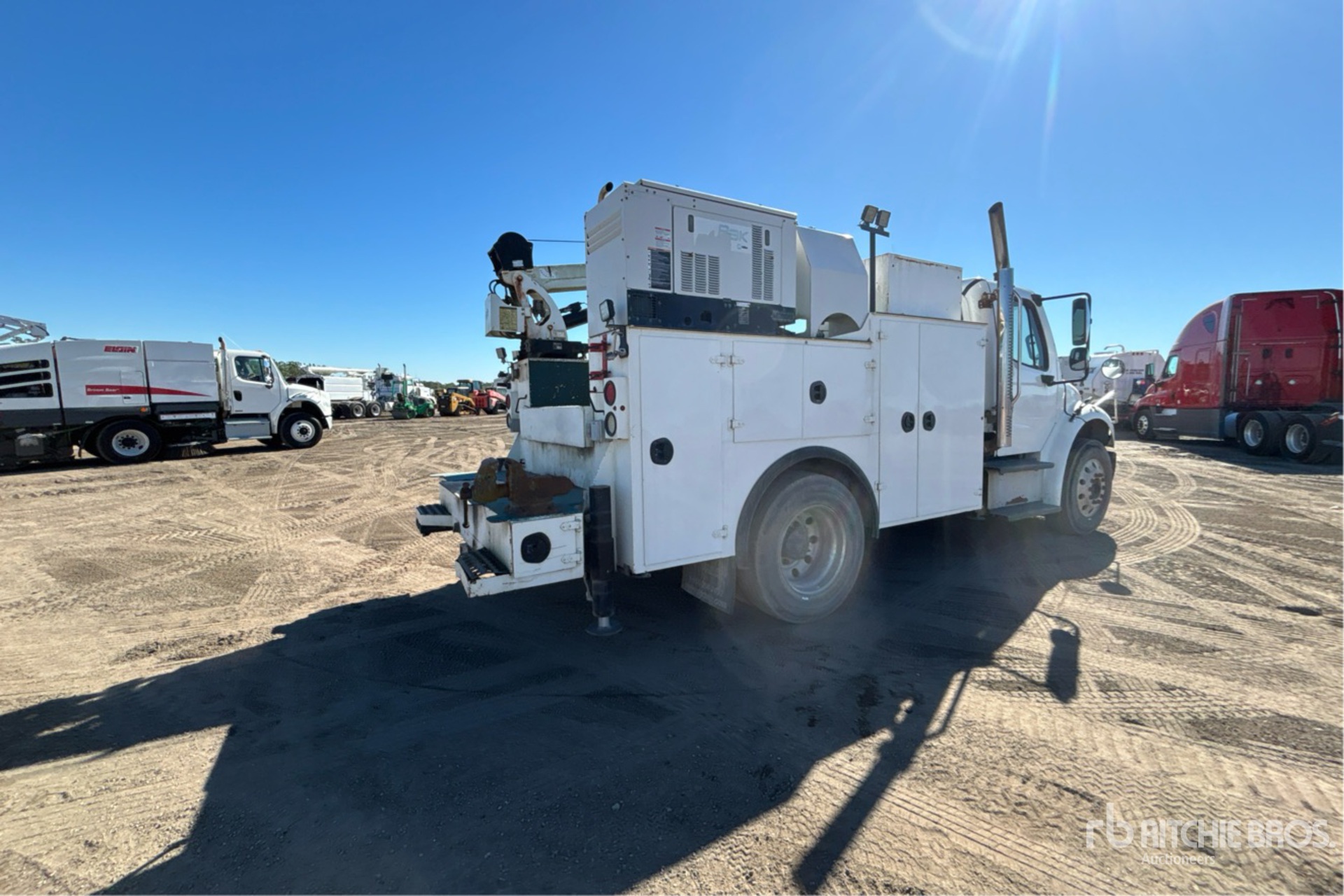 Cummins ISB6.7 240 6.7 L Diesel 240 hp Engine, 2015 US EPA Label, CARB Compliant, Requires Diesel Exhaust Fluid, 16111 Engine hrs, Automatic Transmission, 8000 lb Front Axle, 17500 lb Rears, 25500 lb GVWR, Aluminum Wheels, 275/80R22.5, Spring Suspension, 157 in Wheelbase, Wet Kit, 11 ft Body, Hydraulic Stabilizers, IMT 8600 lb 3 Section Hydraulic Crane, Miller Enpak 6 kVA Generator Set, Miller Enpak 60 cfm Diesel Air Compressor, Air Hose Reel