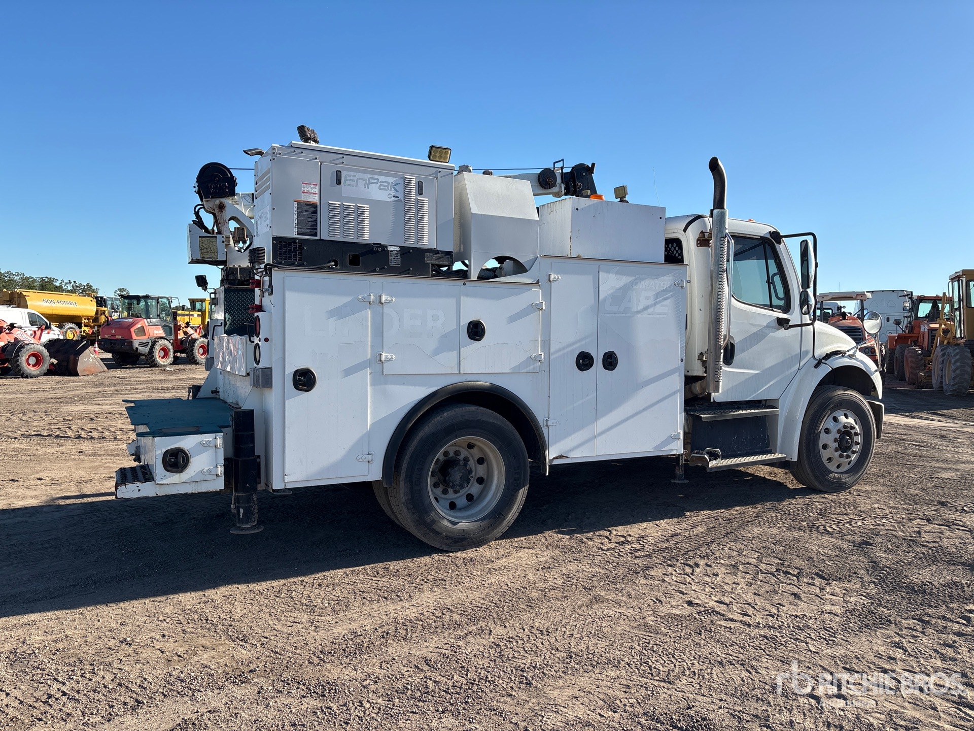 Cummins ISB Diesel 240 hp Engine, Requires Diesel Exhaust Fluid, Allison 2500 Automatic Transmission, 8000 lb Front Axle, 17500 lb Rears, 25500 lb GVWR, Aluminum Wheels, 275/80R22.5 Front Tires, 295/75R22.5 Rear Tires, Spring Suspension, 160 in Wheelbase, PTO, Hydraulic System, 10 ft Body, Hydraulic Stabilizers, IMT 8600-22 8600 lb Hydraulic Crane, Wireless Remote Control, Miller 6 kVA Generator Set