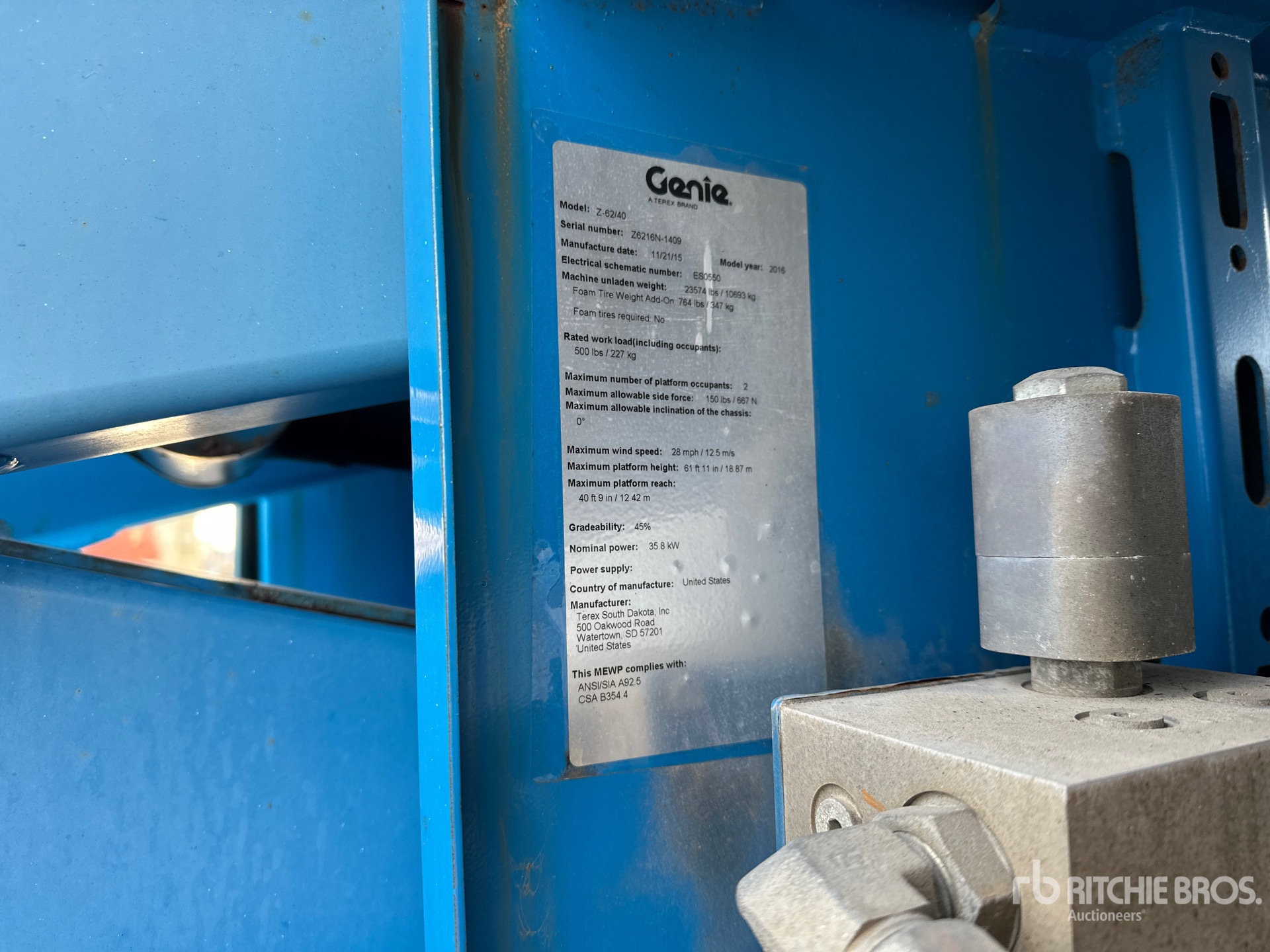 61 ft 11 in Max Platform Height, 500 lb Max Weight Capacity, Jib, Power to Platform, 2015 US EPA Label, Deutz 4 Cylinder 2.9 L Diesel Engine, 355/55D625 Tires