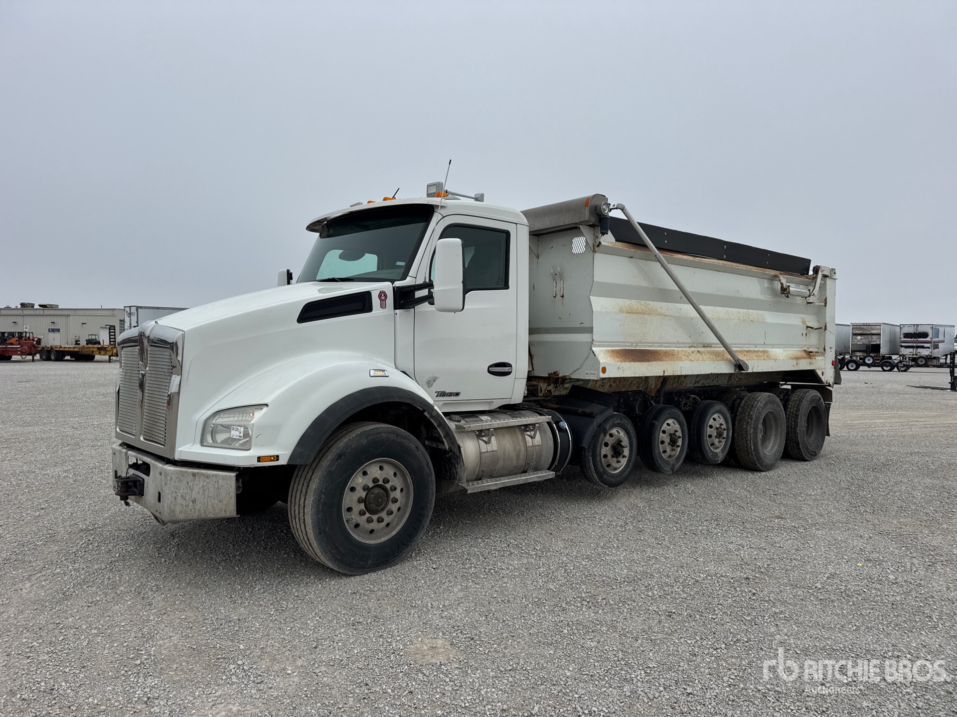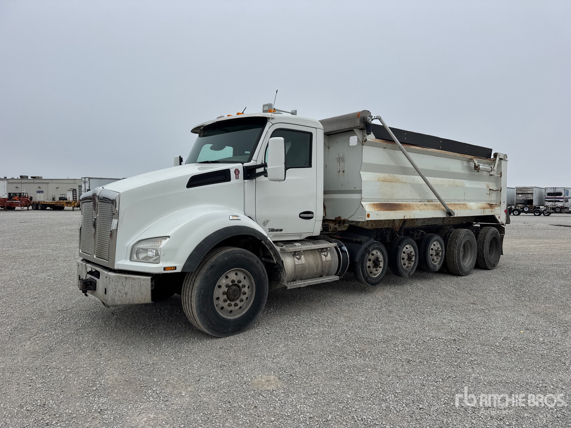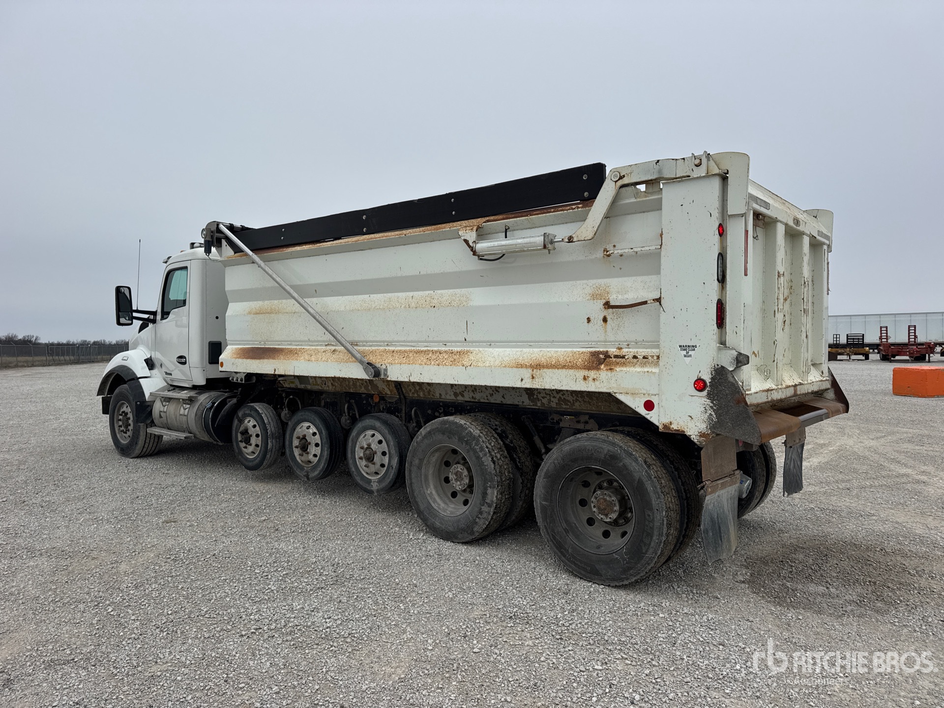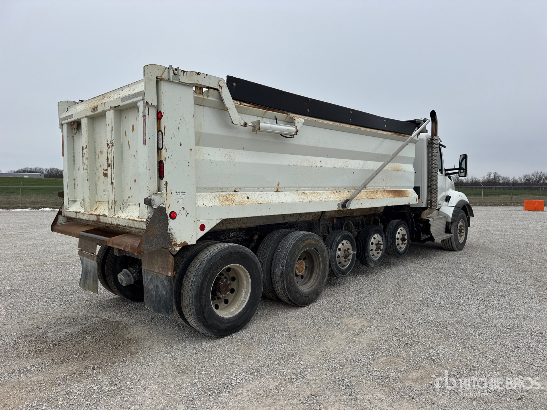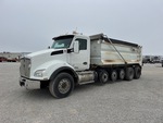 Paccar MX-13 6 Cylinder 12.9 L Diesel 485 hp Engine, 2013 US EPA Label, Requires Diesel Exhaust Fluid, Engine Brake, Eaton Fuller RTDF-16908LL Manual Transmission, Double Differential Locks, 18750 lb Front Axle, 66500 lb Rears, Aluminum Wheels, 385/65R22.5 Front Tires, 11R22.5 Rear Tires, Air Lift Tag Axle, Rubber over Walking Beam Suspension, 295 in Wheelbase, PTO, 18 ft Long x 4 ft High Steel Body, Electric Roll Tarp, High-Lift Tailgate