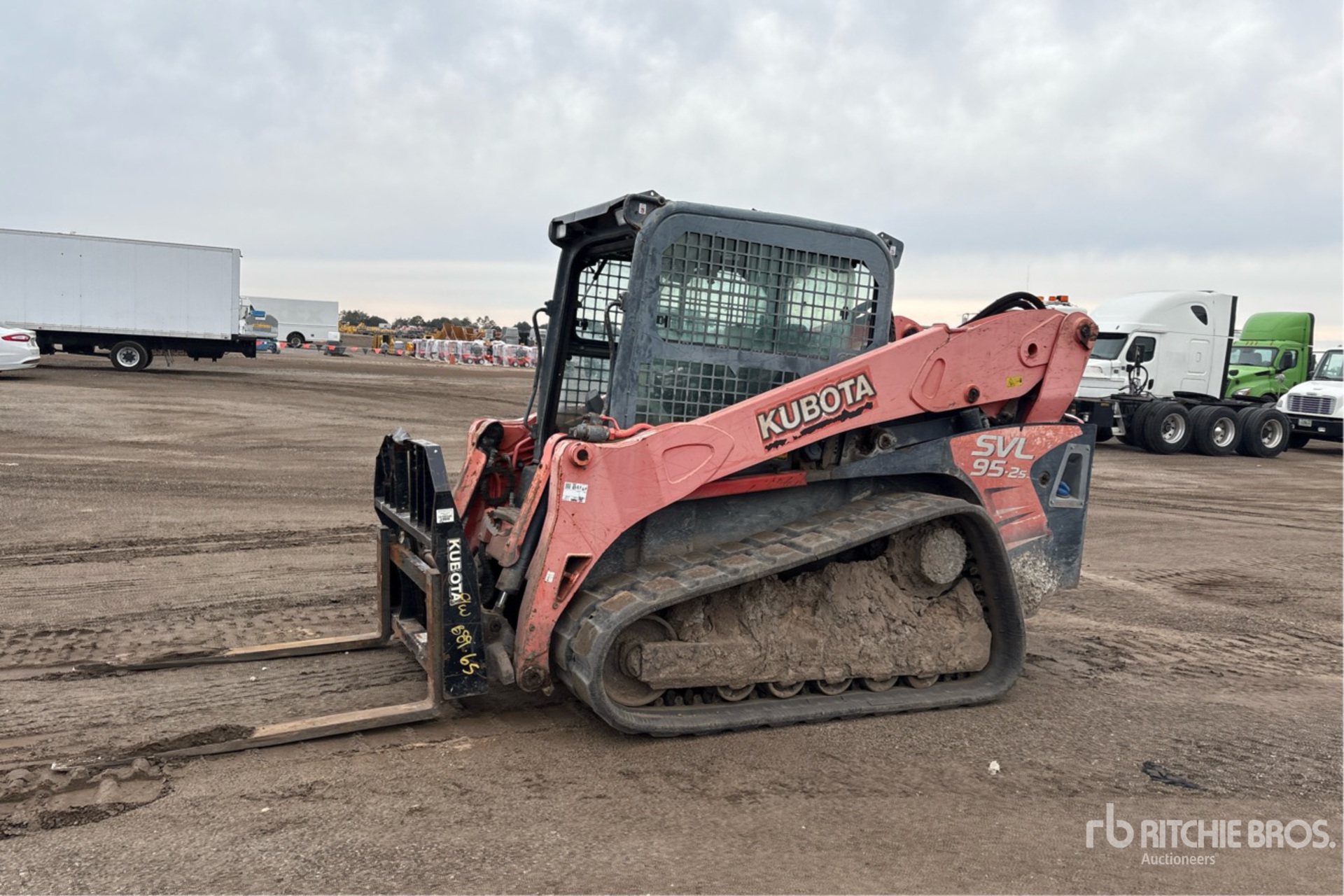 Enclosed Cab (Door missing), Air Conditioner, Tier 4, 2015 US EPA Label, Requires Diesel Exhaust Fluid, 17 in Track Belts, Manual Coupler, 80 in Bucket, Forks