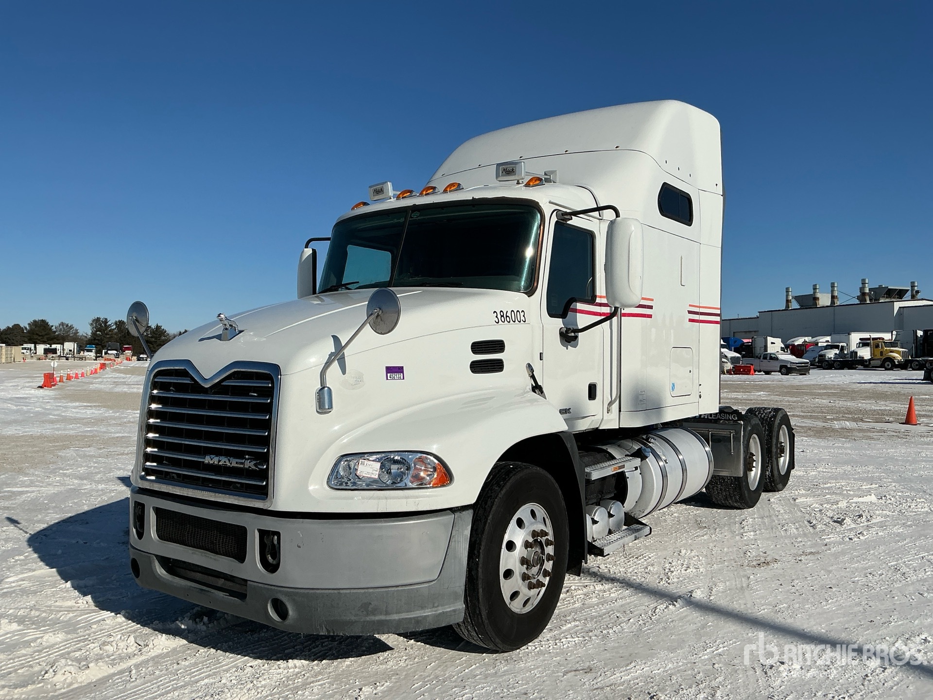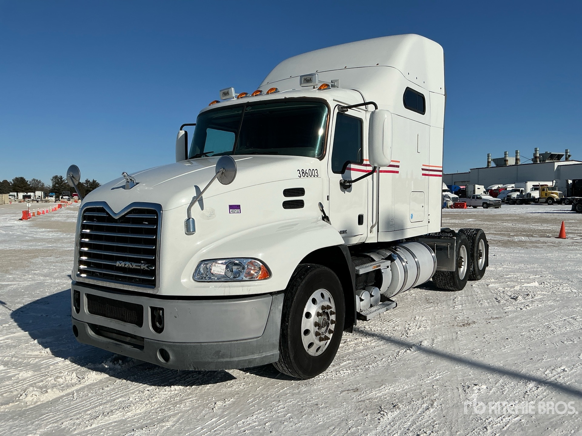 Located in Lane 18 Spot 27, Mack MP7 395 hp Engine, 2015 US EPA Label, 35031 Engine hrs, Engine Brake, Differential Lock, 56 in Mid Roof Sleeper Cab, 218 in Wheelbase, Air Suspension, Aluminum Wheels, 295/75R22.5 Front Tires, 445/50R22.5 Super Singles Rear Tires, Air Assist Front Suspension, Air Sliding 5th Wheel, Dual Fuel Tanks