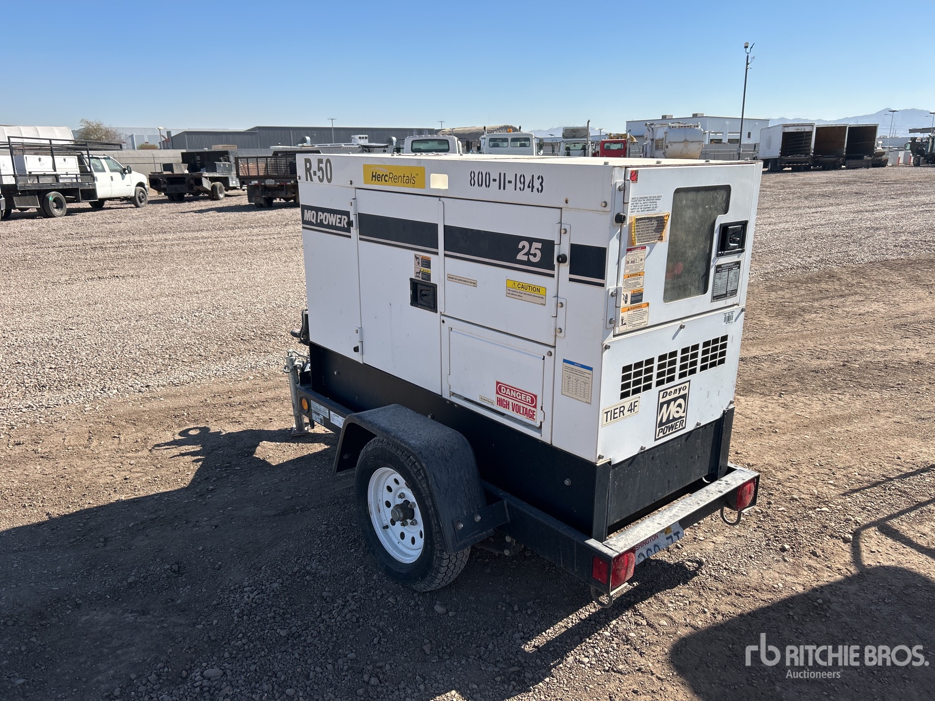 Isuzu 4LE2T 4 Cylinder 2.1 L Diesel Engine, 25 kVA/20 kW Rated 3 Phase Output, 240 V / 480 V Rated Voltage, 14.4 kVA,/14.4 kW, Rated Single Phase Output, 240 V / 120 V Rated Voltage, 240 V & 120 V Receptacles, Bottom Mounted Fuel Tank, Lunette Ring Carrier Trailer