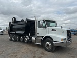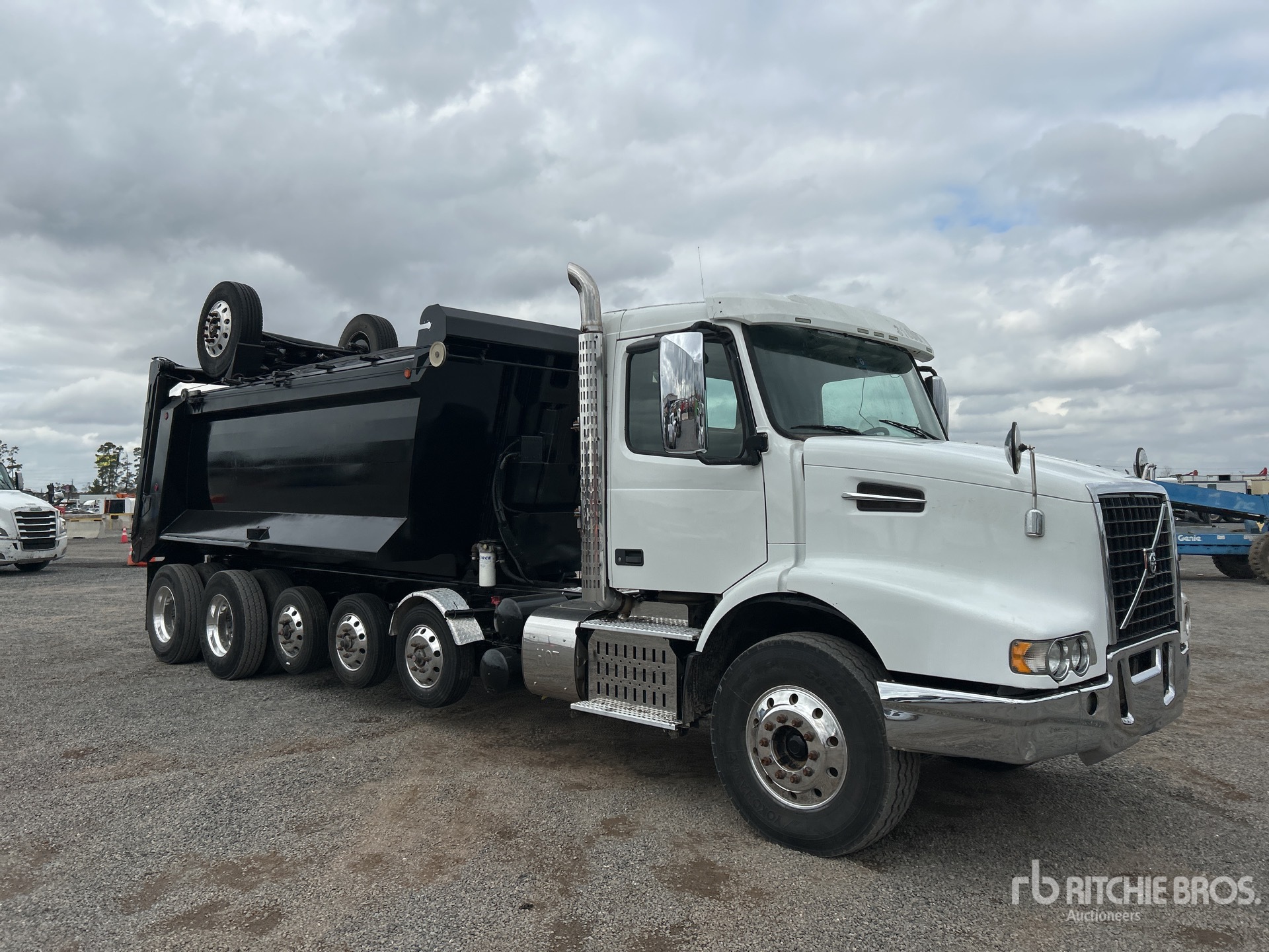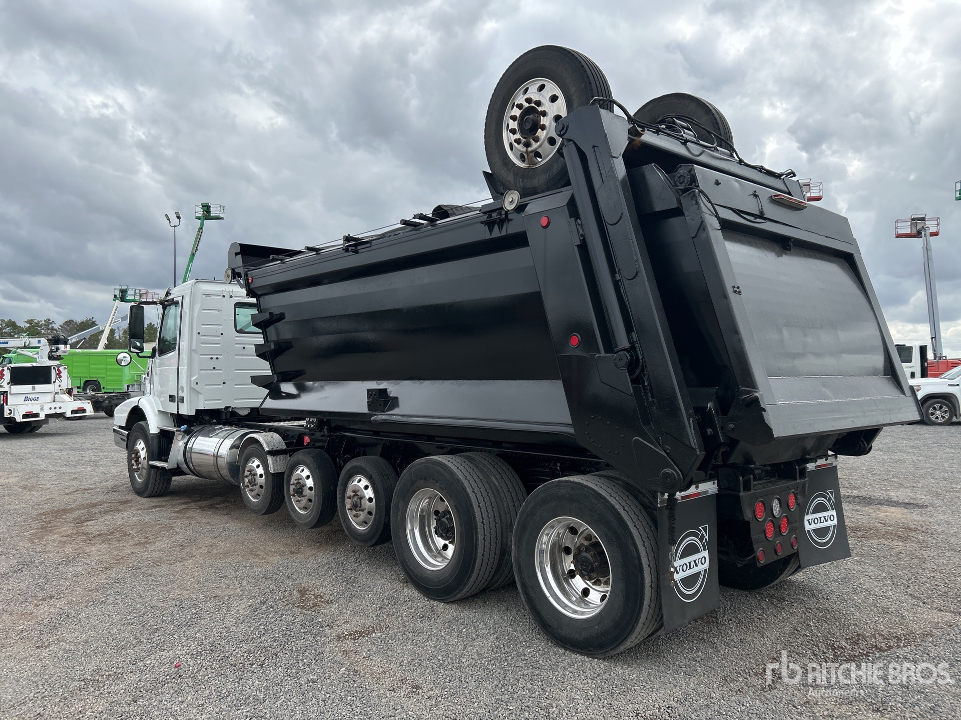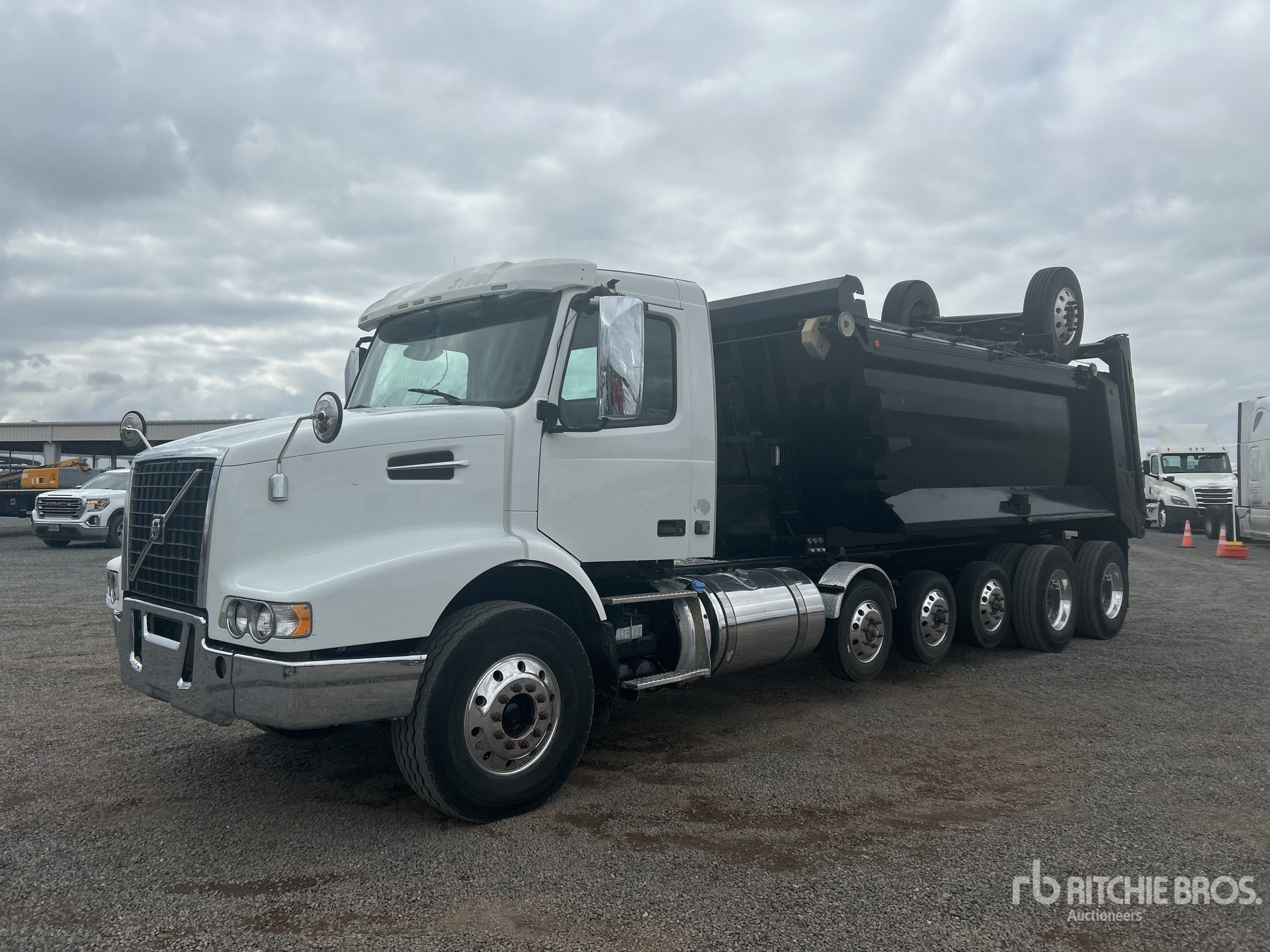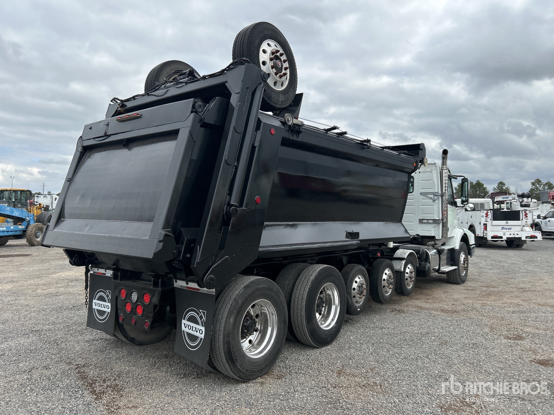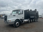 Volvo D13 6 Cylinder 12.8 L Diesel 425 hp Engine, Requires Diesel Exhaust Fluid, Automated Transmission, Differential Lock, 20000 lb Front Axle, 40000 lb Rears, 3.36:1 Axle Ratio, 53500 lb GVWR, Aluminum Wheels, 315/80R22.5 Front Tires, 11R22.5 Rear Tires, 3 Steerable Air Lift Pusher Axle, Trailing Tag Axle, Dual Steering Boxes, Volvo T-Ride Suspension, 279 in Wheelbase, PTO, 16 ft 1 in Long x 4 ft 7 in High Steel Body, Round Bottom, Electric Roll Tarp