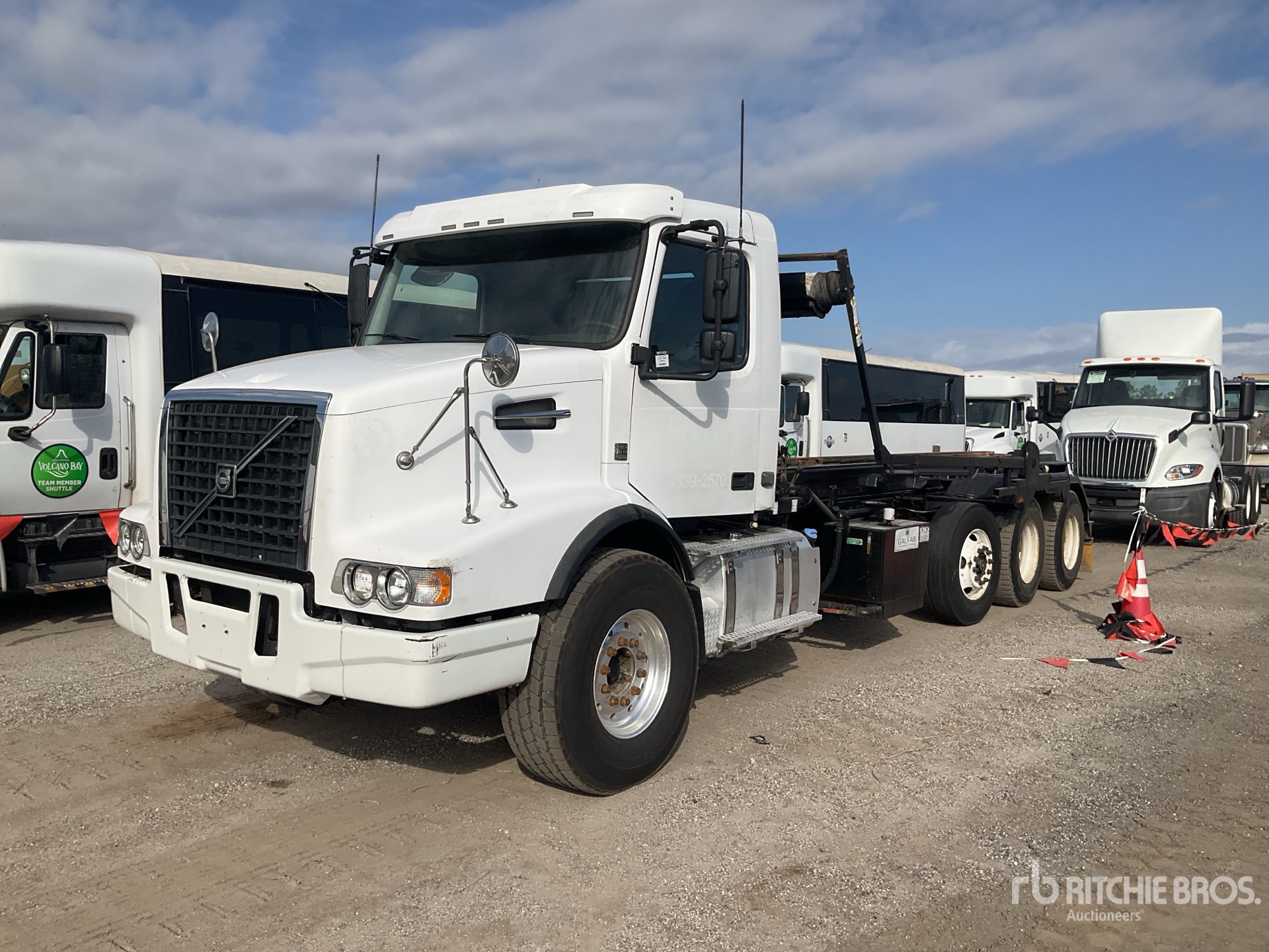 Volvo D13j405 6 Cylinder 12.8 L Diesel 405 hp Engine, 2015 US EPA Label, Requires Diesel Exhaust Fluid, Engine Brake, Automatic Transmission, Differential Lock, Air Ride Cab, Aluminum Front Wheels, 425/65R22.5 Front Tires, 11R22.5 Rear Tires, Air Lift Pusher Axle, Double Frame, Spring over Walking Beam Suspension, 270 in Wheelbase, PTO, Hydraulic System, 2016 Galfab N0R75194T121 Roll-Off Body, 24 ft 8 in Hoist