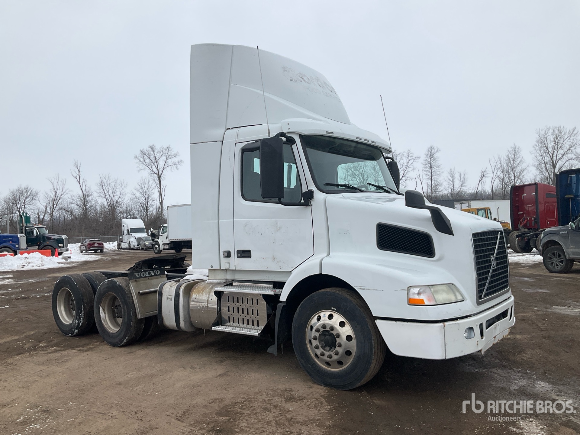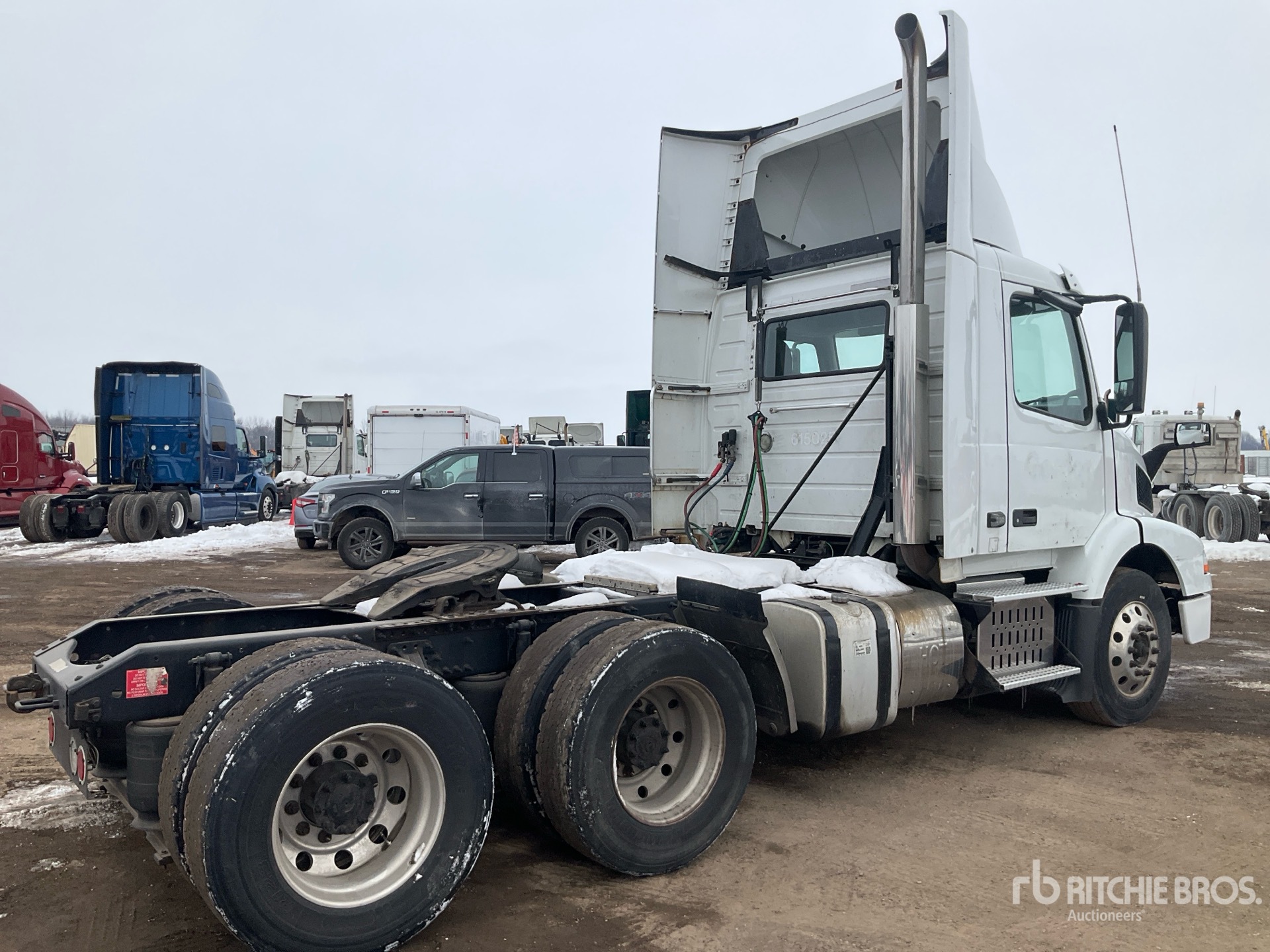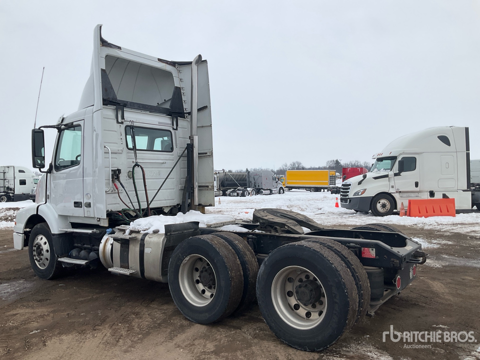 Located in Lane 16, Volvo D11J385 385 hp Engine, 2015 US EPA Label, 13157 Engine hrs, Eaton Fuller FR-14210B 10-Speed Manual Transmission, 13200 lb Front Axle, 40000 lb Rears, 53200 lb GVWR, Engine Brake, Differential Lock, 167 in Wheelbase, Air Suspension, Aluminum Wheels, 275/80R22.5, Dual Fuel Tanks