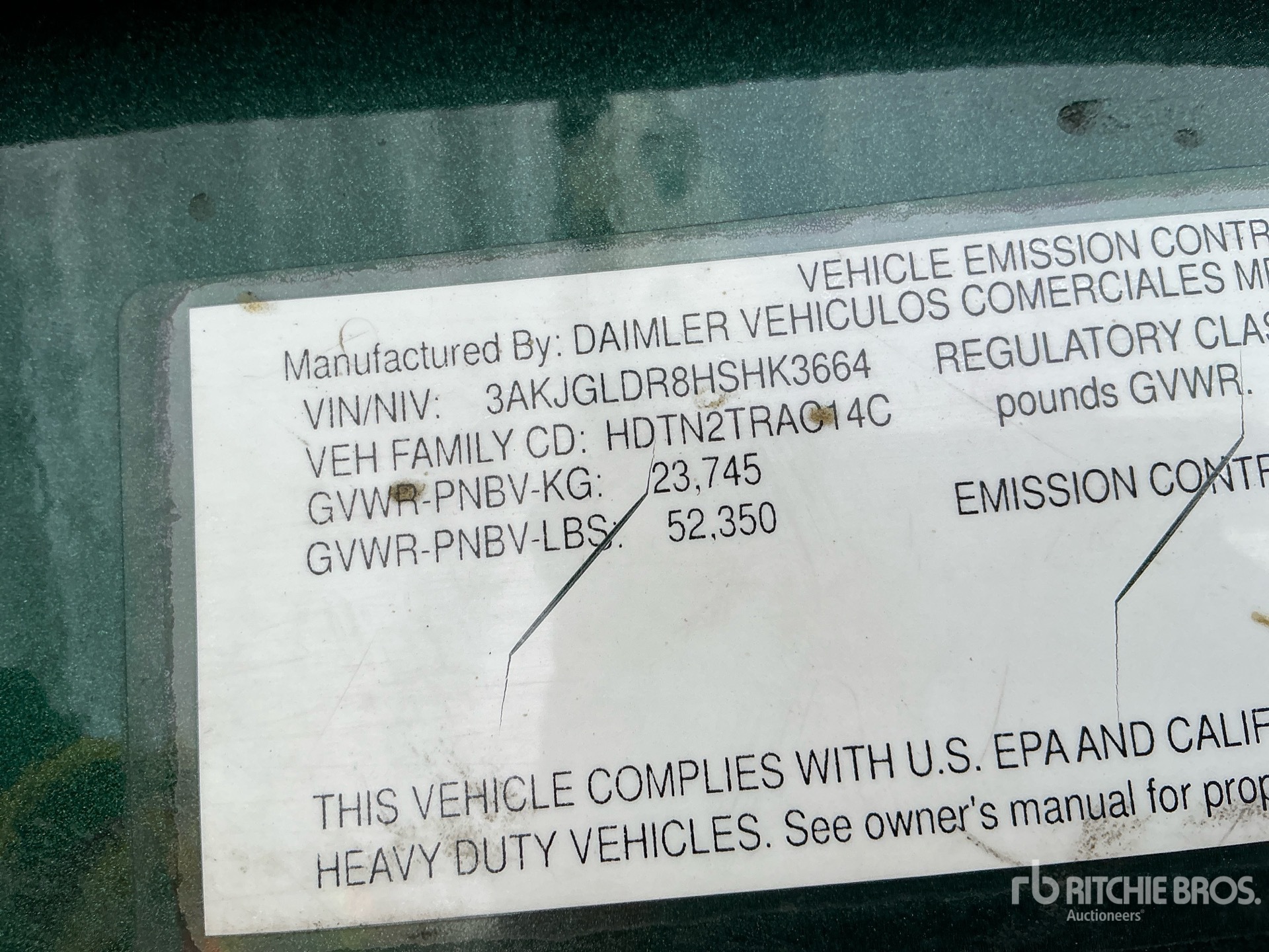 The detailed equipment information is limited in scope, and Ritchie Bros. Auctioneers has not inspected any aspects or components of the equipment other than those expressly set forth herein. Unless expressly stated, we make no representations or warranties, express or implied, concerning the equipment or its components, including without limitation any representations or warranties concerning functionality, conformity or compliance with any safety standard or requirement of any applicable authority or regulatory body, fitness for any particular purpose, or merchantability. You are strongly advised to perform your own detailed inspection of the equipment prior to bidding.