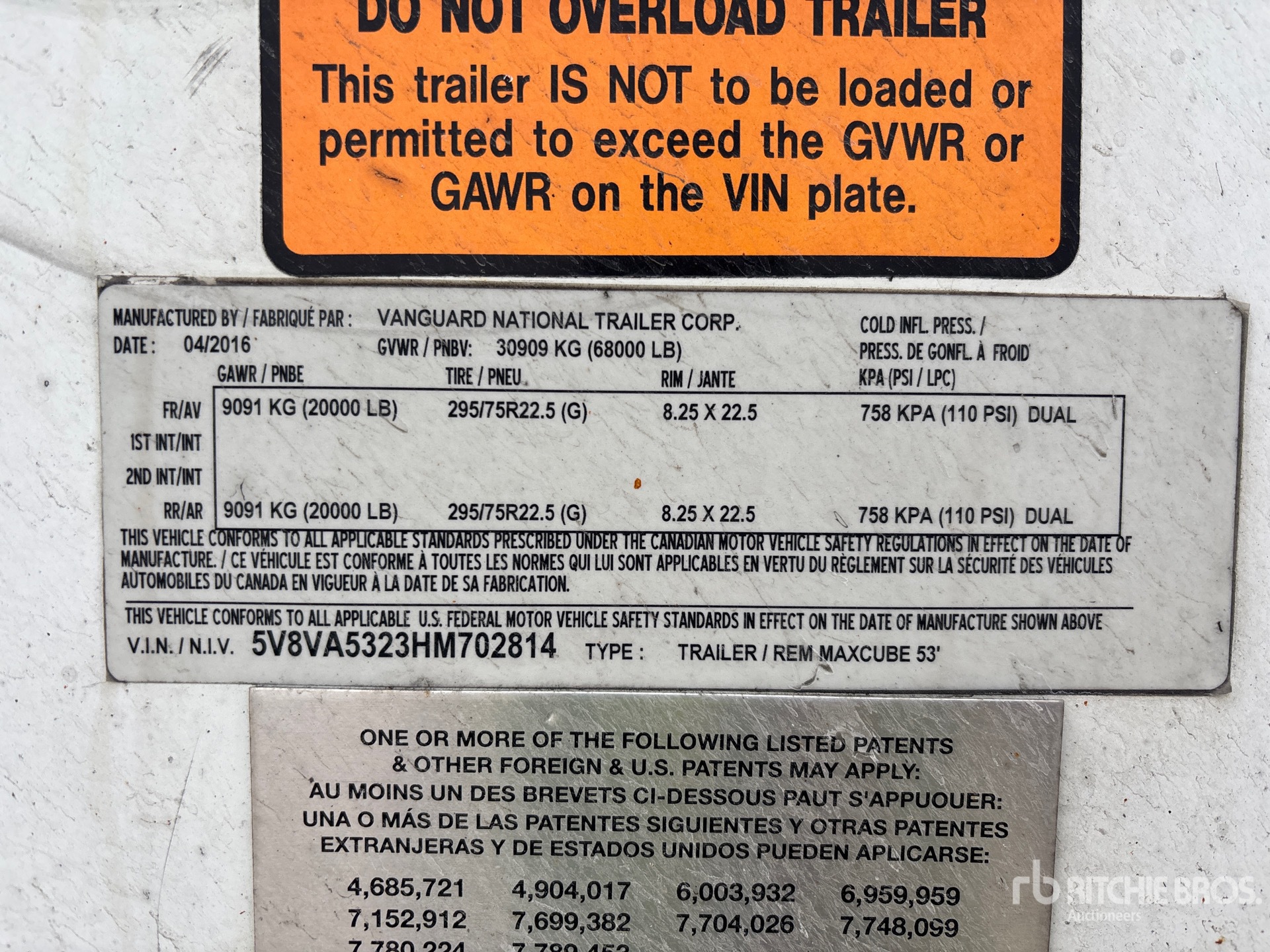 Air Ride Sliding Suspension, Hardwood Floor, Swing Door, 295/75R22.5 Tires 68000 lb GVWR