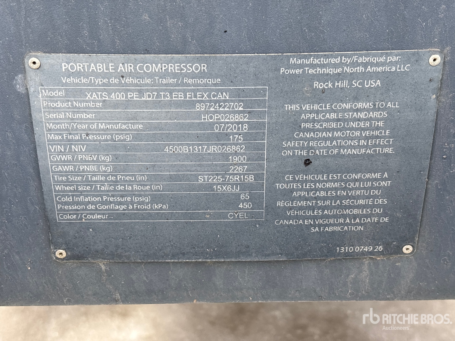 175 psi Working Pressure, 2017 US EPA Label, John Deere 4045HF285C 4 Cylinder 104 kW 4.5 L Diesel Engine, Lunette Ring Carrier Trailer