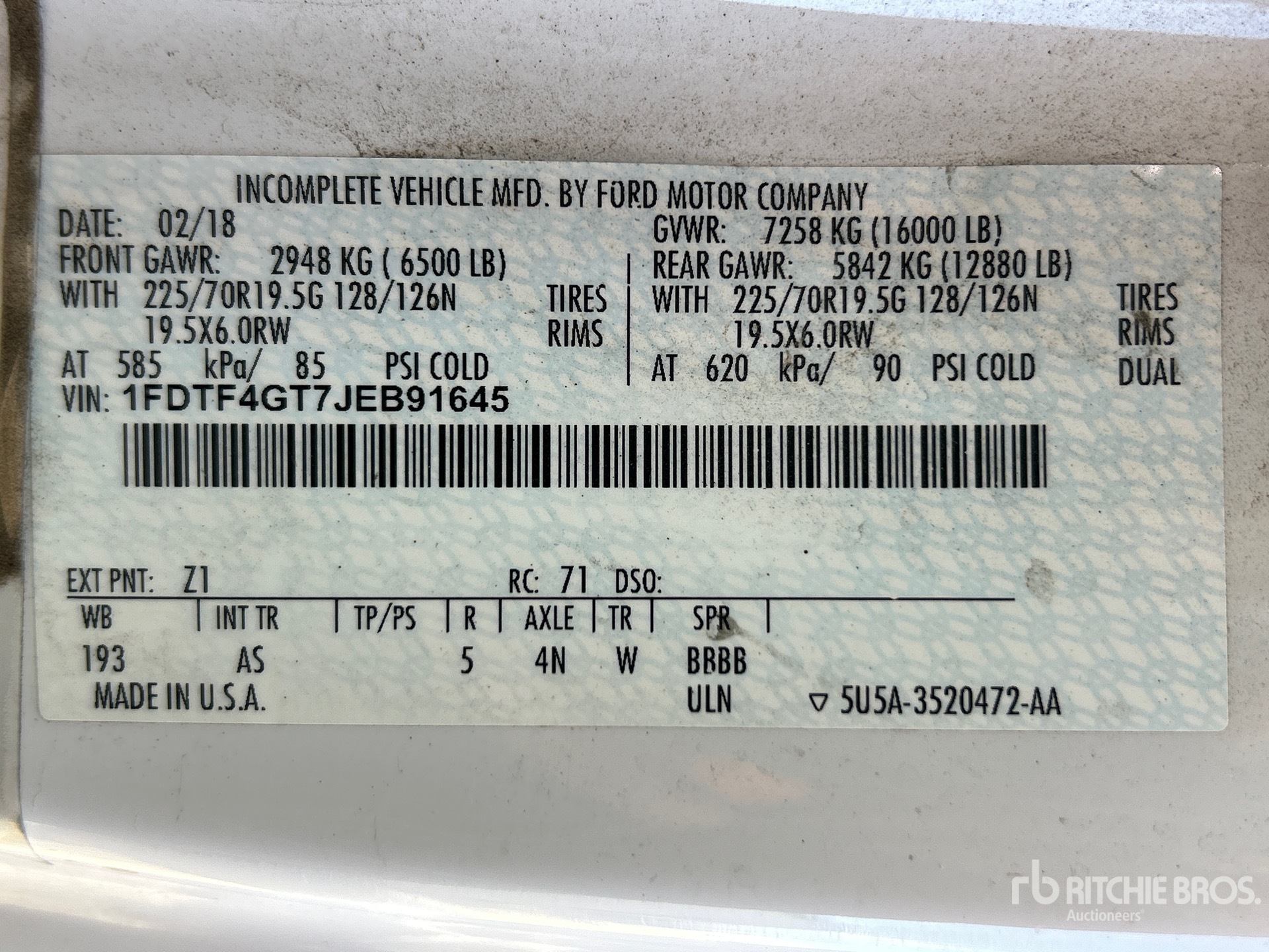 Ford Power Stroke V8 6.7 L Diesel 440 hp Engine, 2018 US EPA Label, Requires Diesel Exhaust Fluid, 14389 Engine hrs, Exhaust Brake, Automatic Transmission, 6500 lb Front Axle, 12880 lb Rears, 16000 lb GVWR, 225/70R19.5, Spring Suspension, 193 in Wheelbase, Pintle Hitch