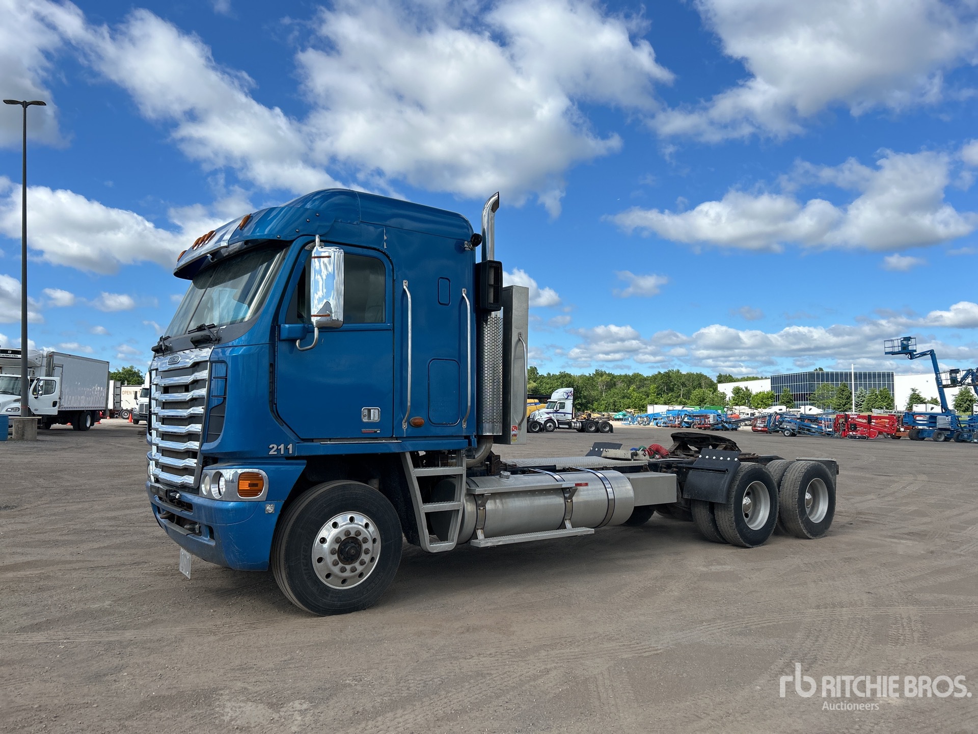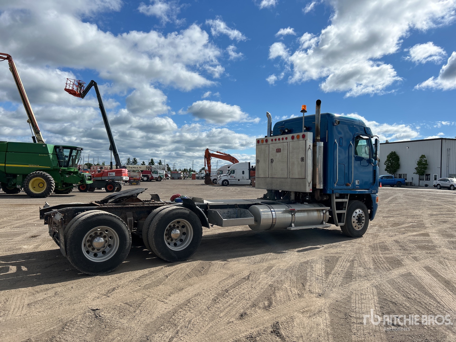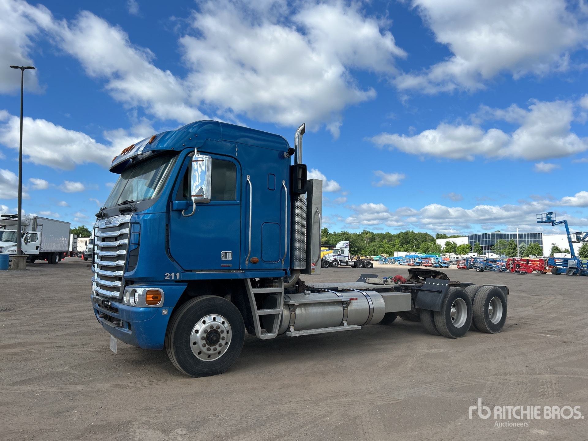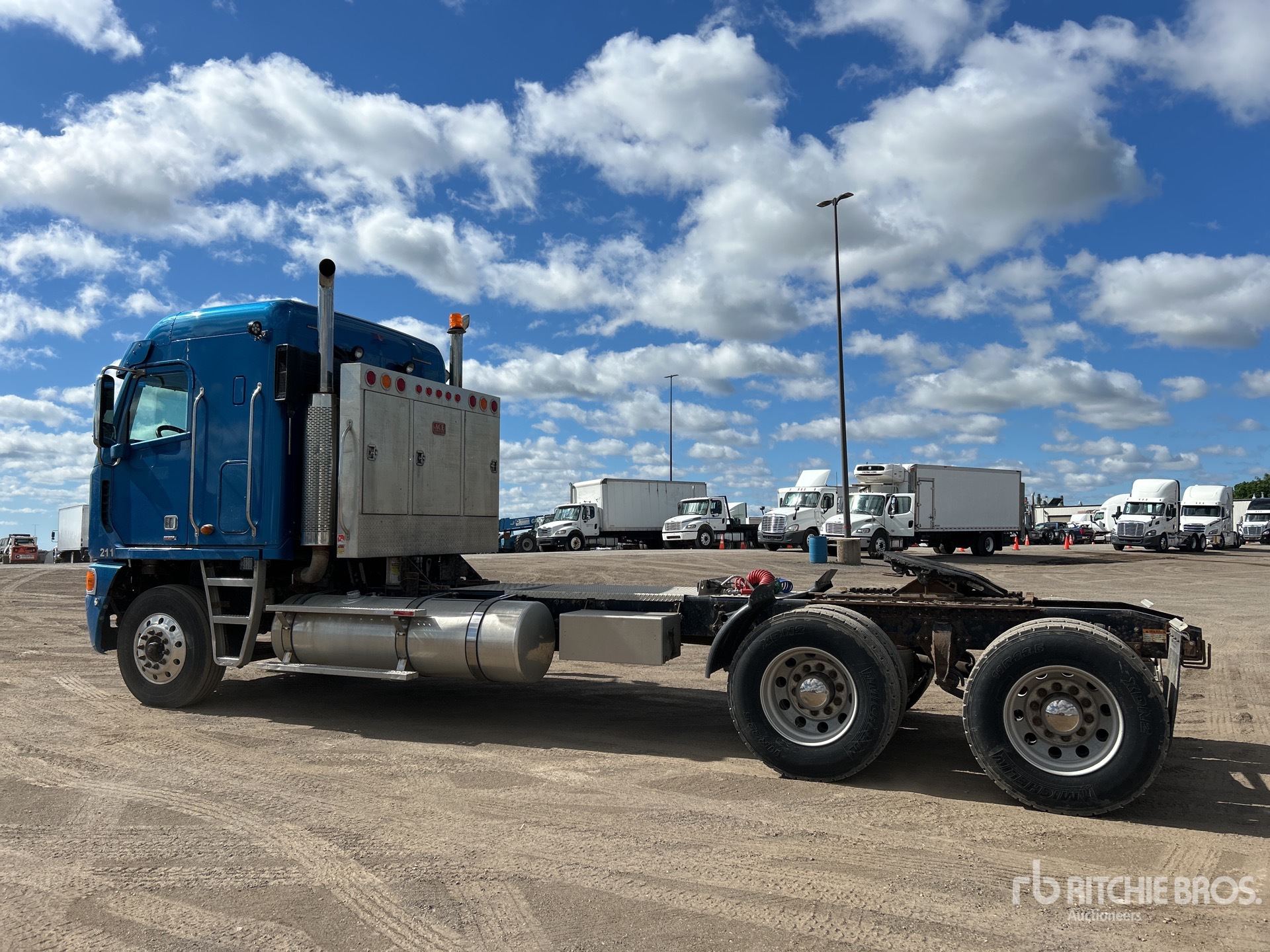 Detroit Series 60 6 Cylinder Diesel Engine, Eberspacher Engine Coolant Heater, 14959 Engine hrs, Engine Brake, Eaton Fuller 18-Speed Transmission, Double Differential Locks, 16000 lb Front Axle, 44000 lb Rears, 60000 lb GVWR, Air Ride Cab, 34 in Flat Top Sleeper Cab, Aluminum Wheels, 11R22.5, Airliner Air Ride Suspension, 245 in Wheelbase, Headache Rack, Dual Fuel Tanks