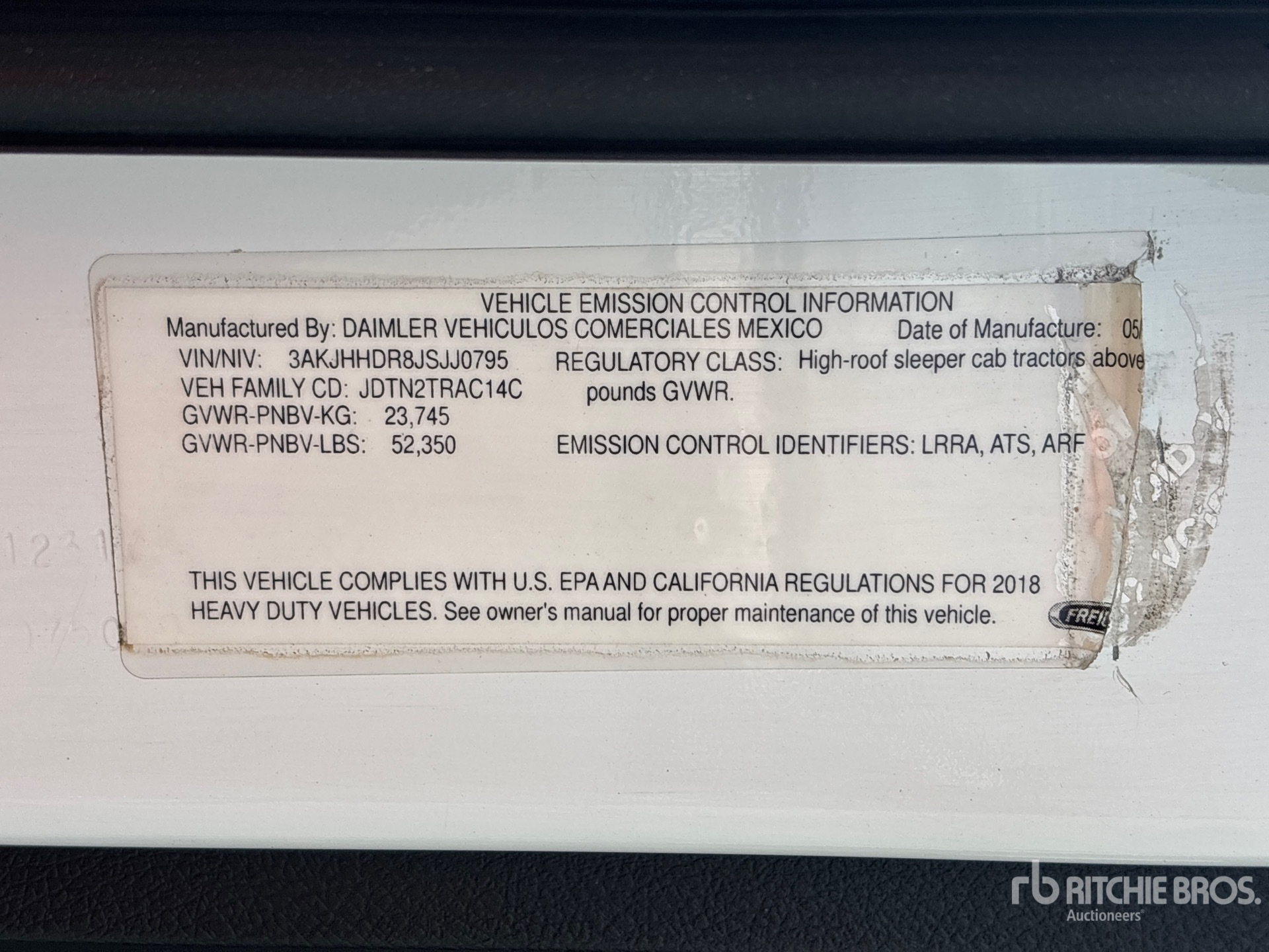 The detailed equipment information is limited in scope, and Ritchie Bros. Auctioneers has not inspected any aspects or components of the equipment other than those expressly set forth herein. Unless expressly stated, we make no representations or warranties, express or implied, concerning the equipment or its components, including without limitation any representations or warranties concerning functionality, conformity or compliance with any safety standard or requirement of any applicable authority or regulatory body, fitness for any particular purpose, or merchantability. You are strongly advised to perform your own detailed inspection of the equipment prior to bidding.