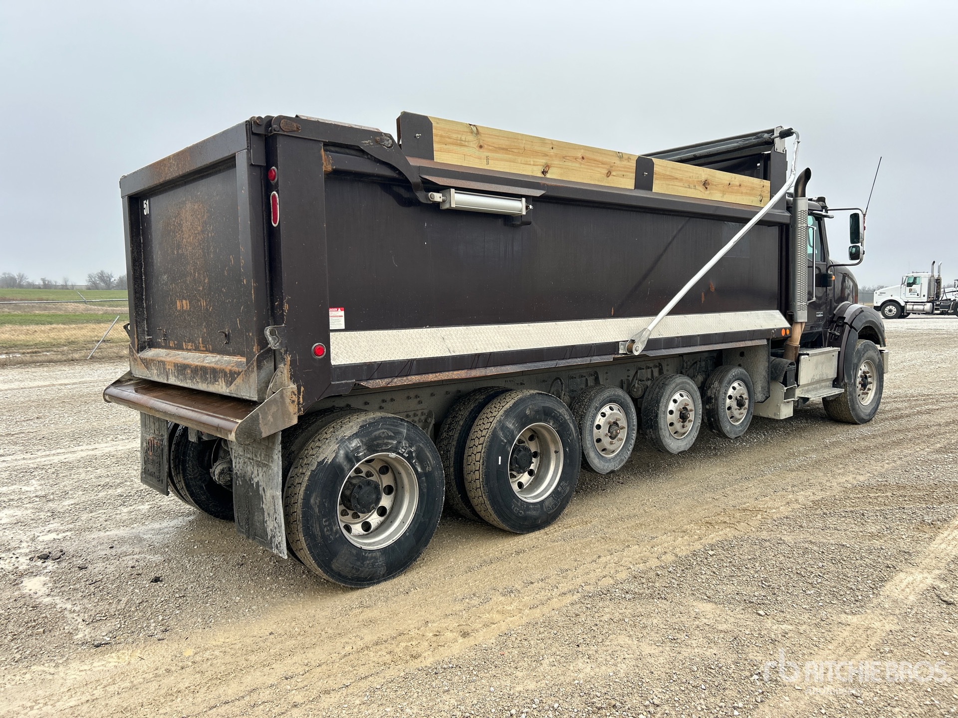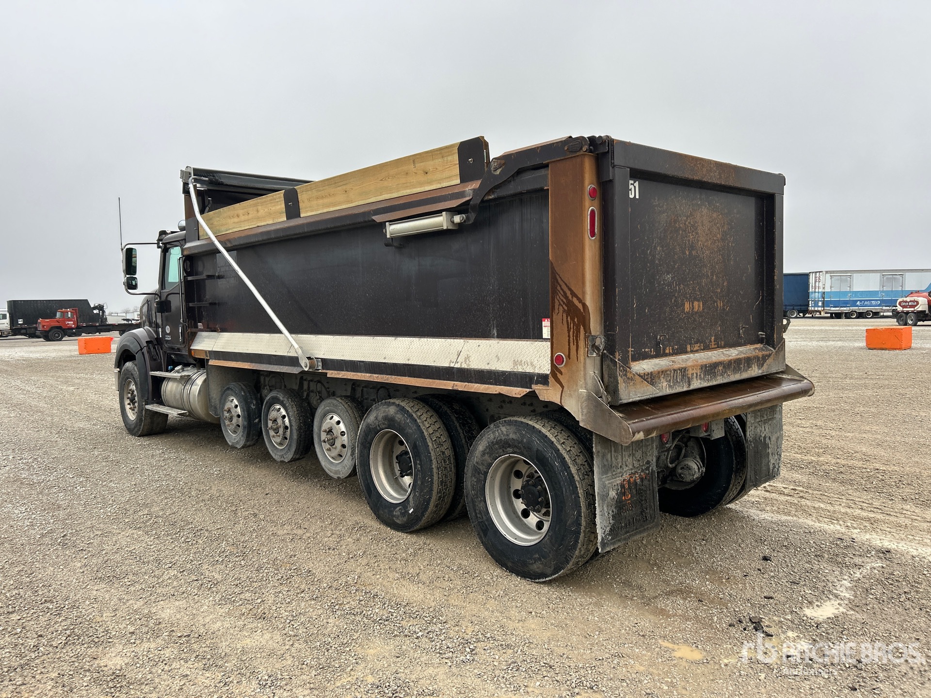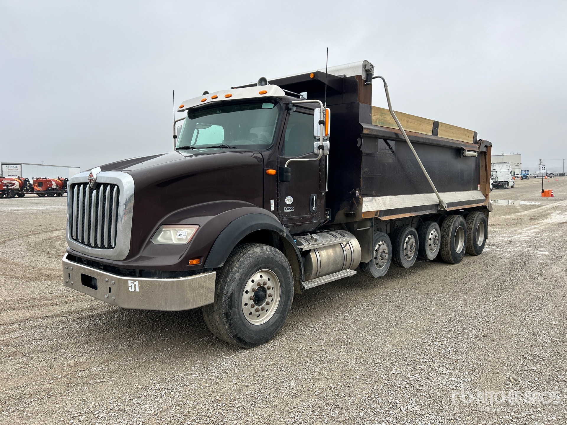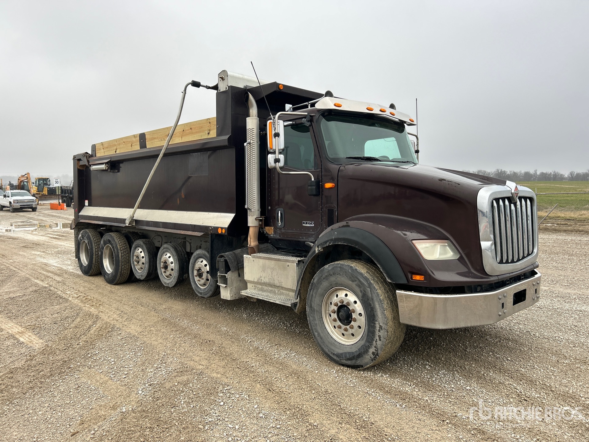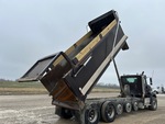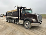 International N13 6 Cylinder Diesel Engine, 10971 Engine hrs, Engine Brake, Allison Automatic Transmission, 20000 lb Front Axle, 70000 lb Rears, 66000 lb GVWR, Aluminum Wheels, 425/65R22.5 Front Tires, 11R22.5 Rear Tires, Central Tire Inflation System, 3 Air Lift Pusher Axles, Dual Steering Boxes, Hendrickson Haulmaax Suspension, 272 in Wheelbase, Wet Kit, 20 ft Long x 0 ft 54 in High Body, Round Bottom, Electric Roll Tarp, High-Lift Tailgate