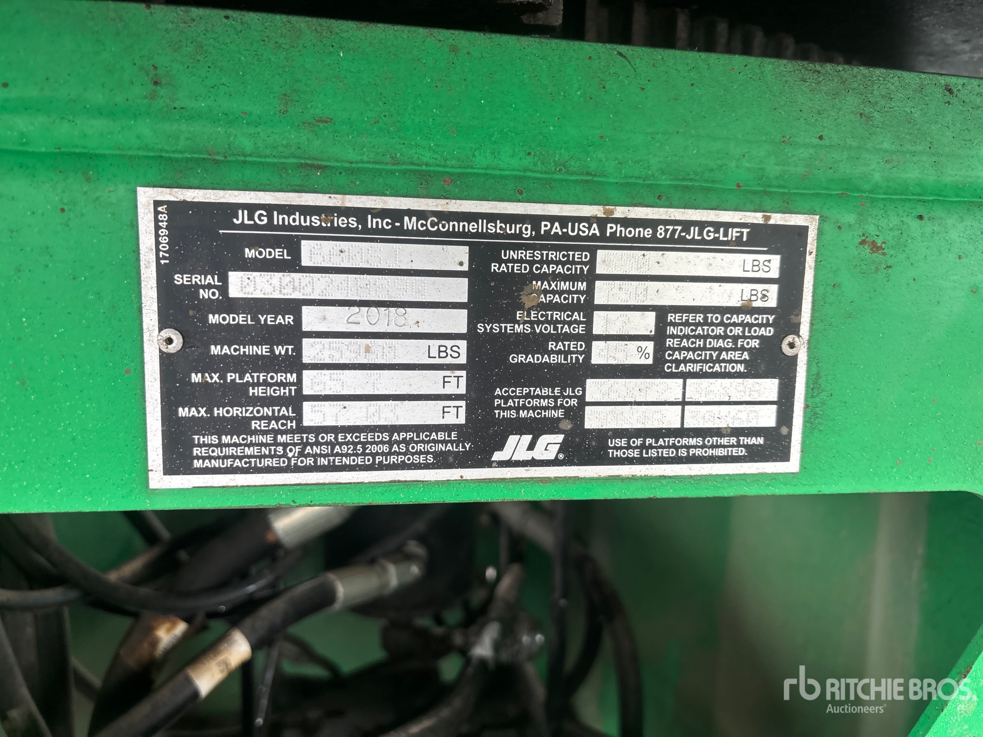 65.7 ft Max Platform Height, 750 lb Max Weight Capacity, Jib, Power to Platform, 4 Cylinder Dual Fuel Engine, 355/55D625 Foam-Filled Tires