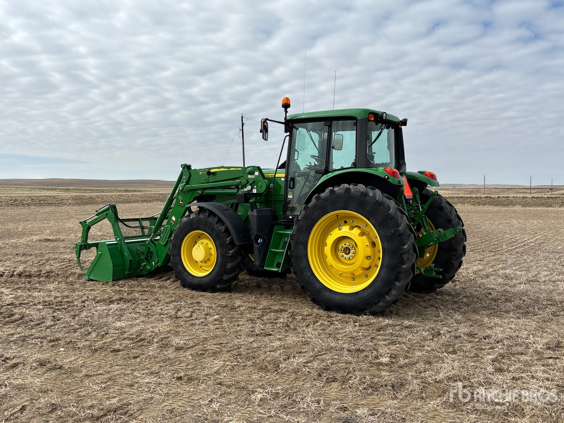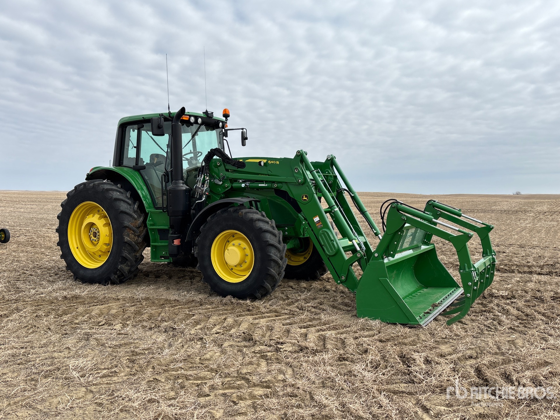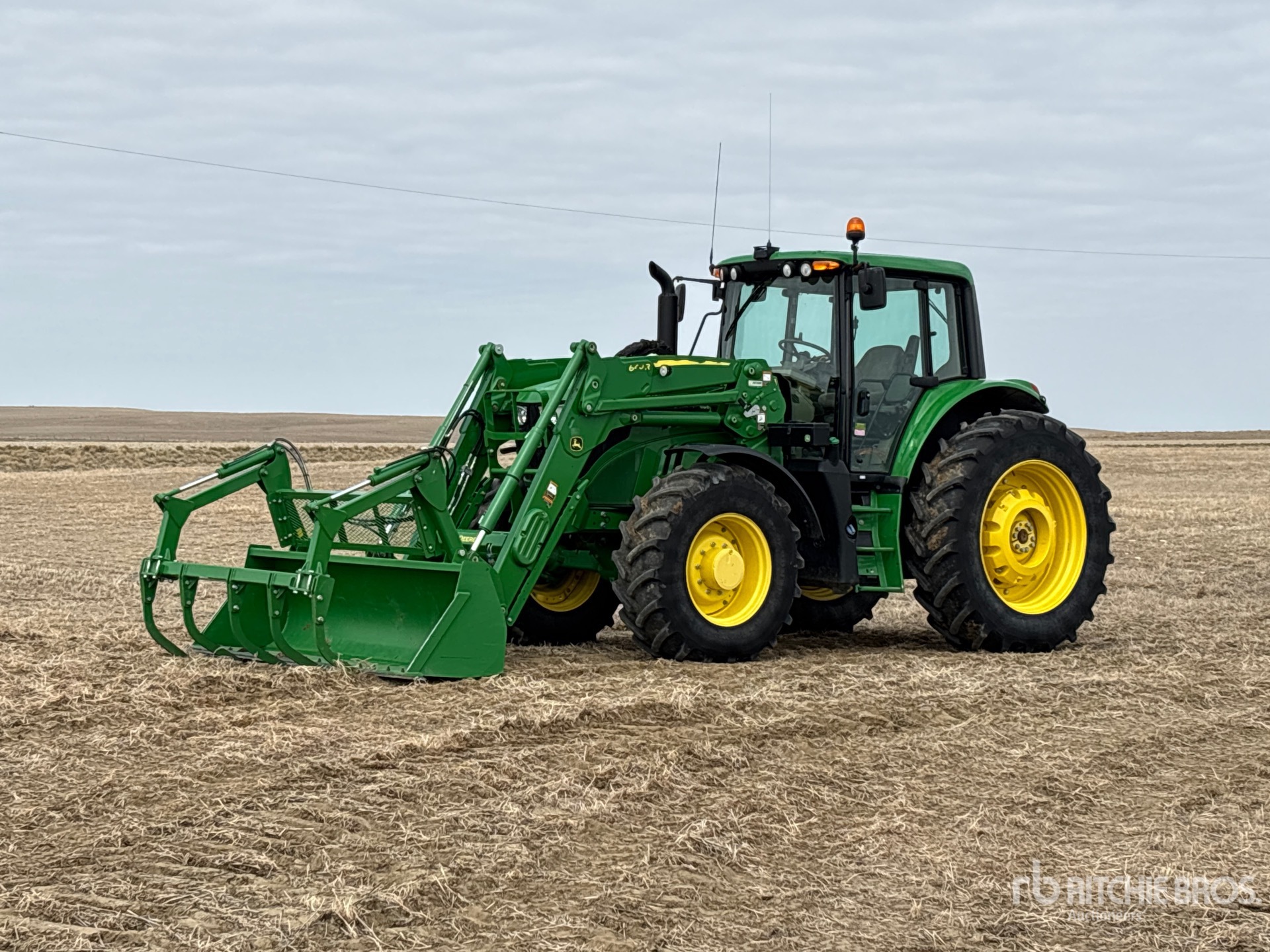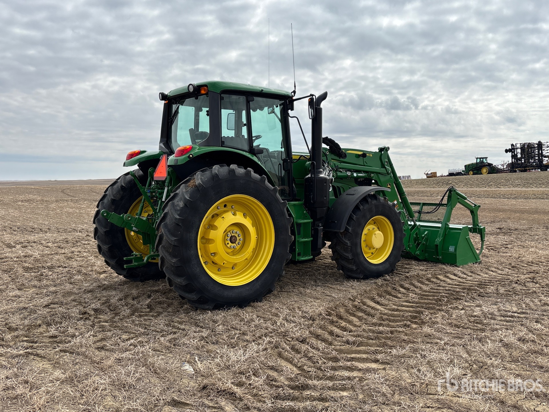 Enclosed Cab, Air Ride Seat, Differential Lock, 24 Forward, PowrQuad, Left Hand Reverser, John Deere 640R Loader w/Joystick, 96 in Grapple Bucket, 3 Rear Remotes, 1000 PTO, 3-Point Hitch, 420/85R28 Front Tires, 460/85R42 Rear Tires, Rear Wheel Weights