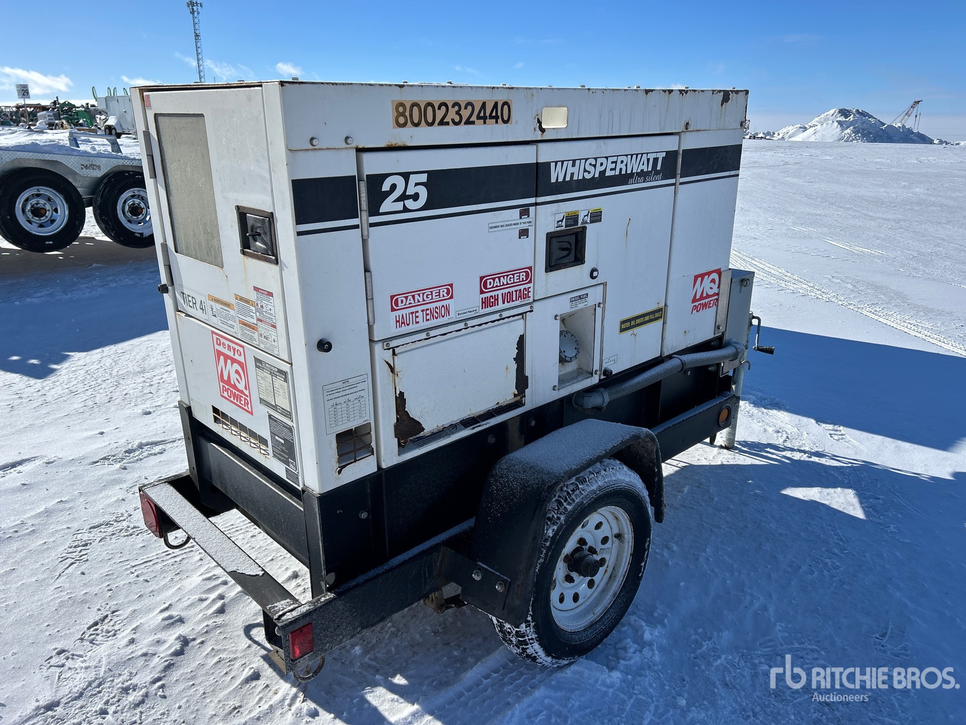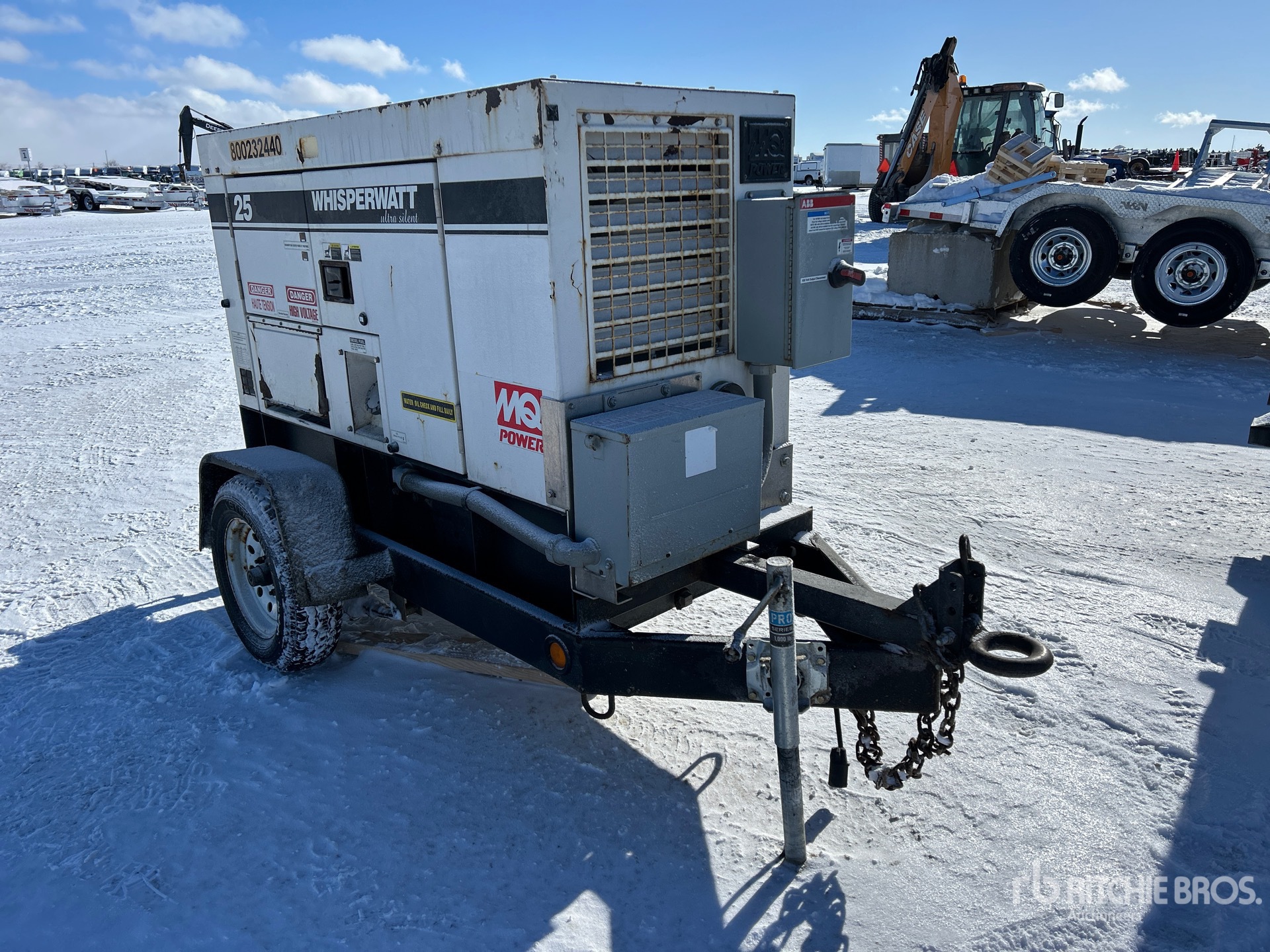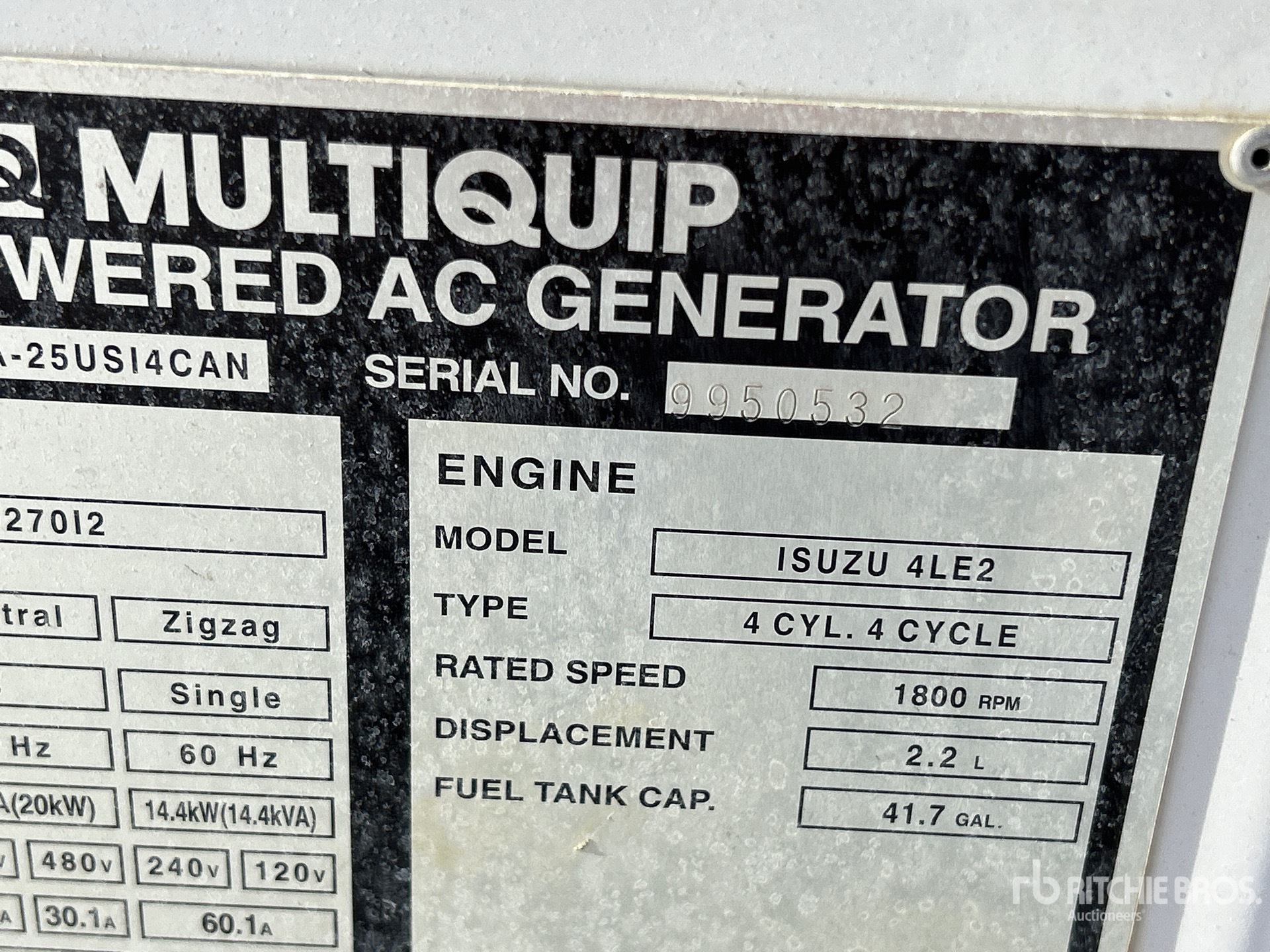 2018 US EPA Label, Isuzu 4 Cylinder 25.6 kW 2.17 L Diesel Engine, 25 kVA/20 kW Rated 3 Phase Output, 240 V / 480 V Rated Voltage, 14.4 kVA,/14.4 kW, Rated Single Phase Output, 120 V / 240 V Rated Voltage, 240 V & 120 V Receptacles, Bottom Mounted Fuel Tank, Lunette Ring Carrier Trailer