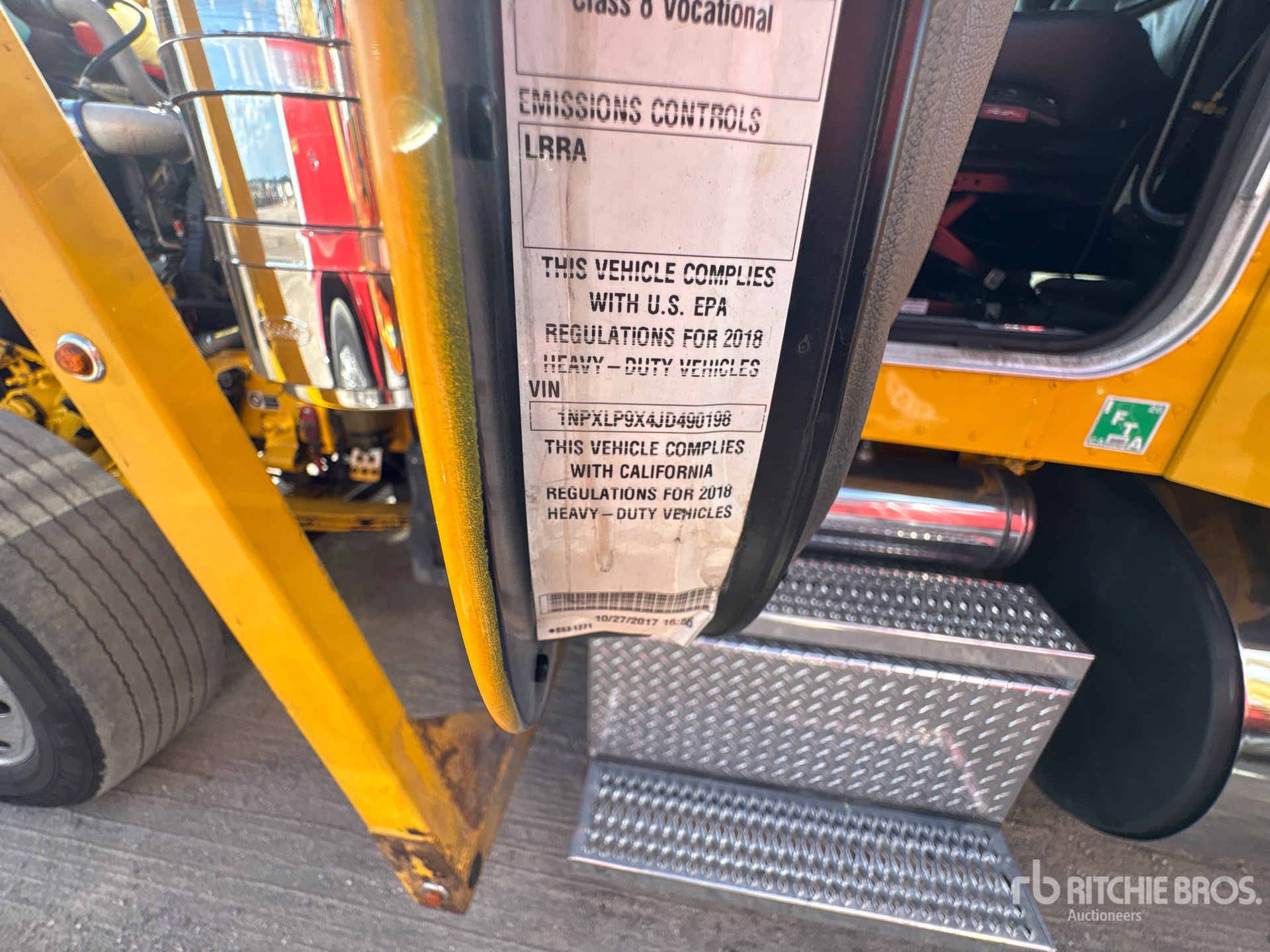 Paccar 6 Cylinder 15 L Diesel 510 hp Engine, 2016 US EPA Label, Requires Diesel Exhaust Fluid, 1312.9 Engine hrs, Engine Brake, Eaton Fuller 13-Speed Manual Transmission, 13200 lb Front Axle, 40000 lb Rears, Paccar Drive Axles, 40000 lb GVWR, Air Ride Cab, 36 in Flat Top Sleeper Cab, Aluminum Wheels, 295/75R22.5 Front Tires, 255/70R19.5 Rear Tires, Air Ride Suspension, 260 in Wheelbase, PTO, 10 Vehicle Capacity, Hydraulic Lift, Soft Tie Downs