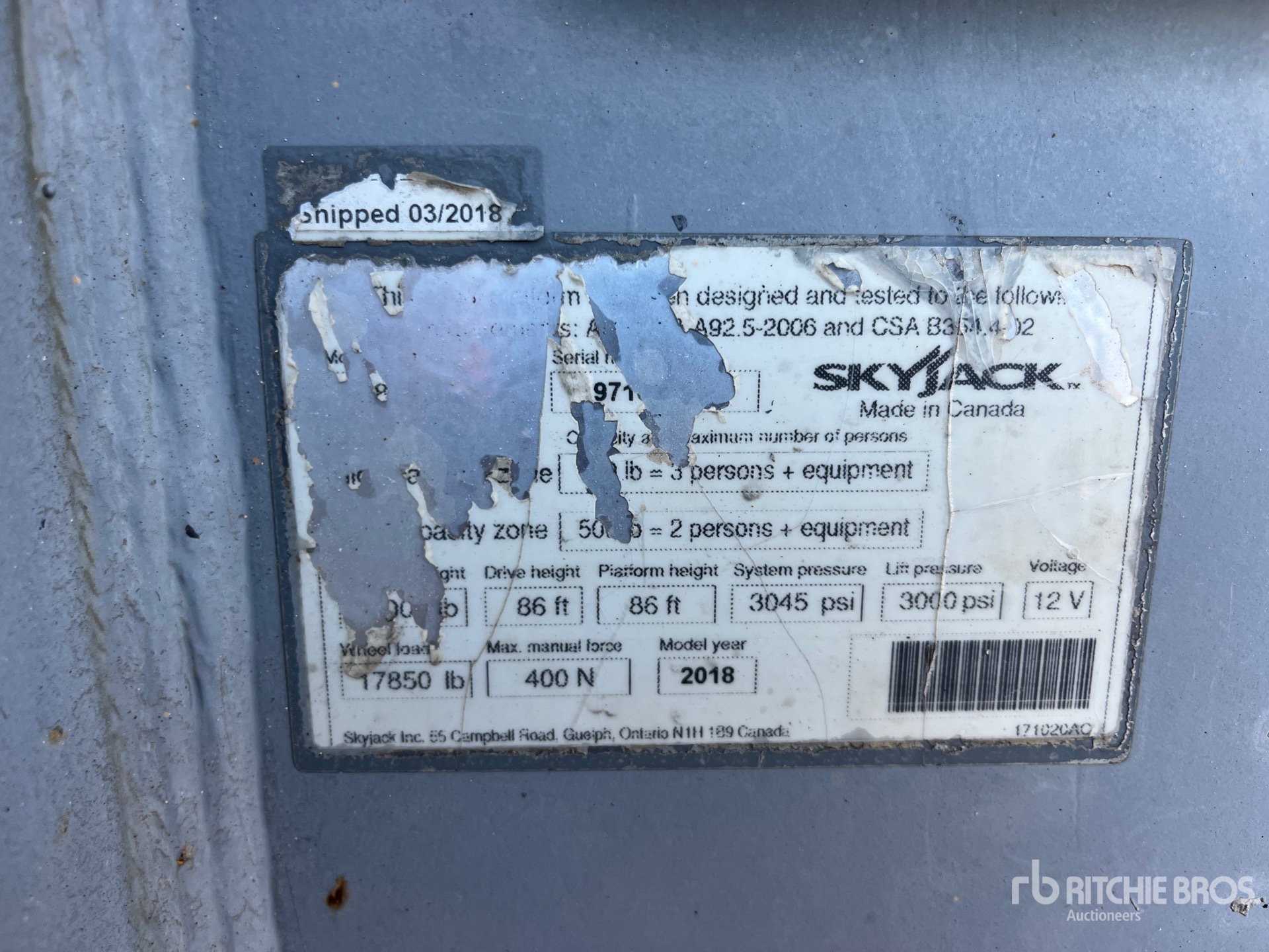 The detailed equipment information is limited in scope, and Ritchie Bros. Auctioneers has not inspected any aspects or components of the equipment other than those expressly set forth herein. Unless expressly stated, we make no representations or warranties, express or implied, concerning the equipment or its components, including without limitation any representations or warranties concerning functionality, conformity or compliance with any safety standard or requirement of any applicable authority or regulatory body, fitness for any particular purpose, or merchantability. You are strongly advised to perform your own detailed inspection of the equipment prior to bidding.