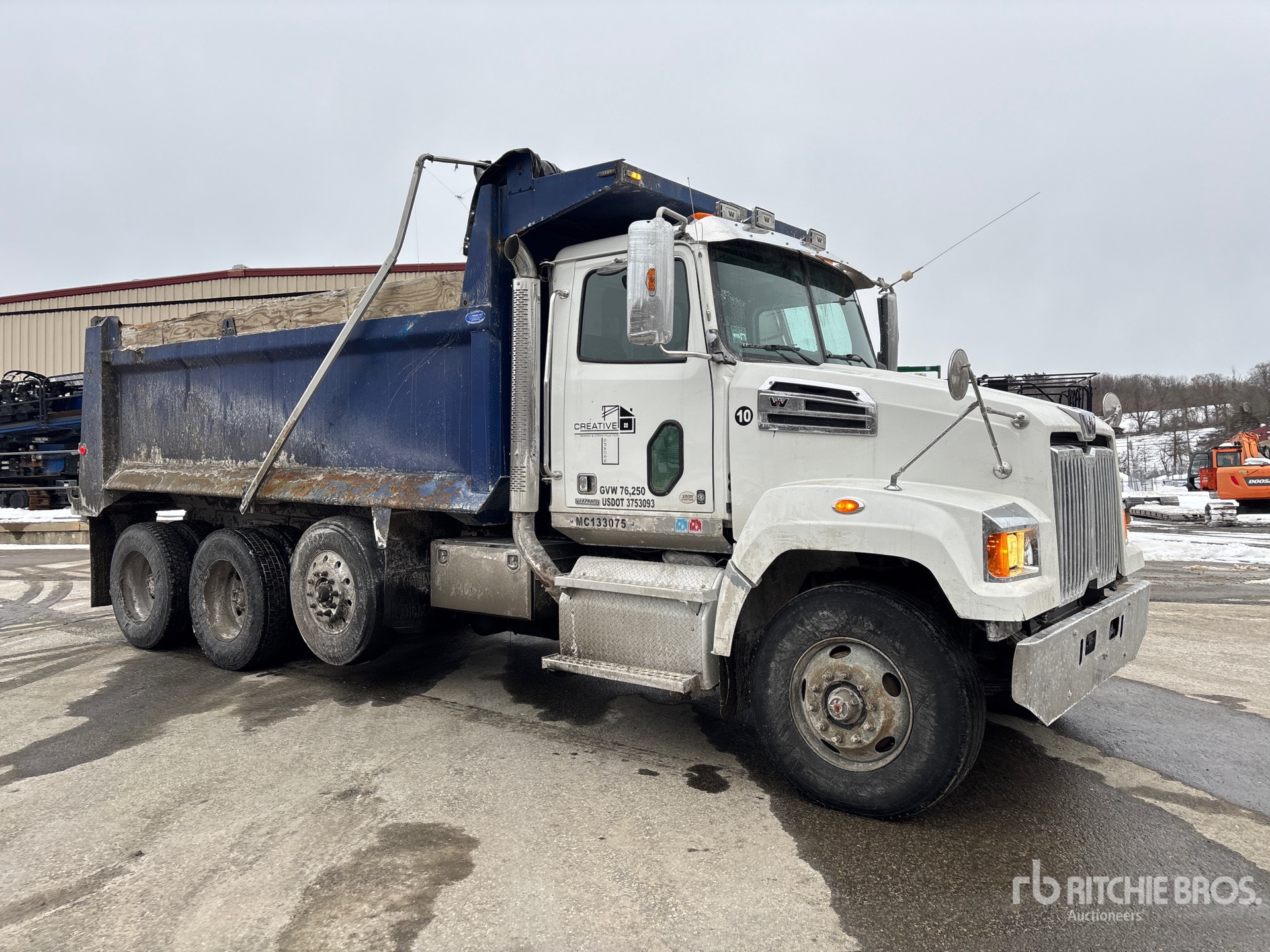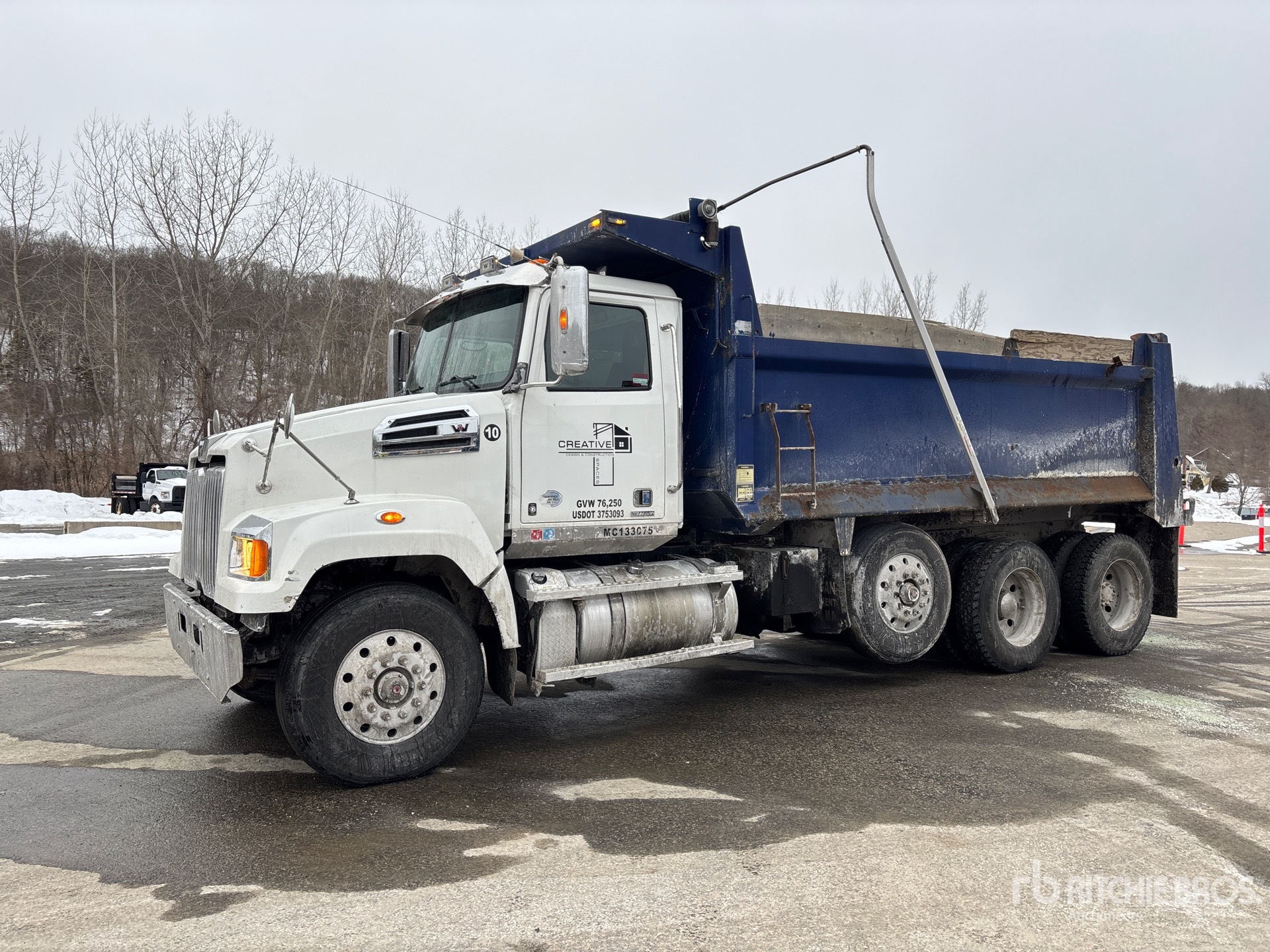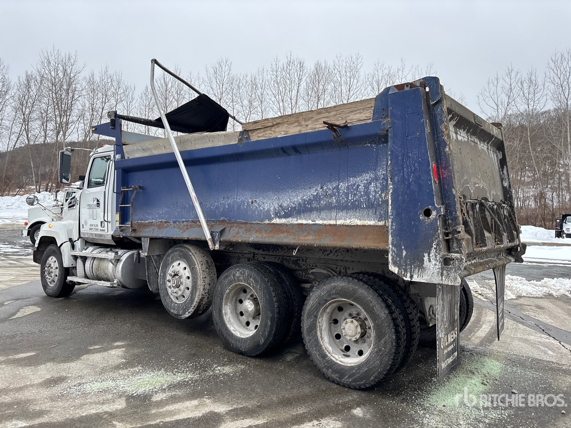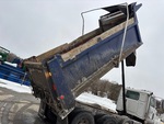 Detroit DD13 6 Cylinder 12.8 L Diesel 470 hp Engine, Requires Diesel Exhaust Fluid, 53946 Engine hrs, Engine Brake, Exhaust Brake, Allison 4700 7-Speed Automatic Transmission, Differential Lock, 20000 lb Front Axle, 46000 lb Rears, Meritor RT-46-160 Drive Axles, 4.30:1 Axle Ratio, 86000 lb GVWR, Air Ride Cab, Aluminum Wheels, 315/80R22.5 Front Tires, 11R24.5 Rear Tires, Steerable Air Lift Pusher Axle, Dual Steering Boxes, Double Frame, TufTrac Spring Suspension, 232 in Wheelbase, PTO, Bibeau 17 ft Long x 4 ft High Steel Body, Electric Roll Tarp, Triple Tailgate Chutes, Pintle Hitch