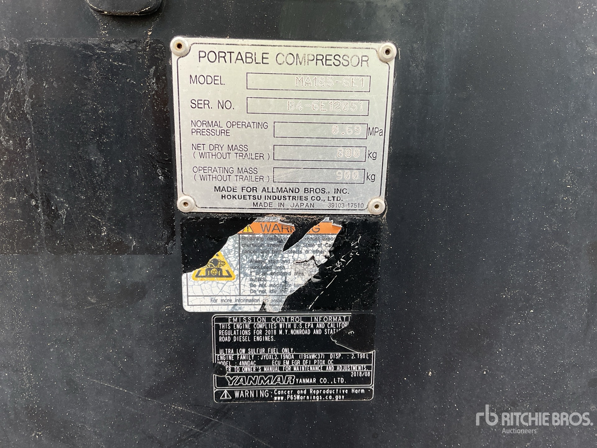 185 psi Working Pressure, 2018 US EPA Label, Yanmar 4NNDAC 4 Cylinder 2.19 L Diesel Engine, S/A Trailer, Ball Hitch