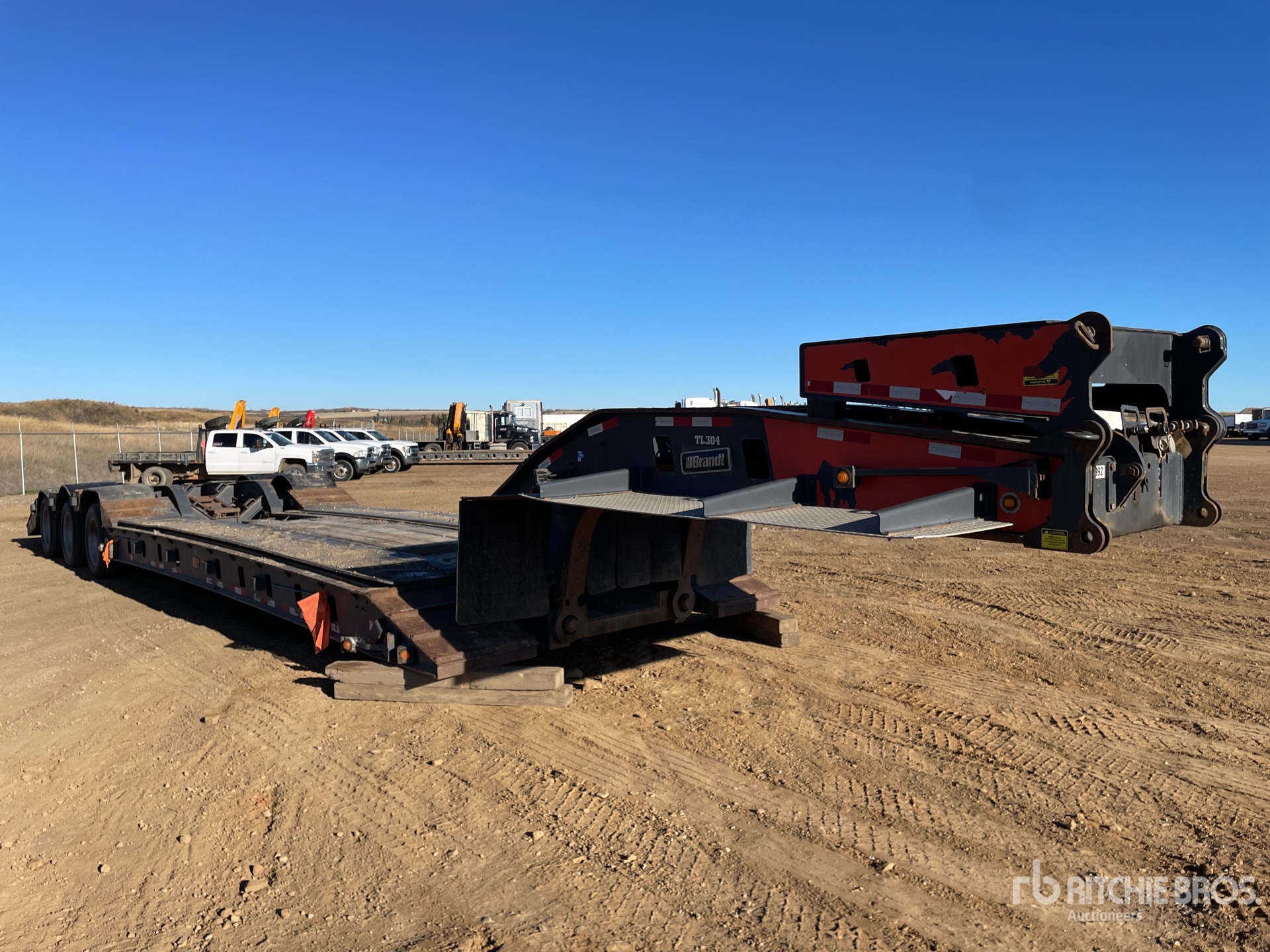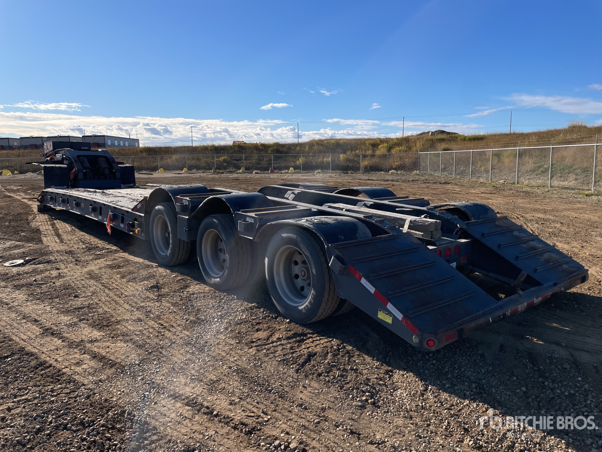 Air Ride Suspension, Hydraulic Removable Gooseneck, Flip-Up Neck Extension, Plumbed for Booster Axle, 24 ft Main Deck, 4 ft Fixed Dovetail, 120 in Usable Deck Width, Honda Gas Powered Self Contained Hydraulic System, Aluminum Wheels, 275/70R22.5 Tires, 63500 kg GVWR