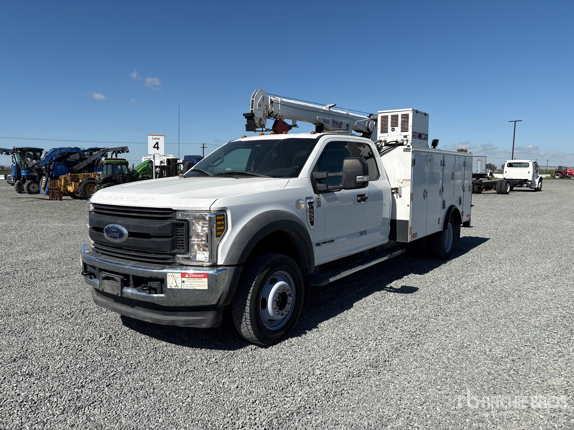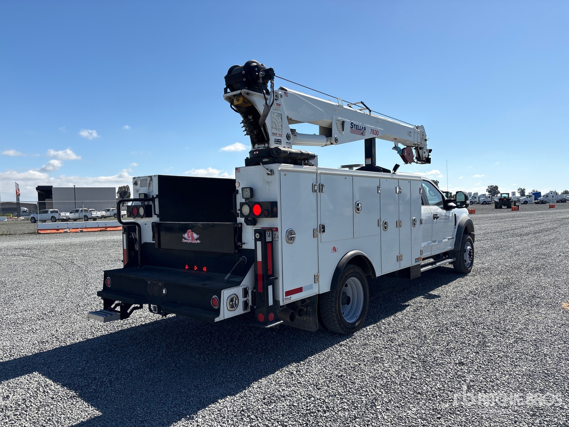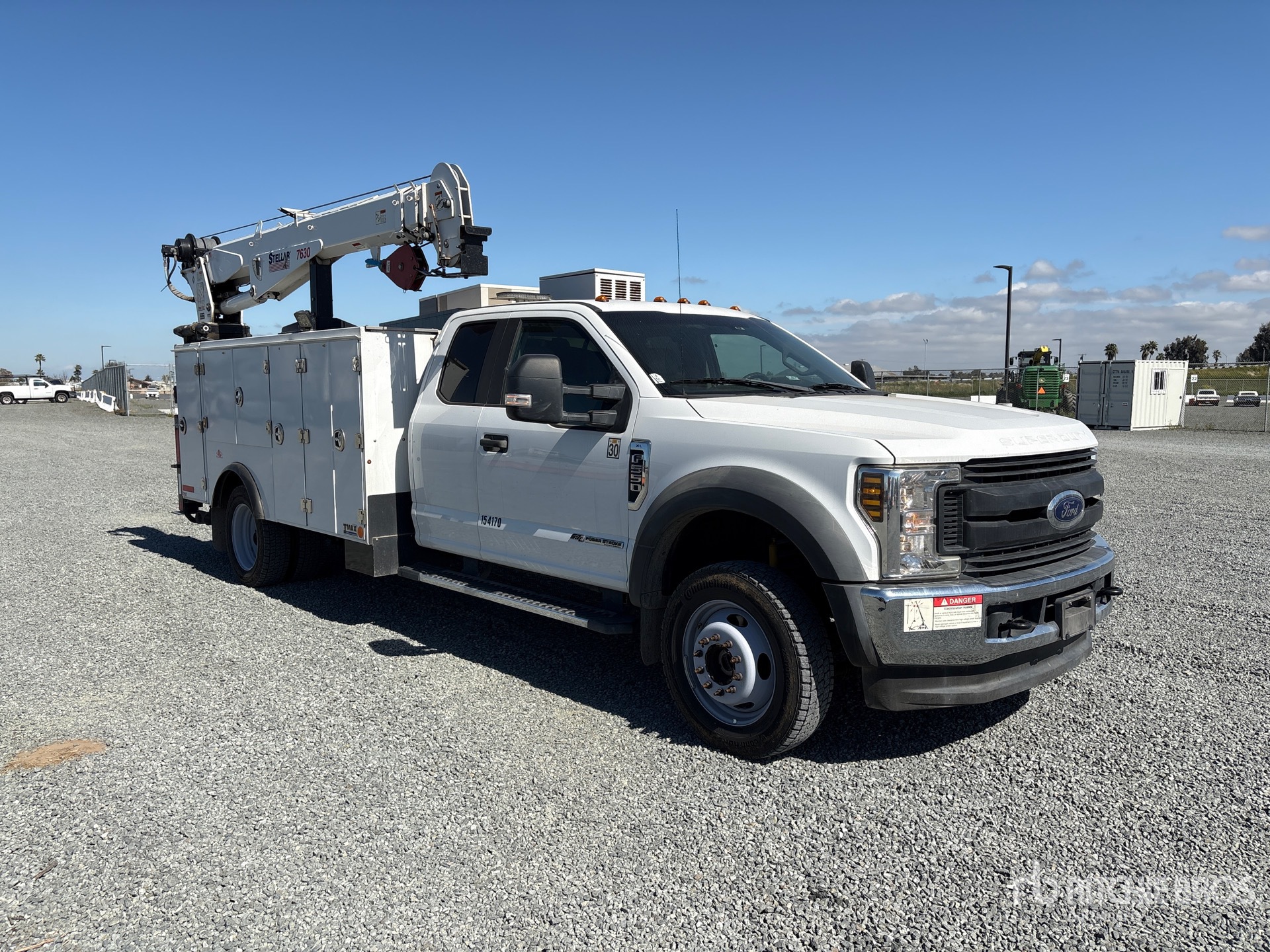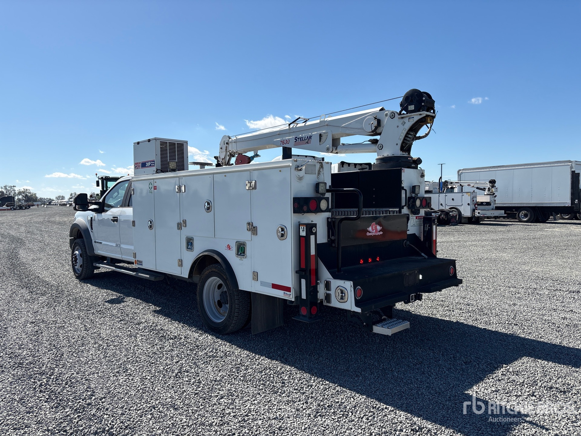 Ford 4V- F Series V8 6.7 L Diesel 330 hp Engine, 2019 US EPA Label, Requires Diesel Exhaust Fluid, Automatic Transmission, 7000 lb Front Axle, 14706 lb Rears, 19500 lb GVWR, 225/70R19.5, Spring Suspension, 194 in Wheelbase, Stellar TMAX1-11AL 13 ft 8 in Body, Stellar 7630 7500 lb Hydraulic Crane, Wireless Remote Control, American Eagle 30P Piston Series Air Compressor, Air Hose Reel, Equipment-from-a-Primoris-Services-Corp-company