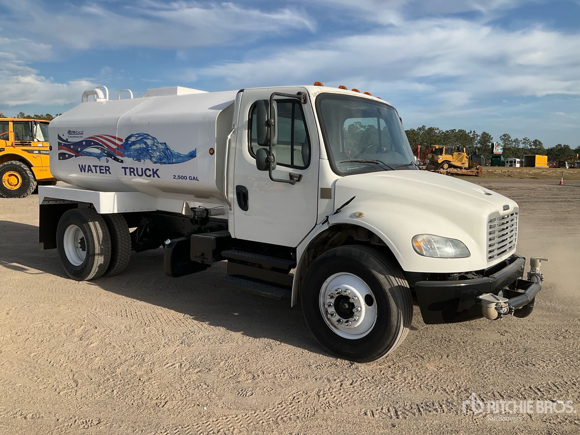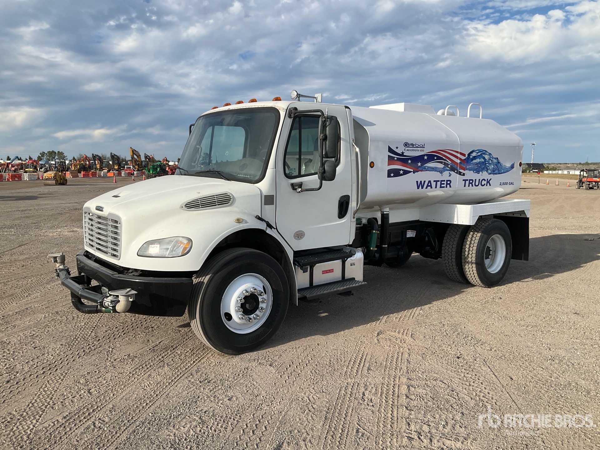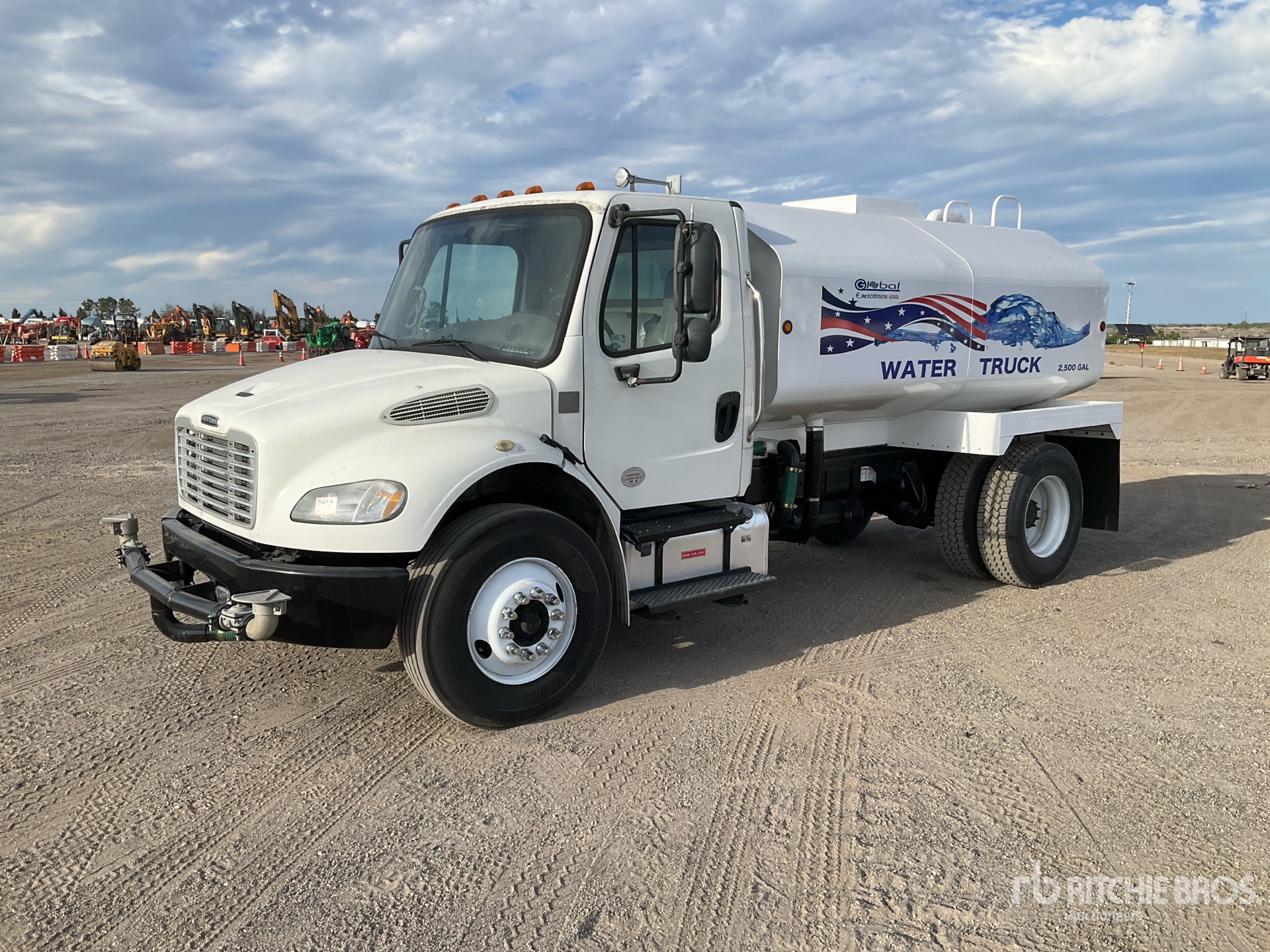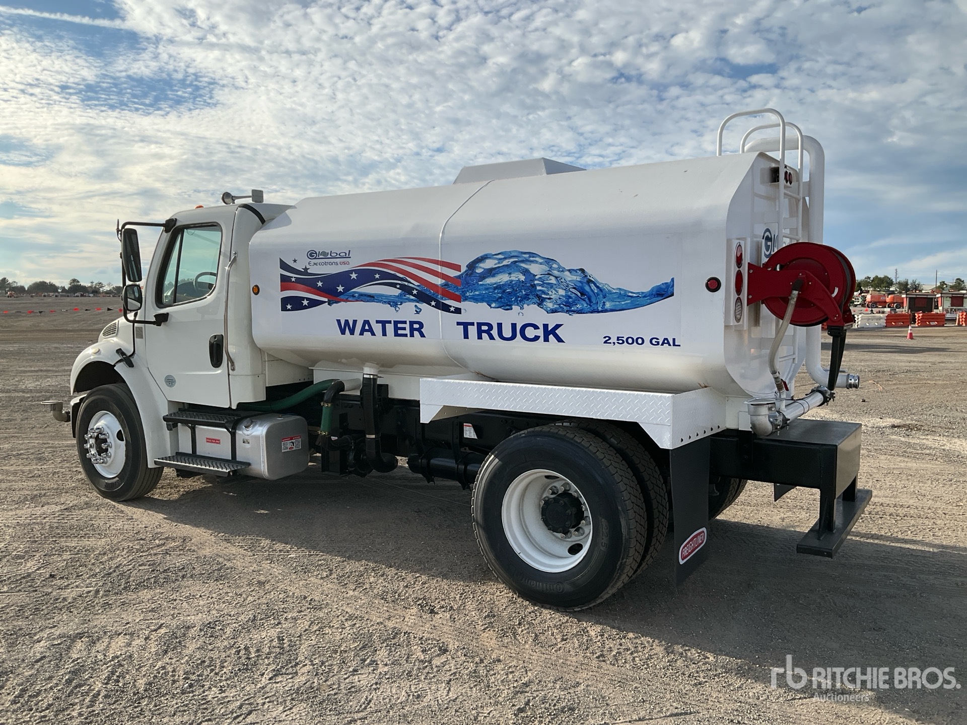Cummins B6.7 6 Cylinder 6.7 L Diesel 220 hp Engine, 2019 US EPA Label, Requires Diesel Exhaust Fluid, 8258 Engine hrs, 6-Speed Automatic Transmission, 10000 lb Front Axle, 19000 lb Rears, 26000 lb GVWR, 11R22.5, Air Ride Suspension, 170 in Wheelbase, PTO, Global Excotrans USA 2500 gal Steel Tank, 6 ft 7 in, Spray Bar, Hose Reel, Front Spray, Rear Spray, Side Spray